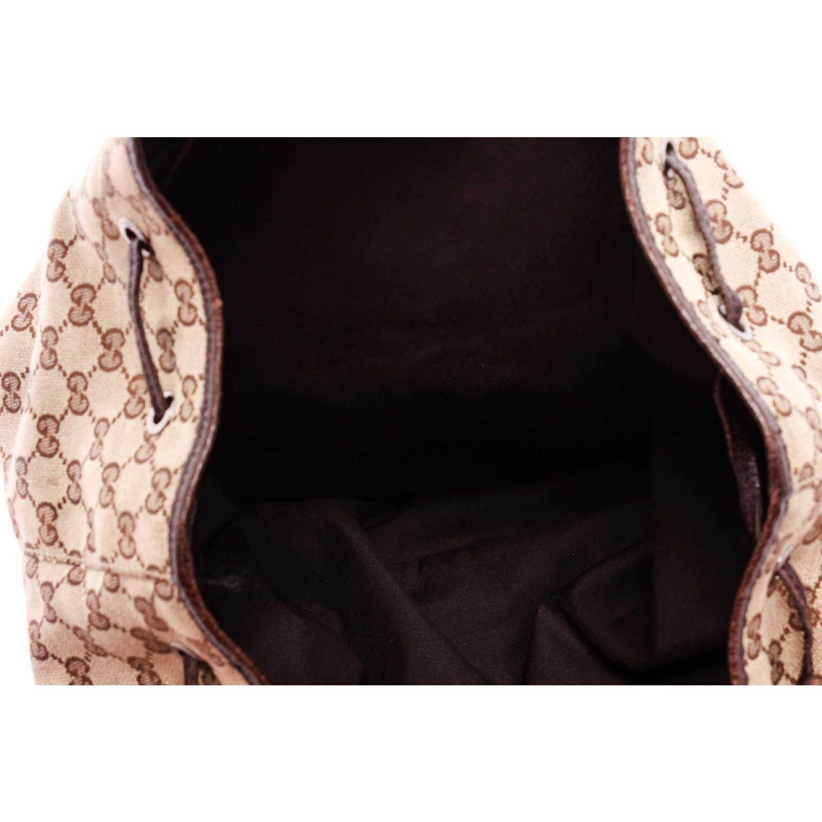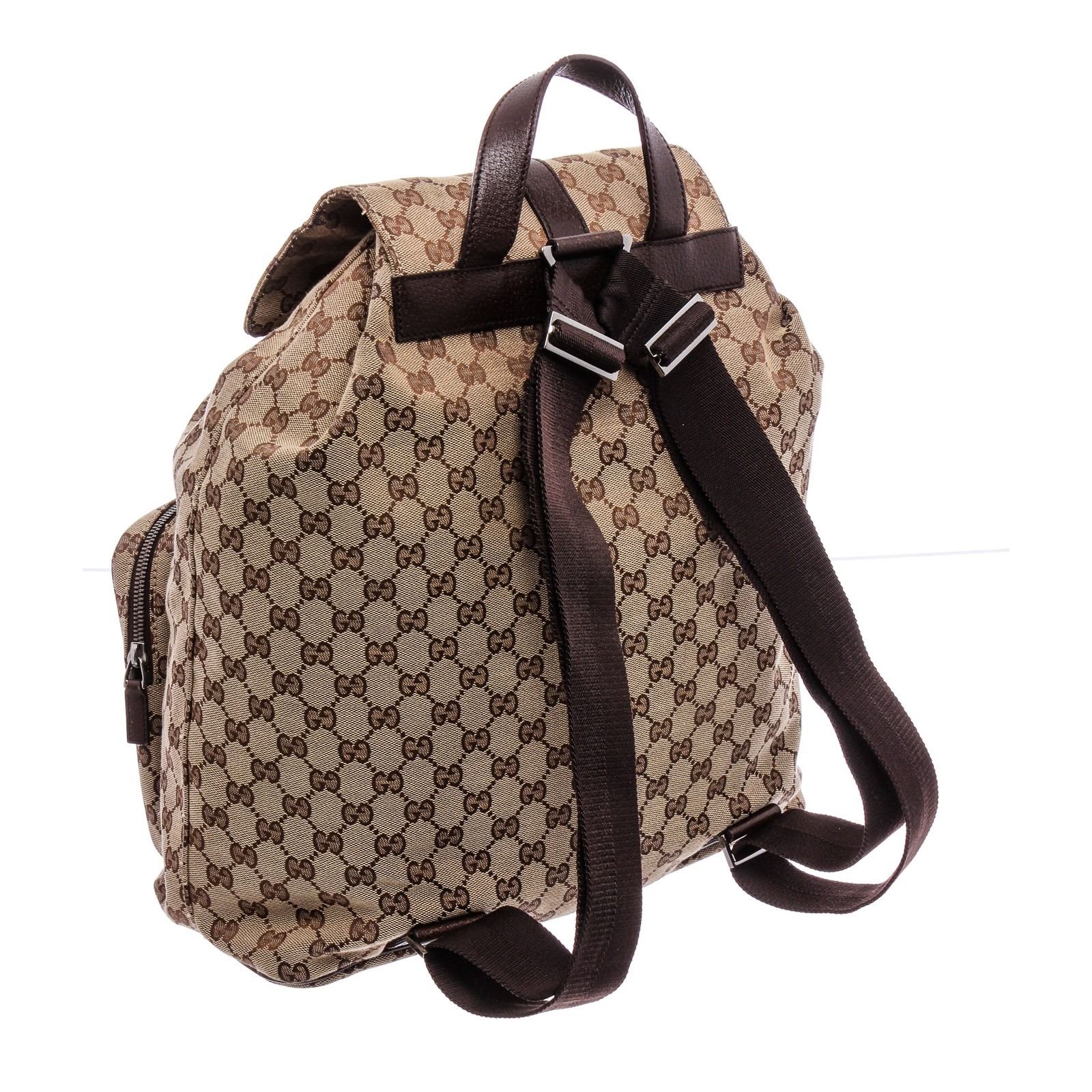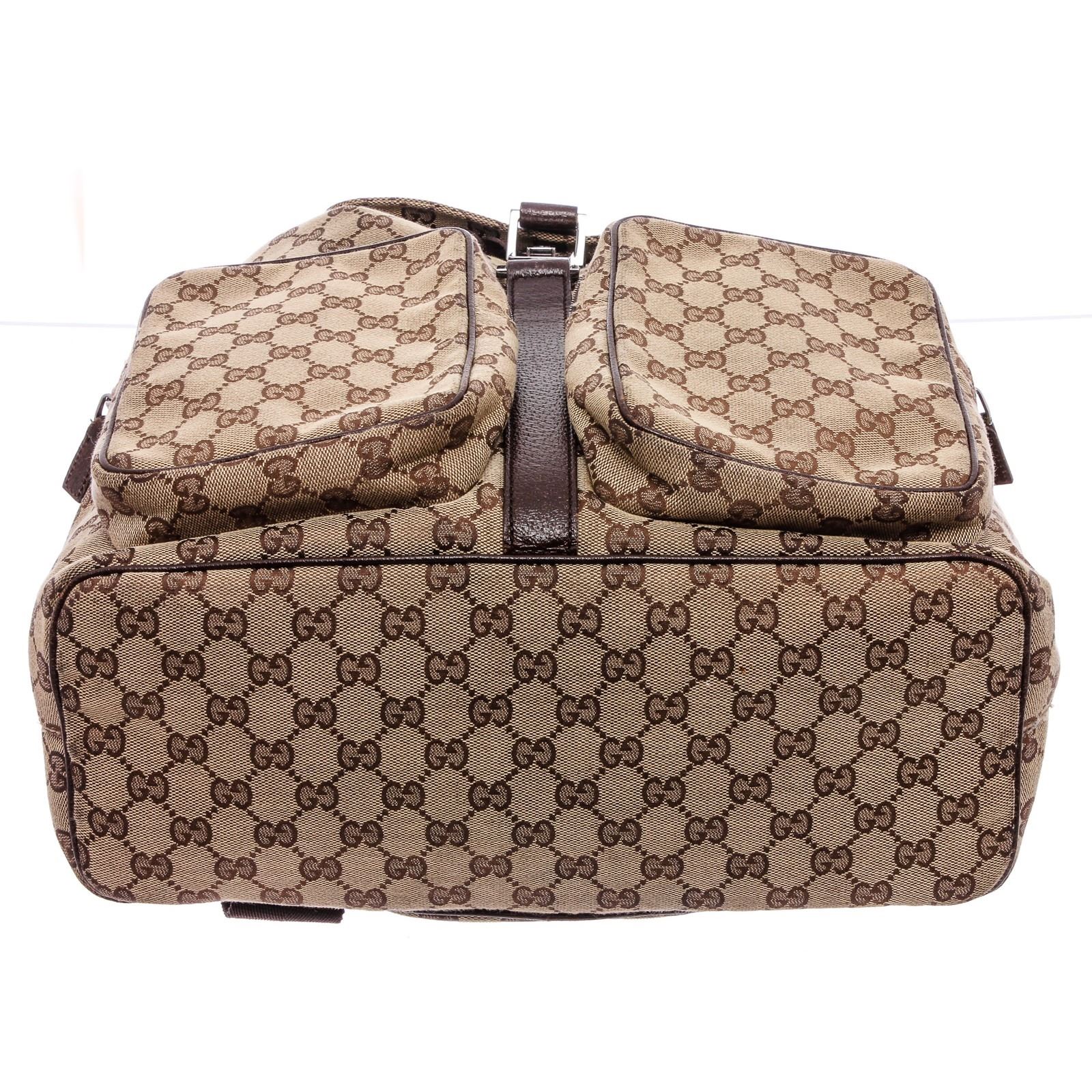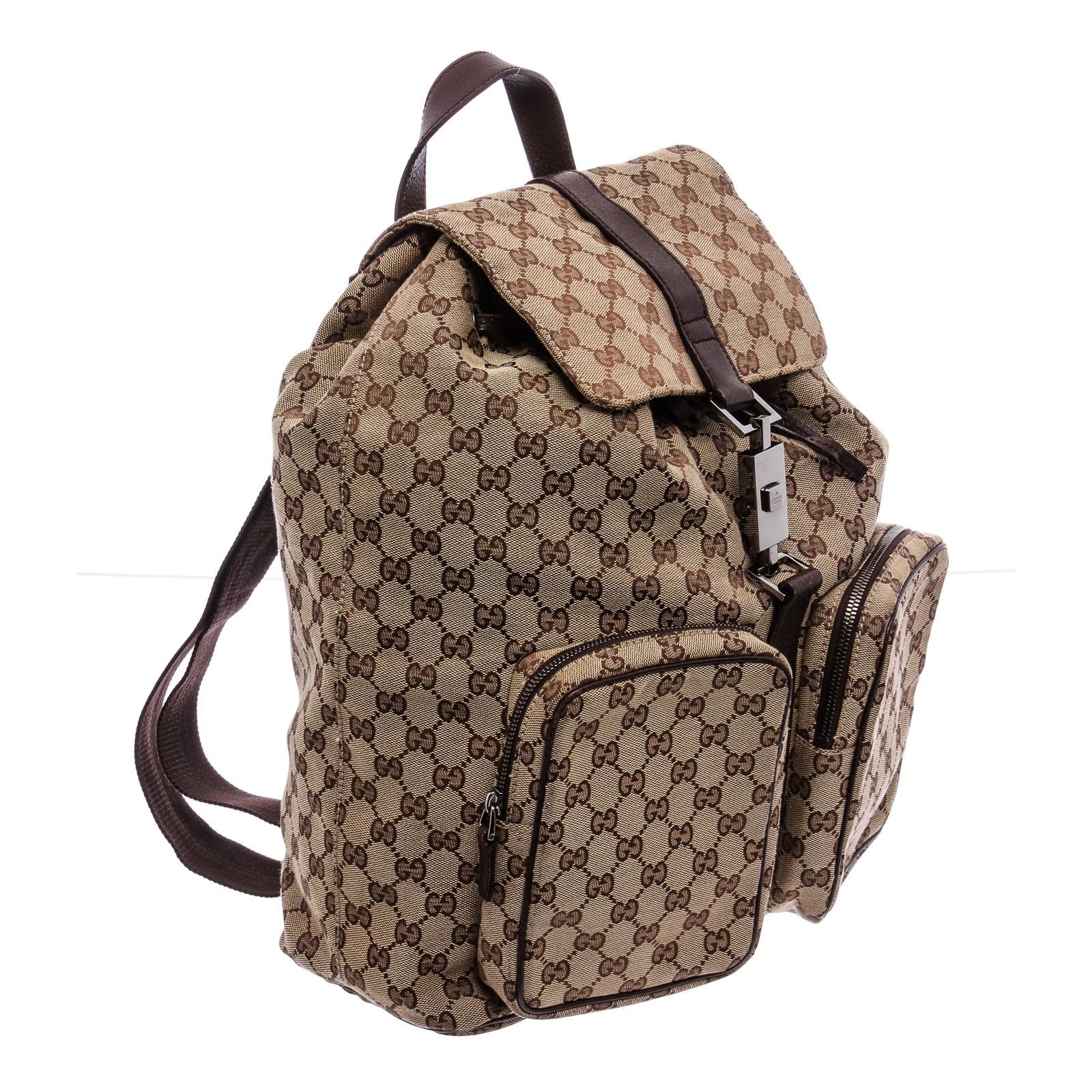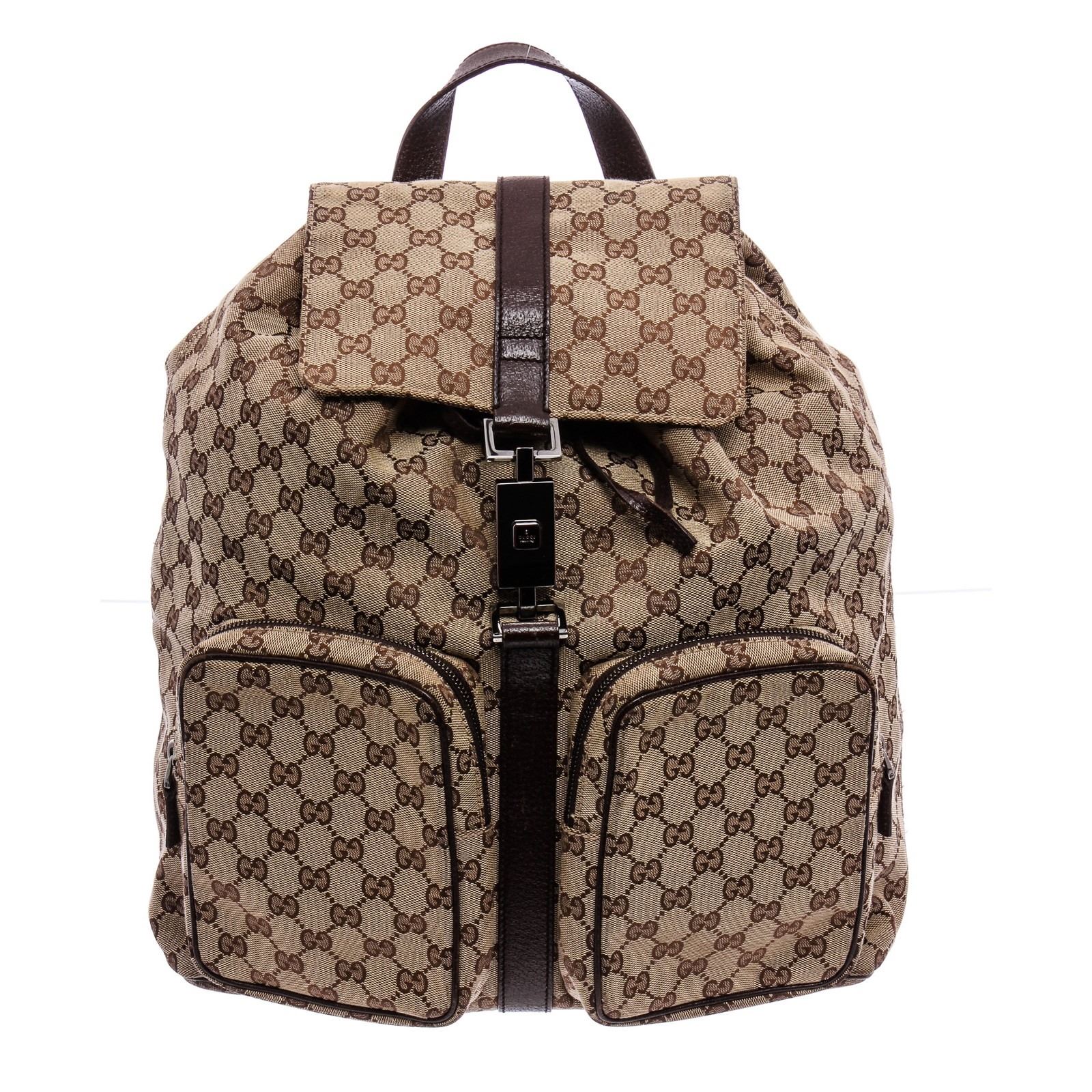Brown and tan GG canvas Gucci Jackie backpack with ruthenium hardware, single flat top handle, dual flat adjustable shoulder straps, brown leather trim, dual zip pockets at front, chocolate woven lining, single zip pocket at interior wall and drawstring closure at top with additional piston-lock closure at flap.
