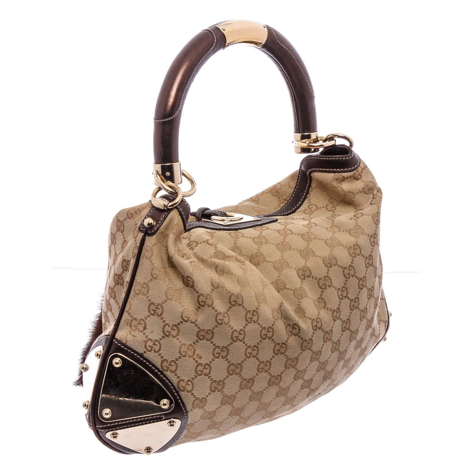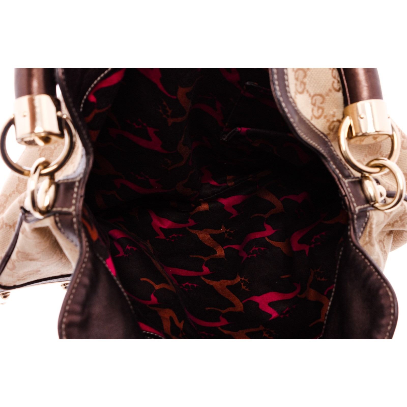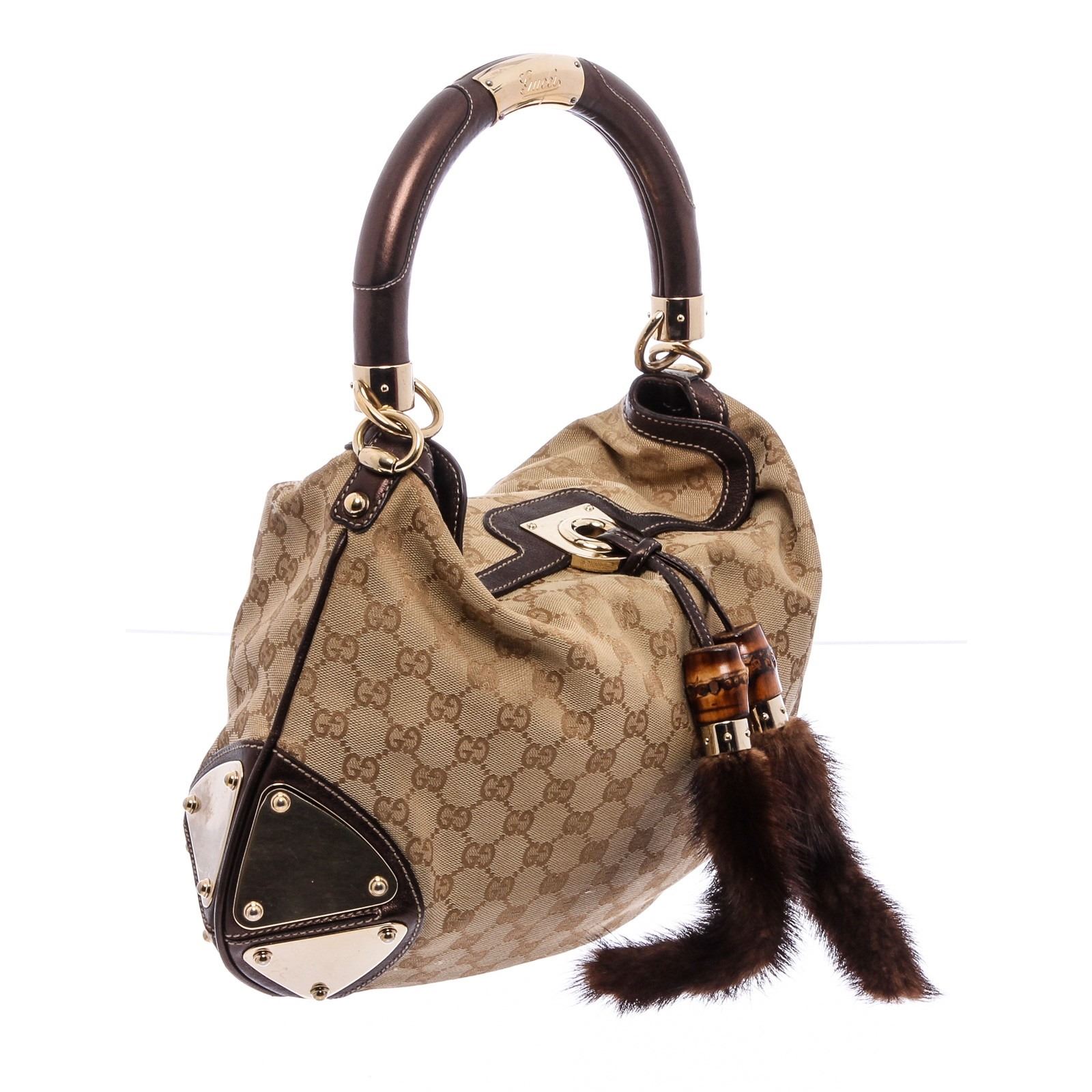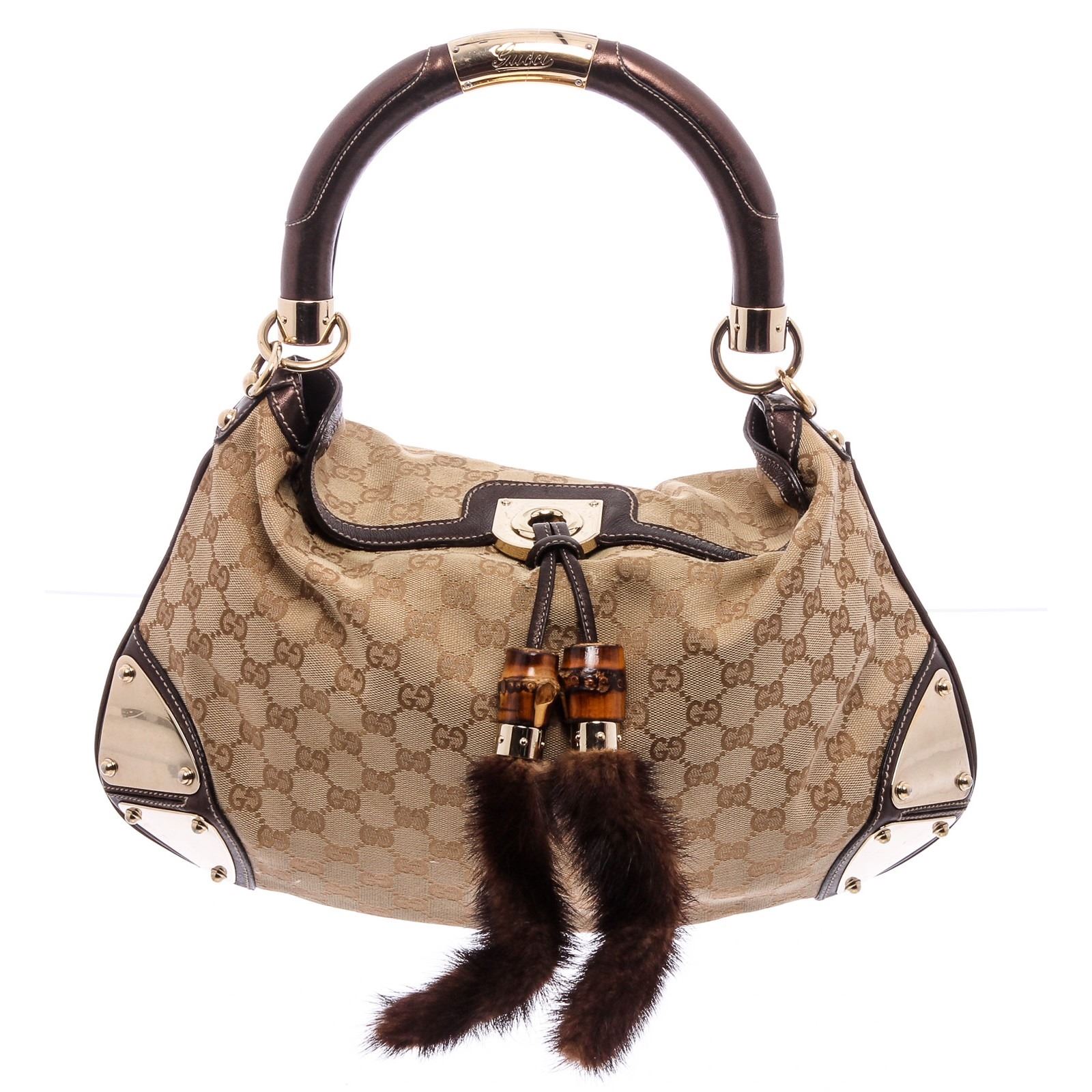 Brown and beige GG canvas Gucci Medium Indy bag with gold-tone hardware, single rolled top handle, chocolate leather trim, single, brown and pink woven lining, dual pockets at interior walls; one with zip closure and bamboo tassel weighted closure at front.