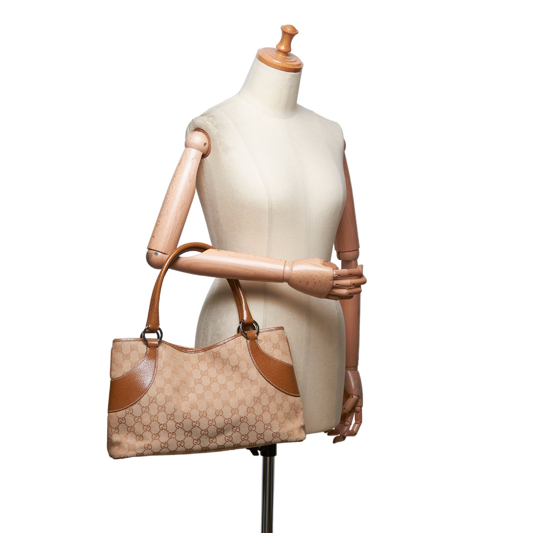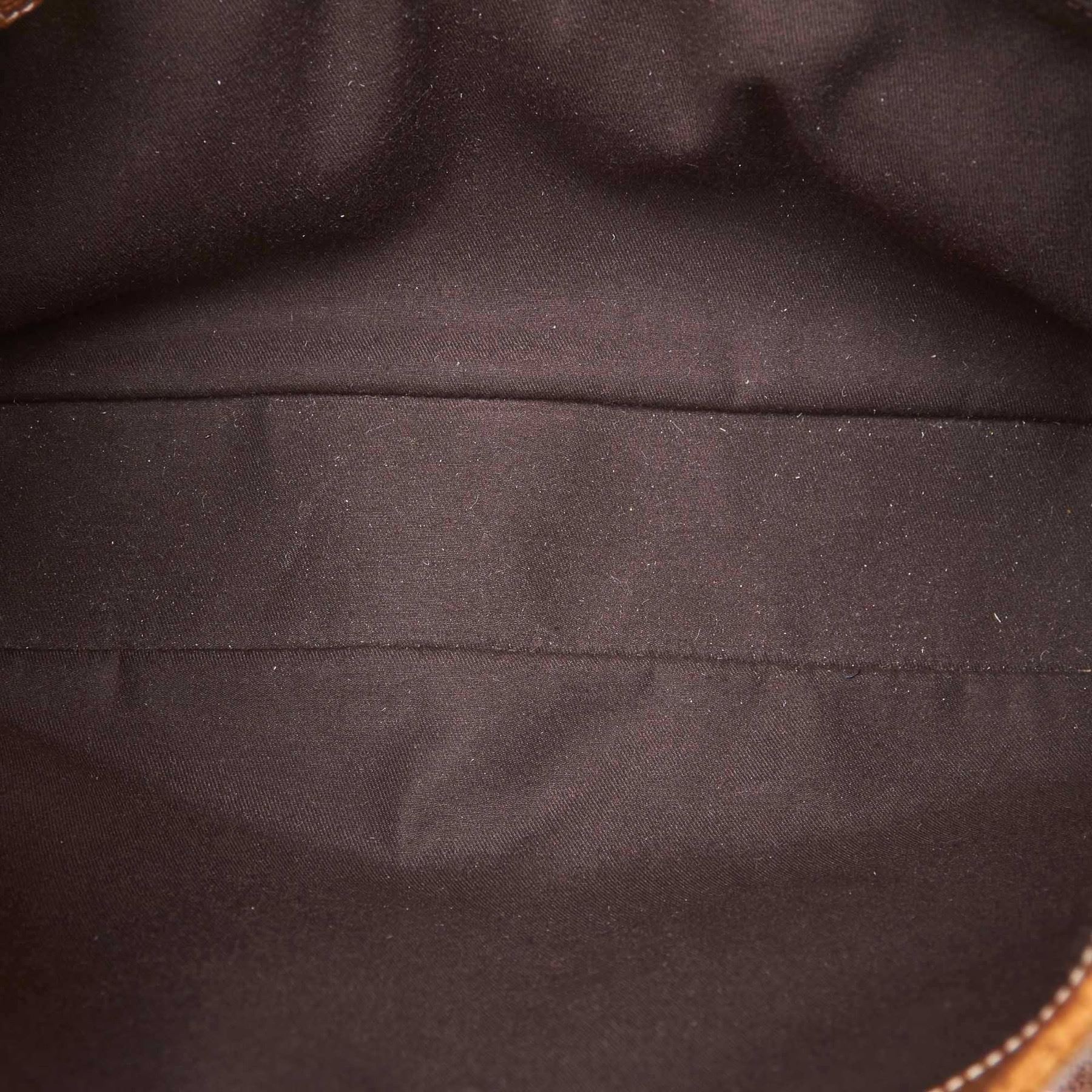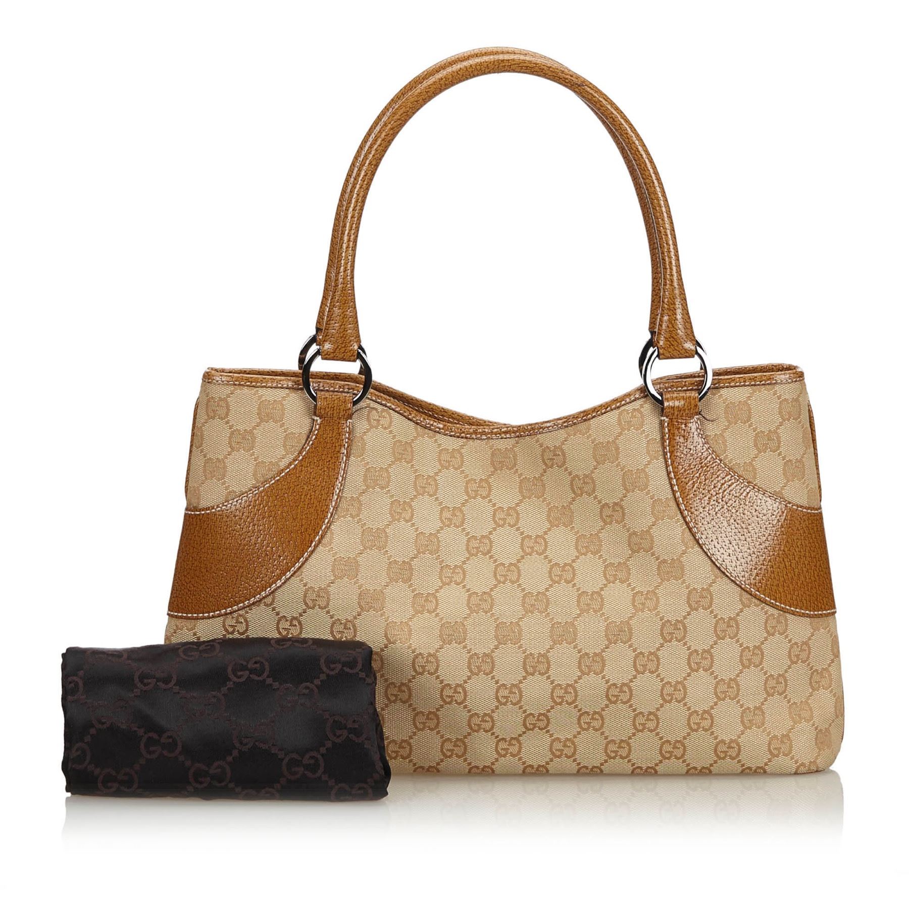 This tote bag features a canvas body with leather trim, rolled leather straps, an open top with a magnetic closure, and an interior zip pocket. Fabric x Canvas x Leather x Others Brown x Beige x Brown Exterior back is stained with transfer of color. Exterior bottom is out of shape. Exterior handle is stained with transfer of color. Size: 20 x 36 x 6 Card: NO Made in: Italy