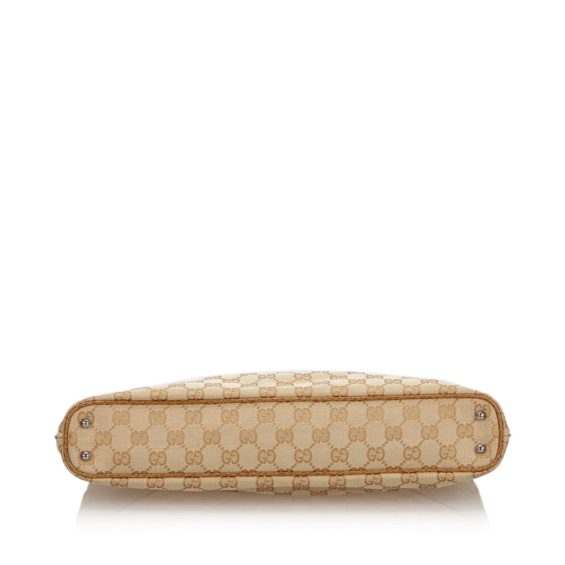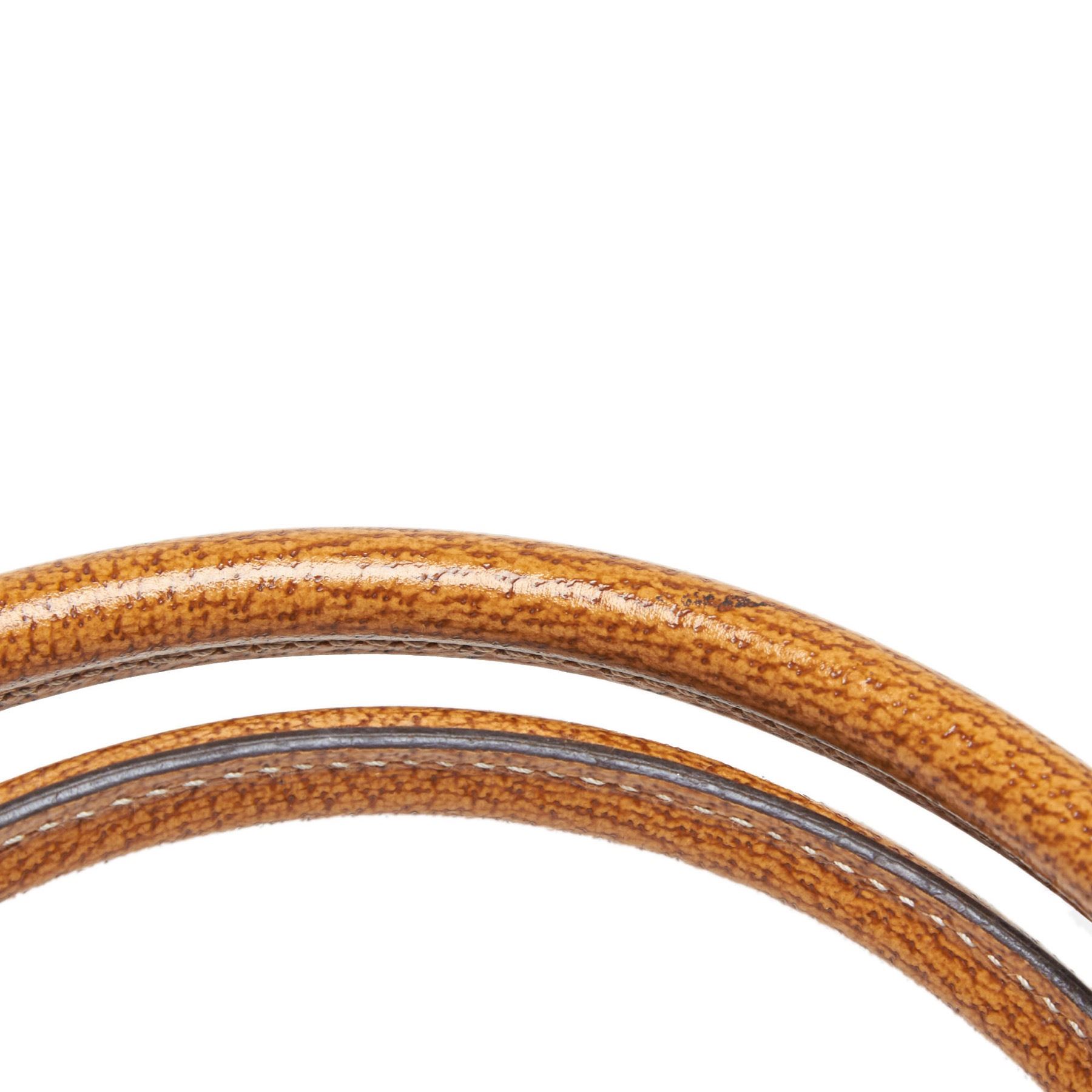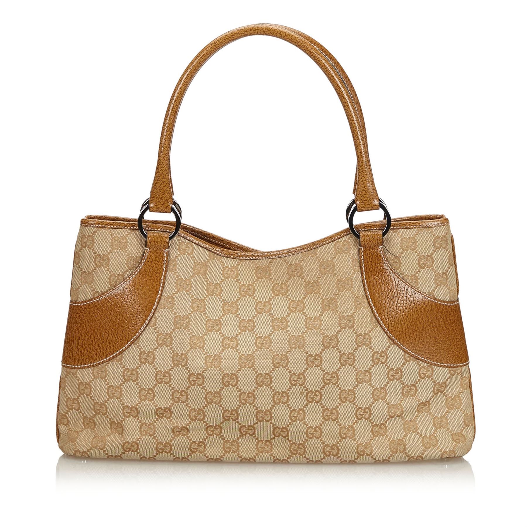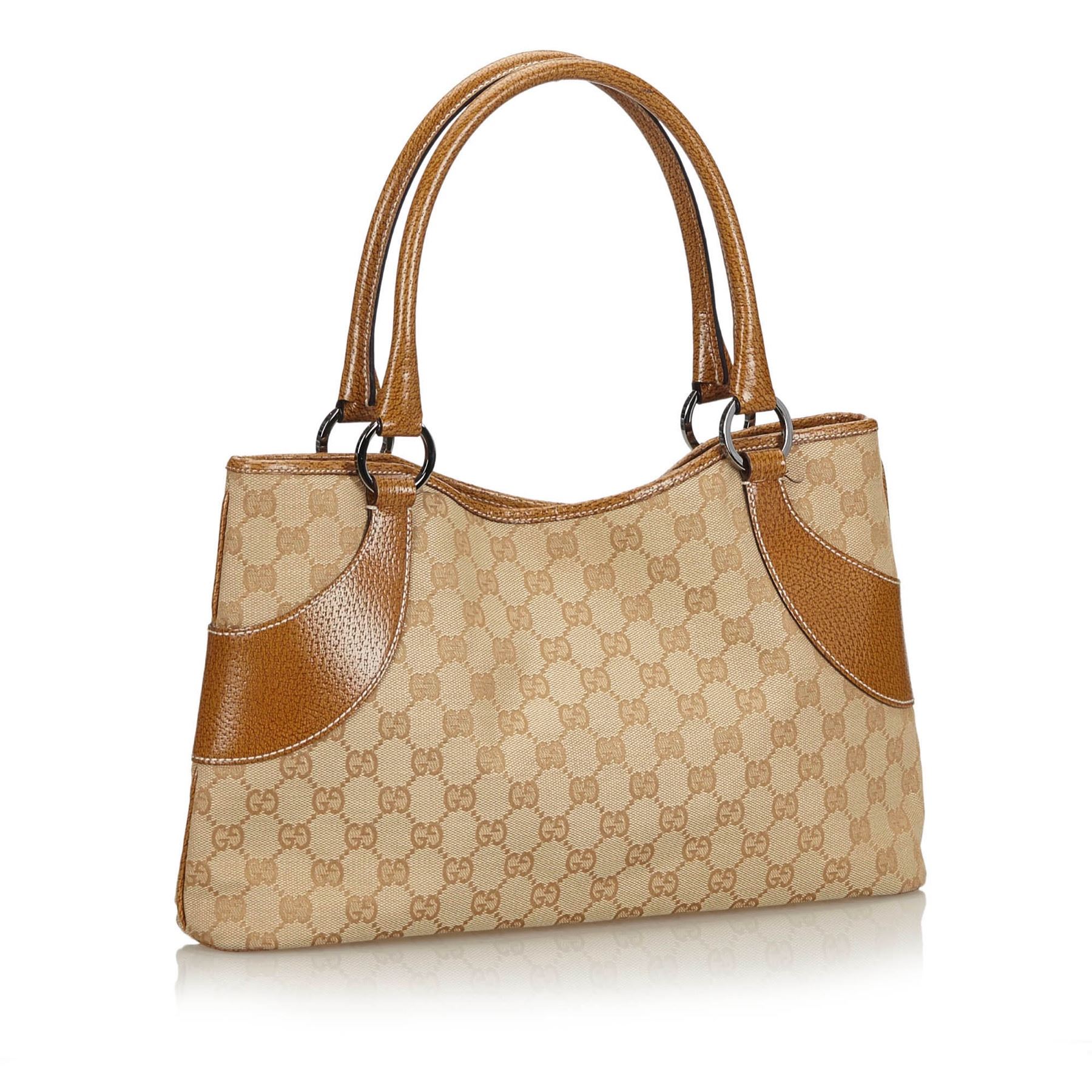 This tote bag features a canvas body with leather trim, rolled leather straps, an open top with a magnetic closure, and an interior zip pocket. Fabric x Canvas x Leather x Others Brown x Beige x Brown Exterior back is stained with transfer of color. Exterior bottom is out of shape. Exterior handle is stained with transfer of color. Size: 20 x 36 x 6 Card: NO Made in: Italy