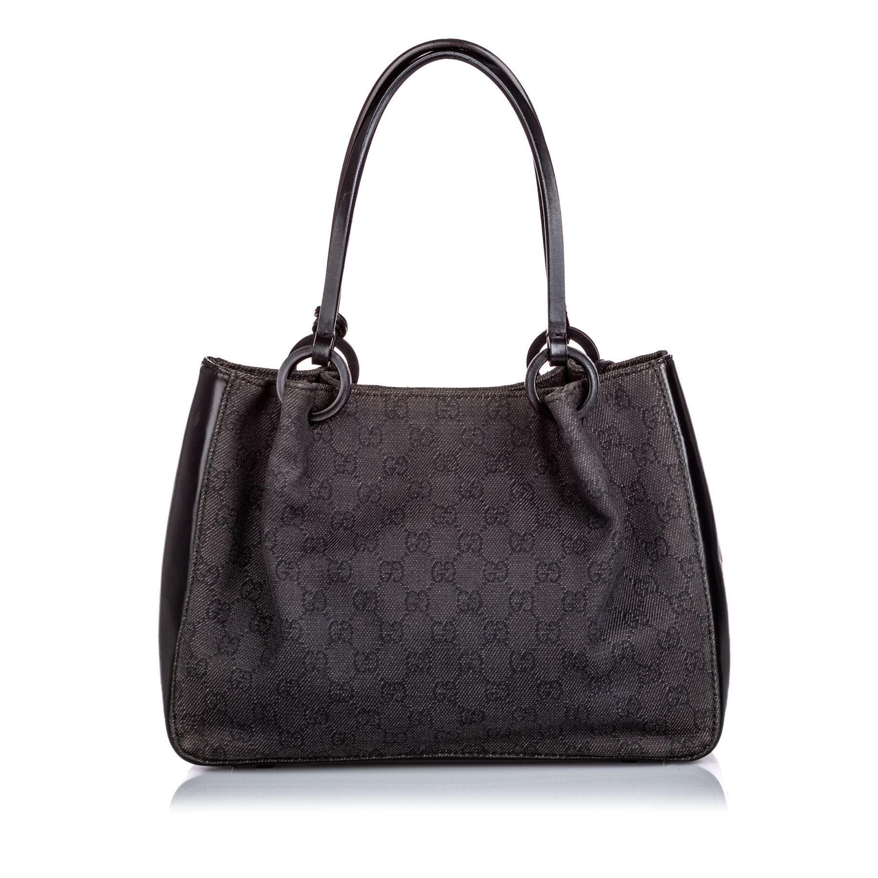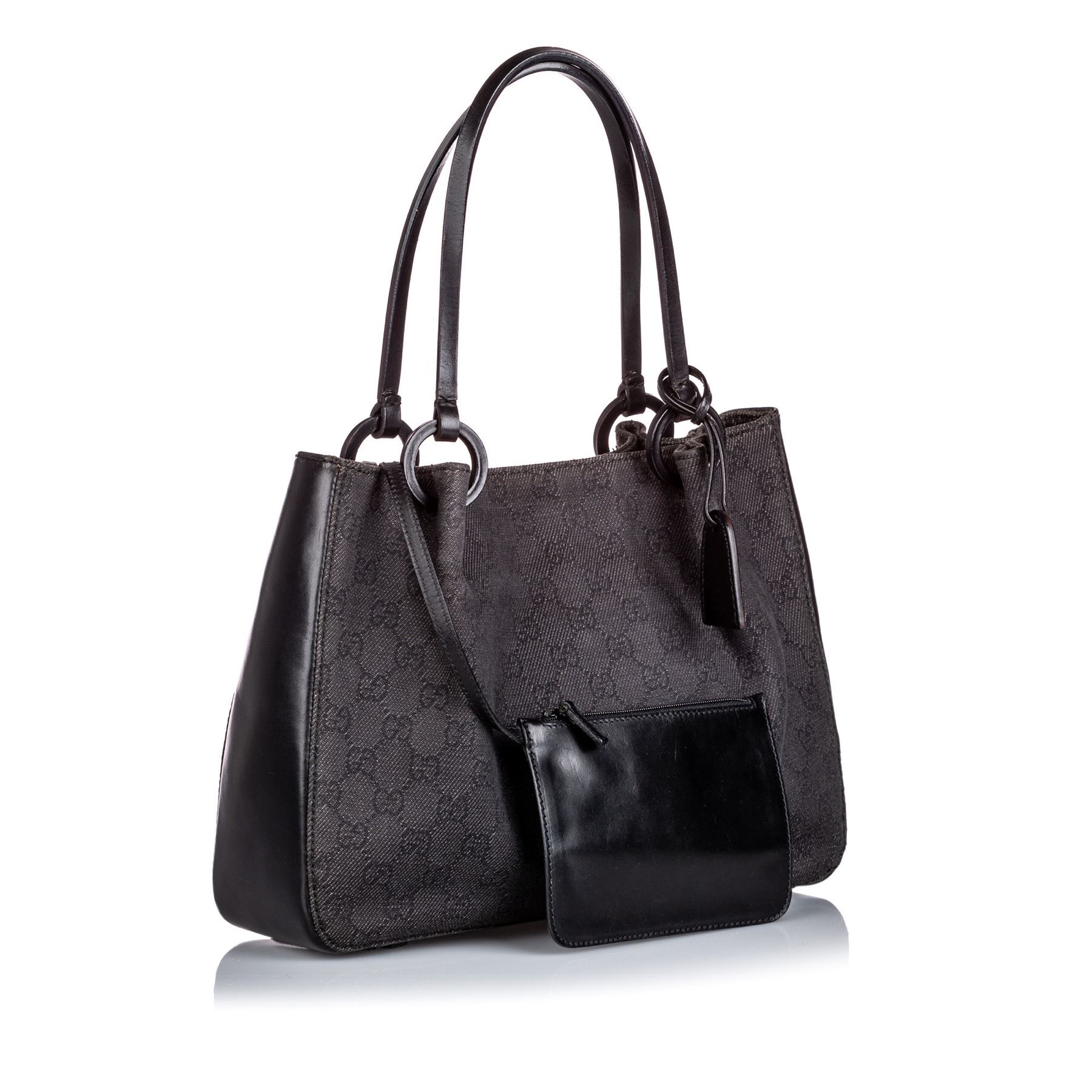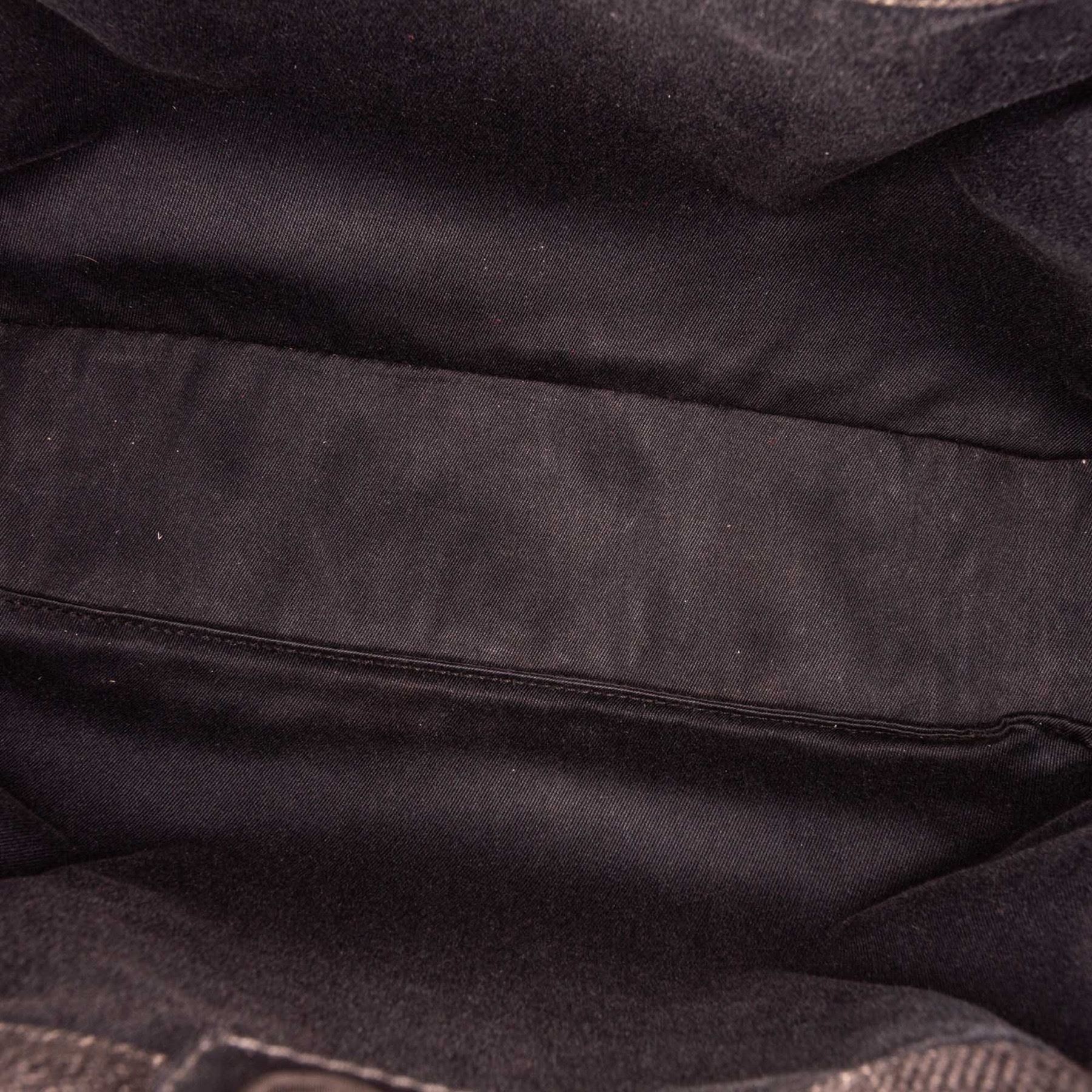 This tote bag features a canvas body, flat leather straps, and an open top with magnetic closure. Fabric x Canvas x Leather x Others Black Exterior front is discolored. Exterior back is discolored. Exterior bottom is scratched. Exterior handle is ripped and scratched. Exterior side is scratched. Size: 21 x 30 x 9 Card: NO Made in: ITALY