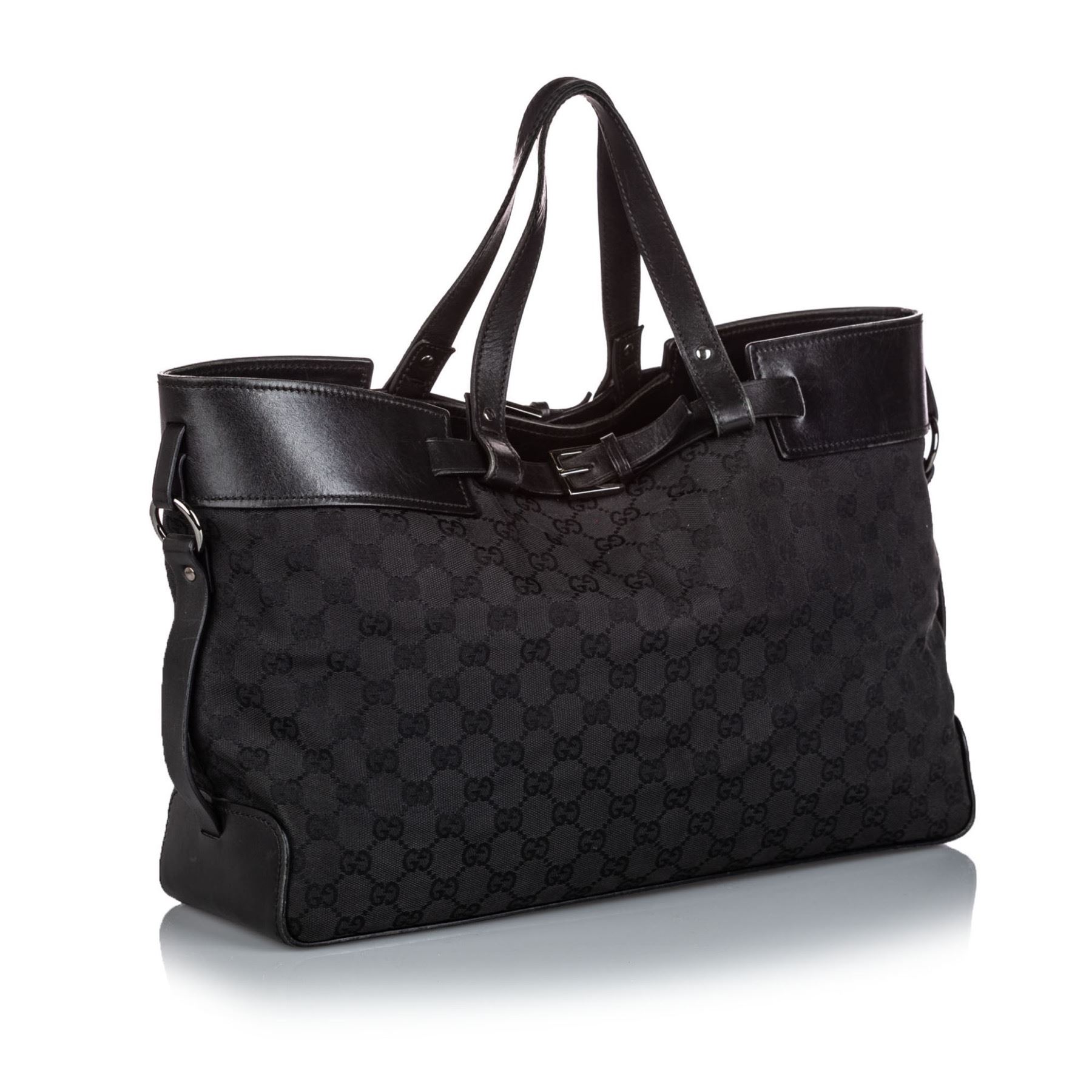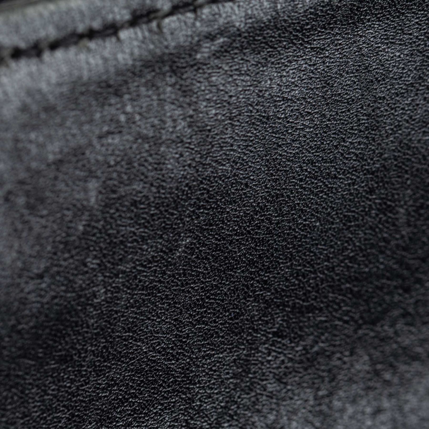 This tote bag features a canvas body with leather trim, flat leather handles, an open top, and an interior zip pocket. Fabric x Canvas x Leather x Others Black Exterior front is scratched. Exterior back is scratched. Exterior bottom is scratched. Exterior handle is worn. Exterior corners is worn. Exterior side is out of shape. Size: 26 x 40 x 15 Card: NO Made in: ITALY
