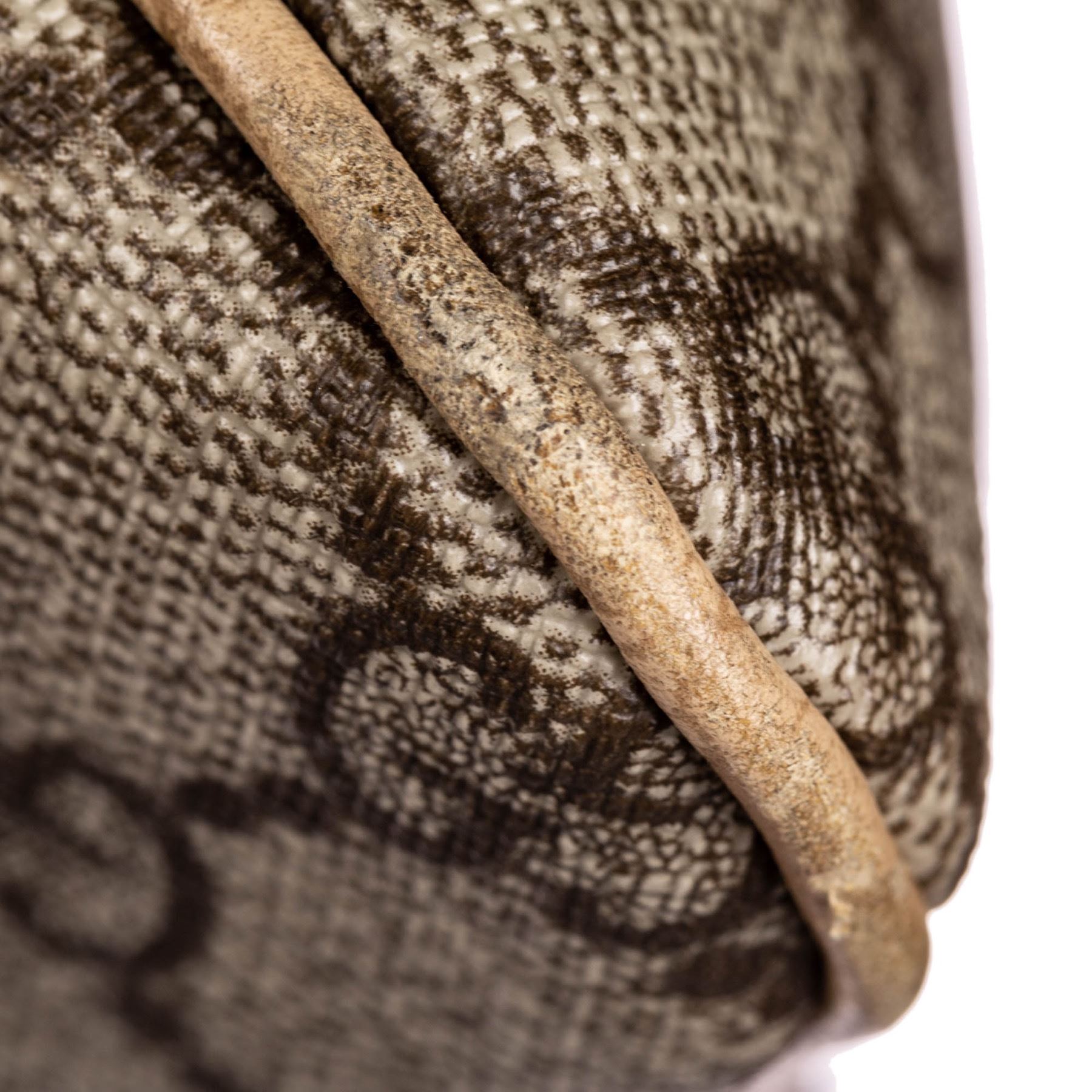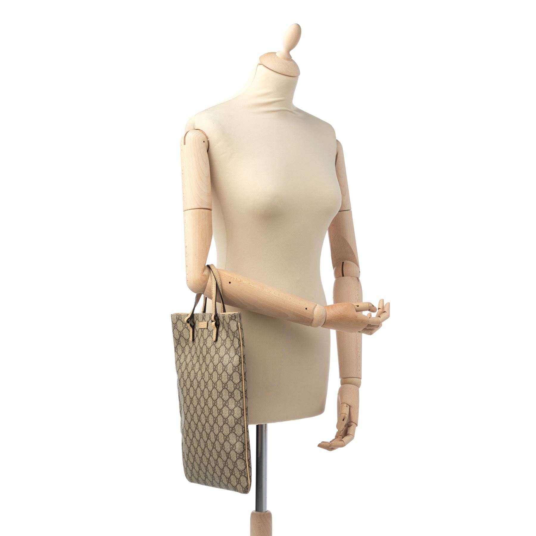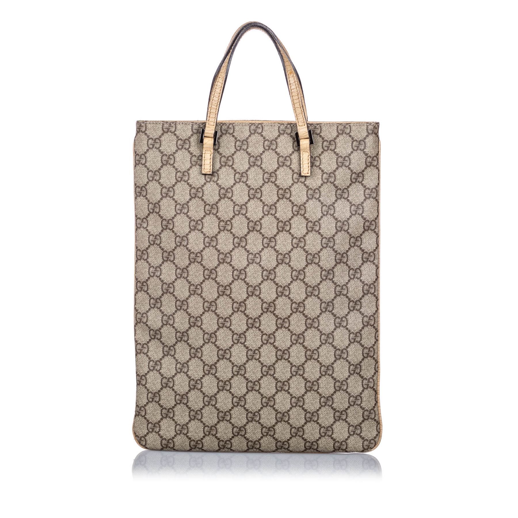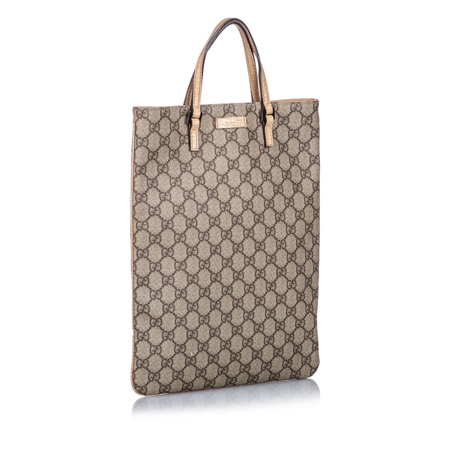 This handbag features a coated canvas body, flat leather straps, an open top with a magnetic snap button closure, and an interior zip pocket. Fabric x Coated Canvas x Leather x Others Brown x Beige x Red Exterior front is scratched. Exterior back is scratched. Exterior bottom is scratched. Exterior handle is worn and scratched. Exterior corners is scratched. Exterior side is scratched. Interior lining is worn. Buckle is scratched. Size: 34 x 26 x 2 Card: NO Made in: ITALY