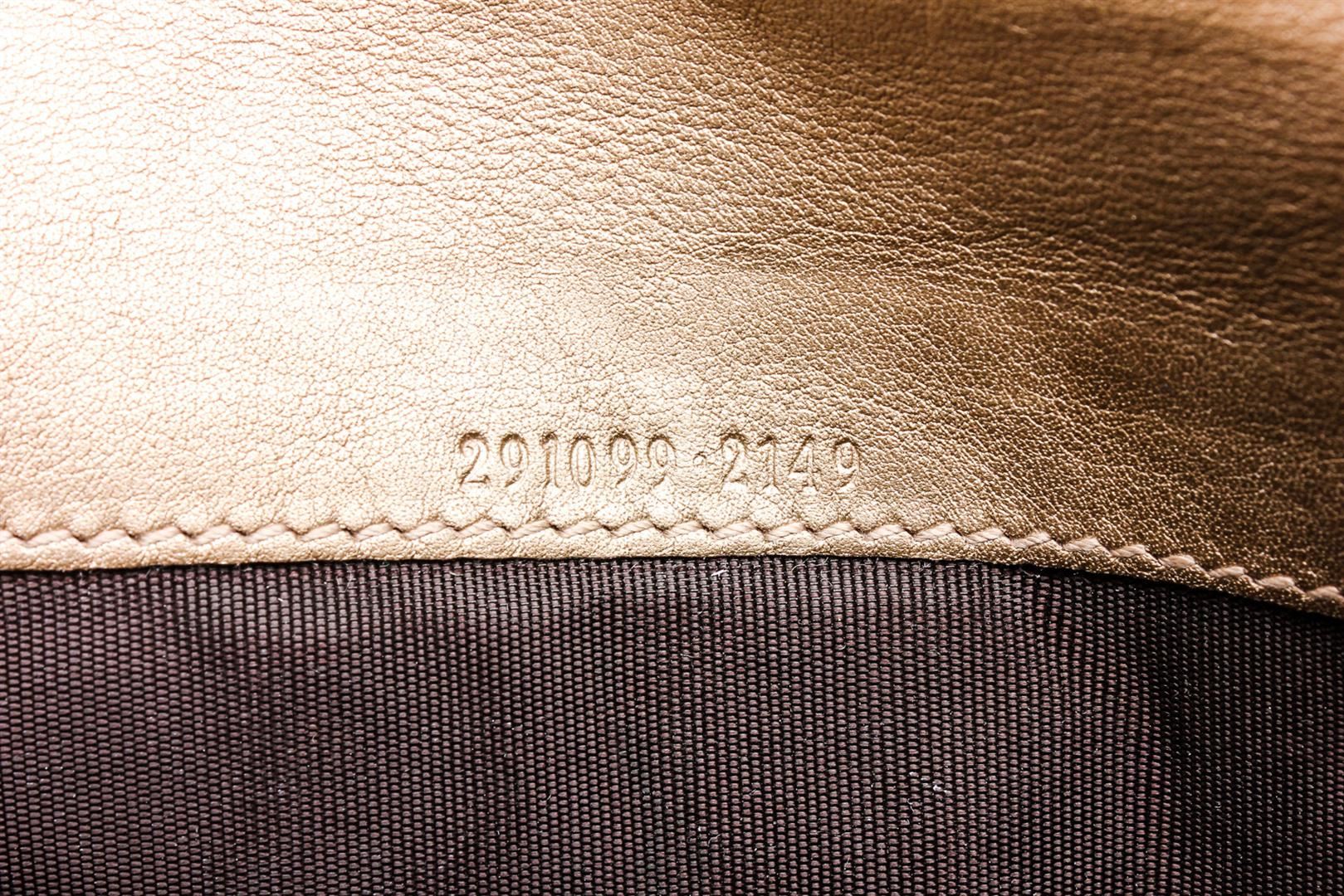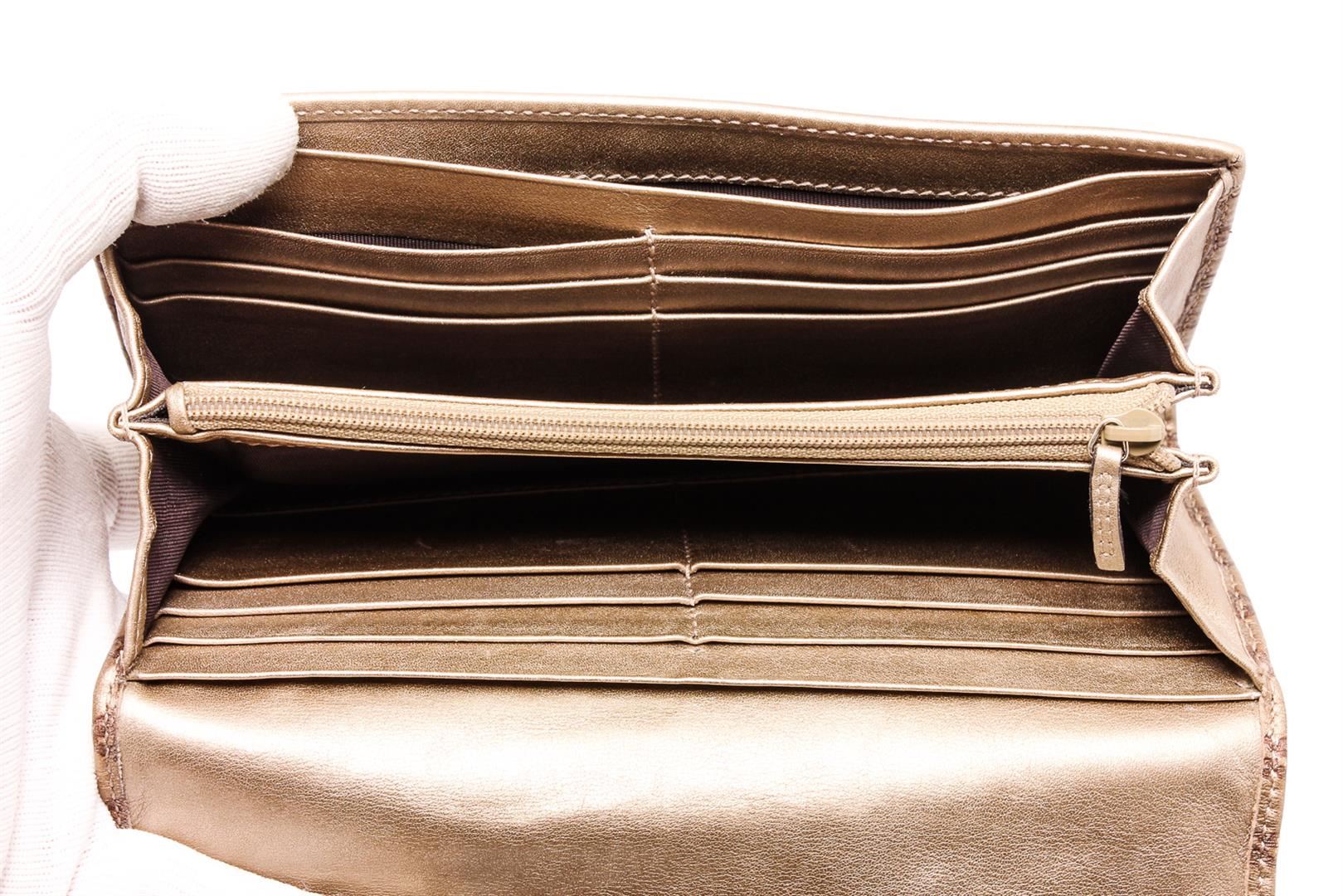 Gucci Gold Leather Mini Guccissima Flap Wallet with gold-tone hardware, logo placard at front face, brown interior canvas lining, three interior pockets; one with zip closure, twelve card slots and overall snap closure at top.