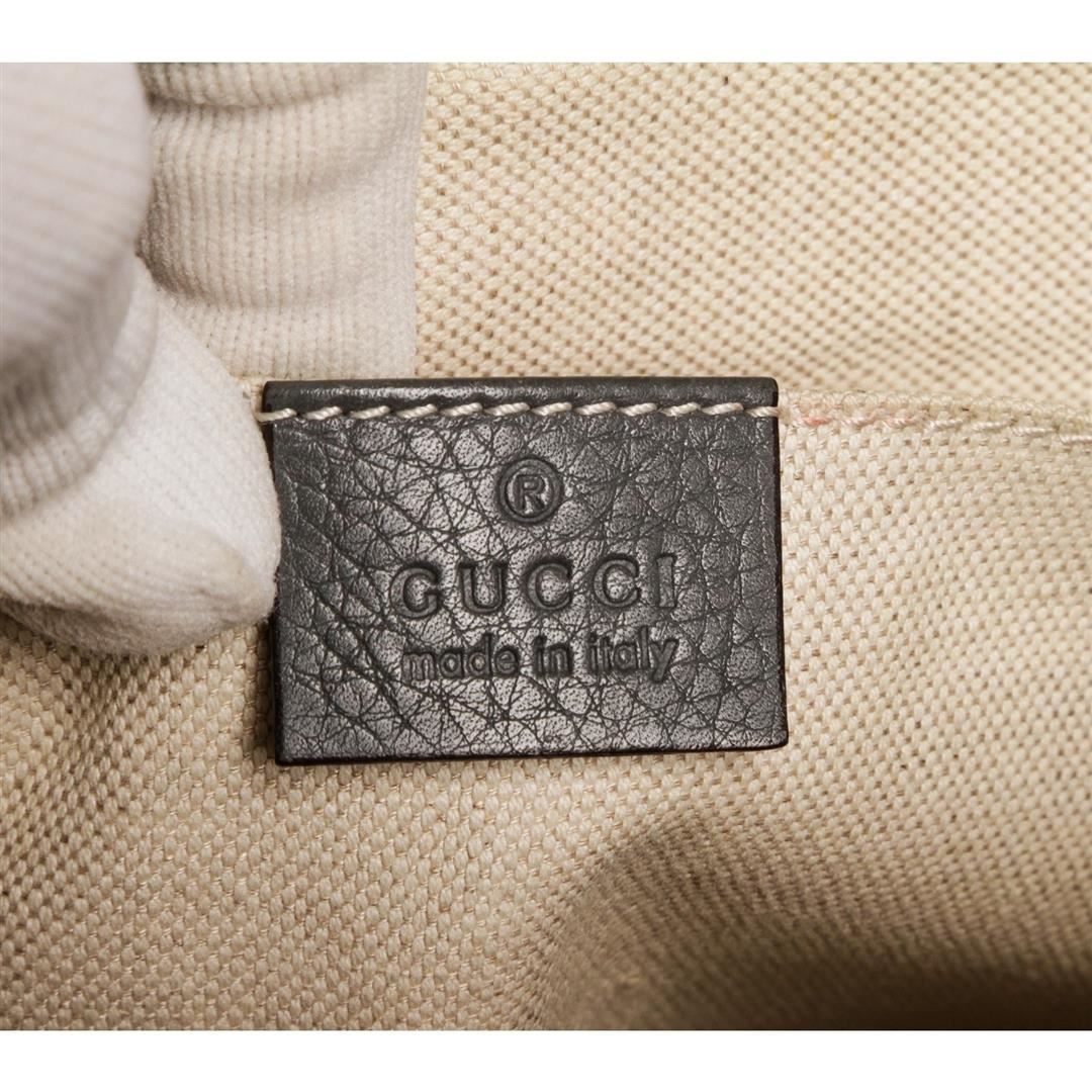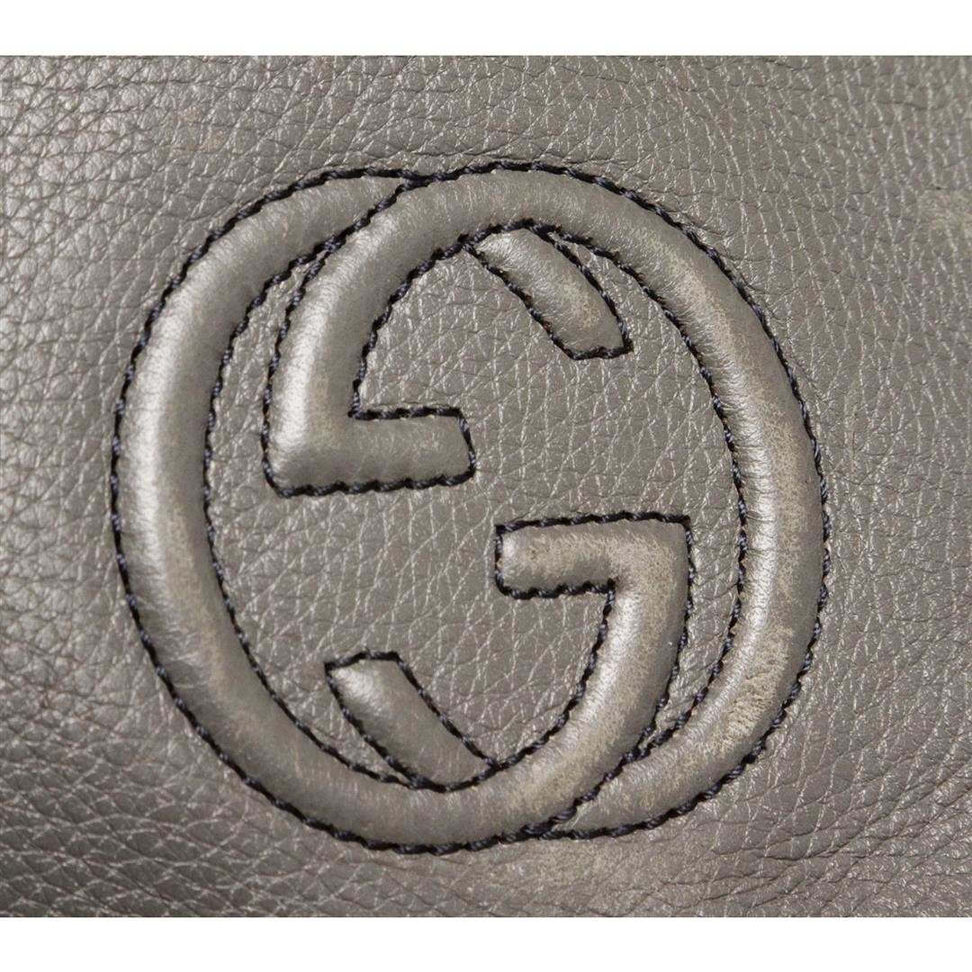 Crafted out of gray leather, GG logo at corner, silver tone hardware, detachable wristlet, and zip top closure. Inner beige canvas lining and one large slip pocket. Item is pre-owned. Item Dimensions: 12"x.5"x9.5" HD:5"/38.48cmx1.27cmx24.13cm HD:12.7cm.