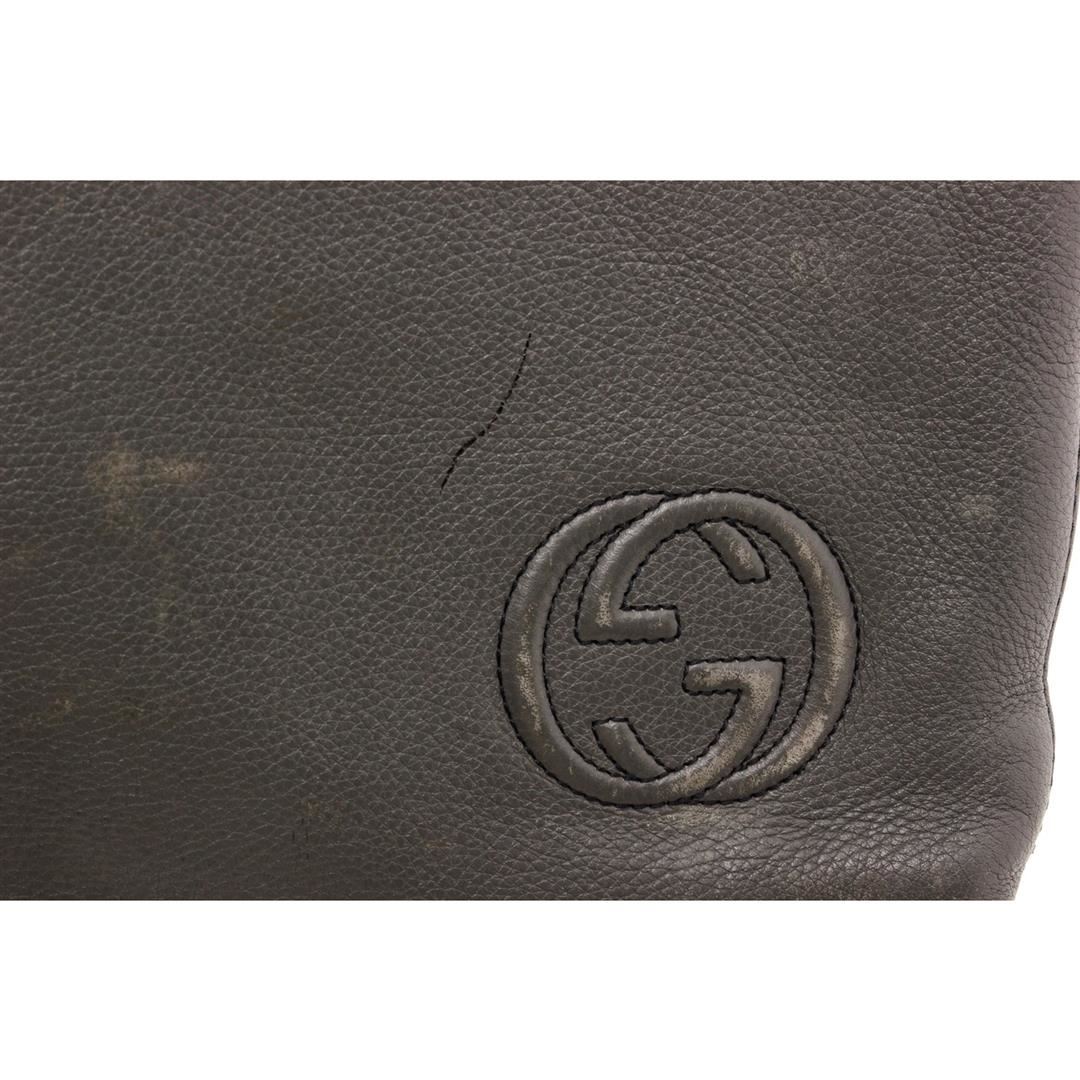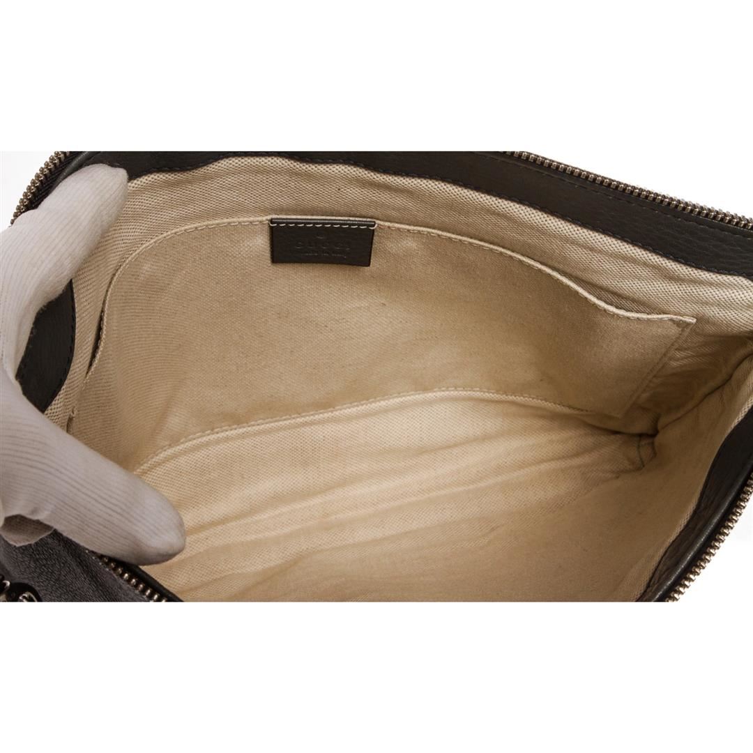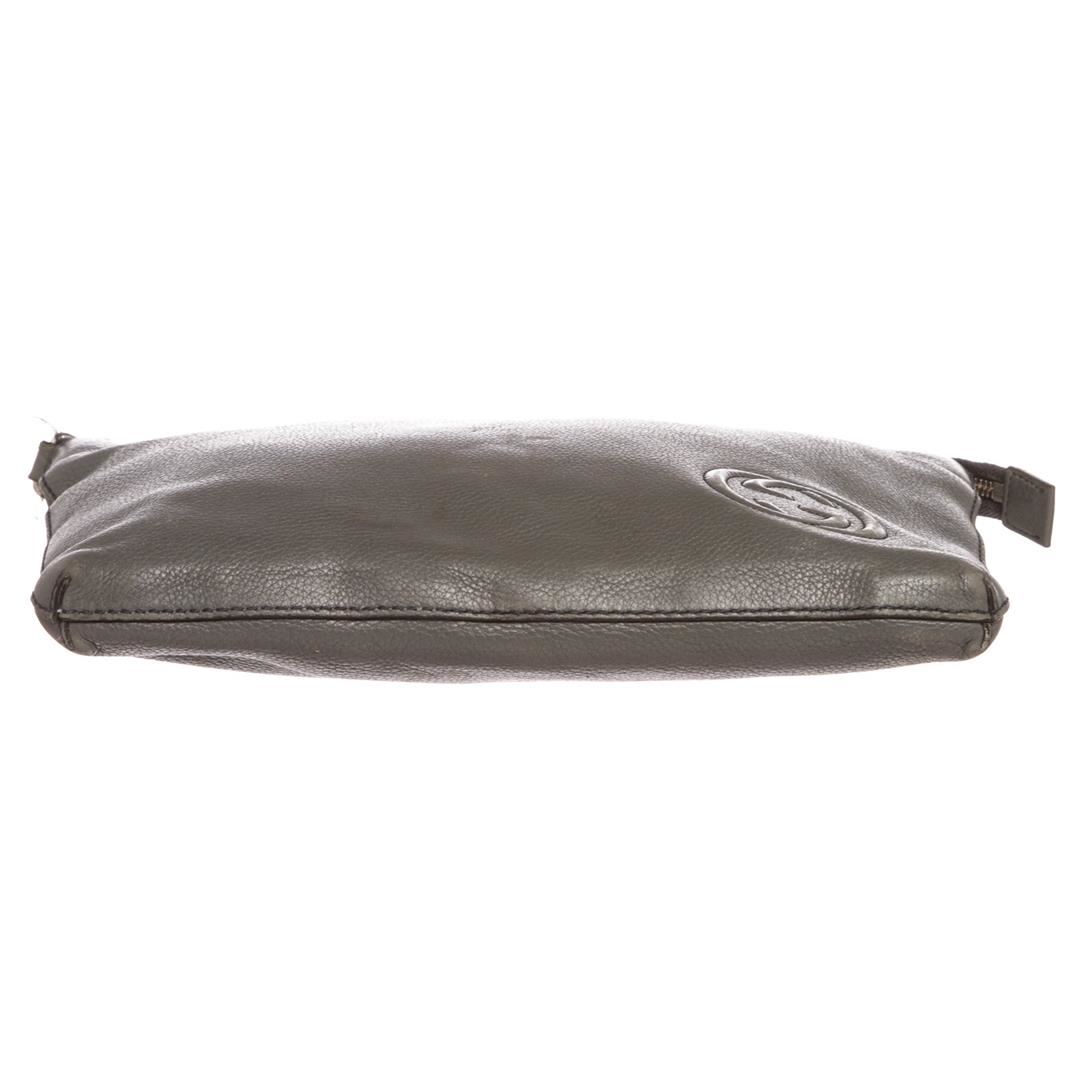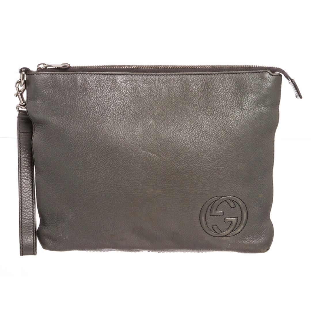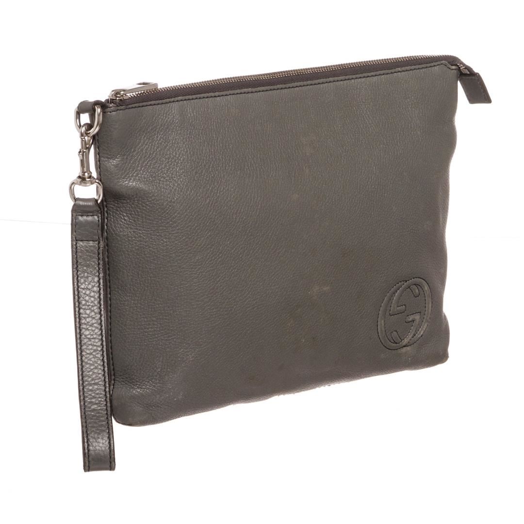 Crafted out of gray leather, GG logo at corner, silver tone hardware, detachable wristlet, and zip top closure. Inner beige canvas lining and one large slip pocket.