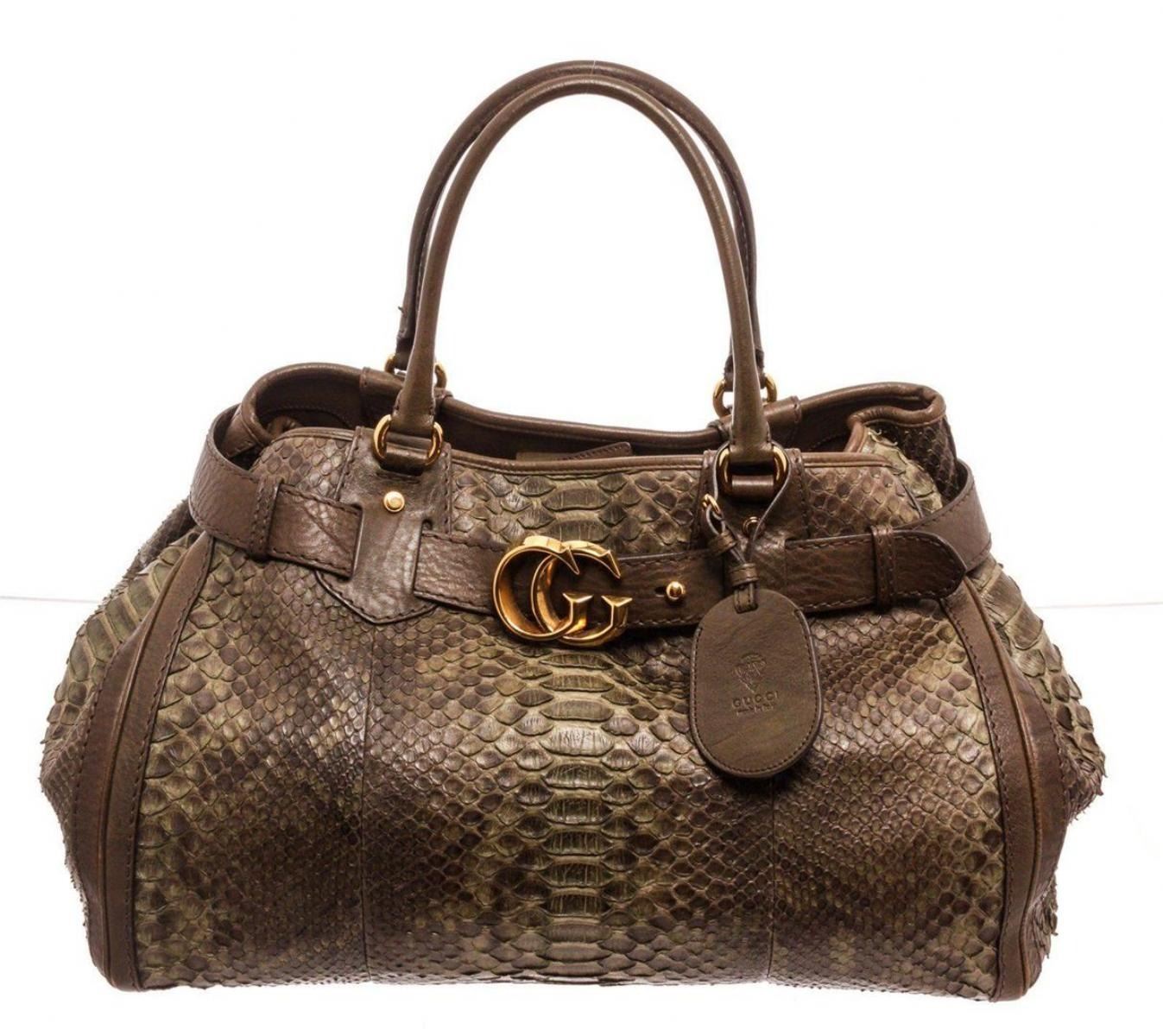 Gucci Green Python GG Running Tote Bag. Gucci Green Python GG Running Tote Bag with gold-tone hardware, trim leather, interior zip pockets, leather lining, dual top handle and snap closure. MEASUREMENTS: Length 12 in / 30 cm Width 17 in / 43 cm Hei