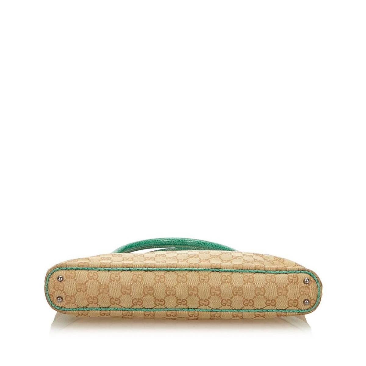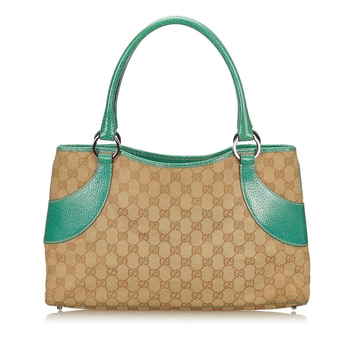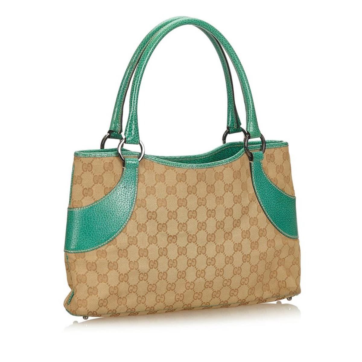 This tote bag features a canvas body with leather trim, flat leather straps, open top, and interior zip pocket.