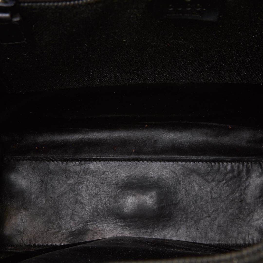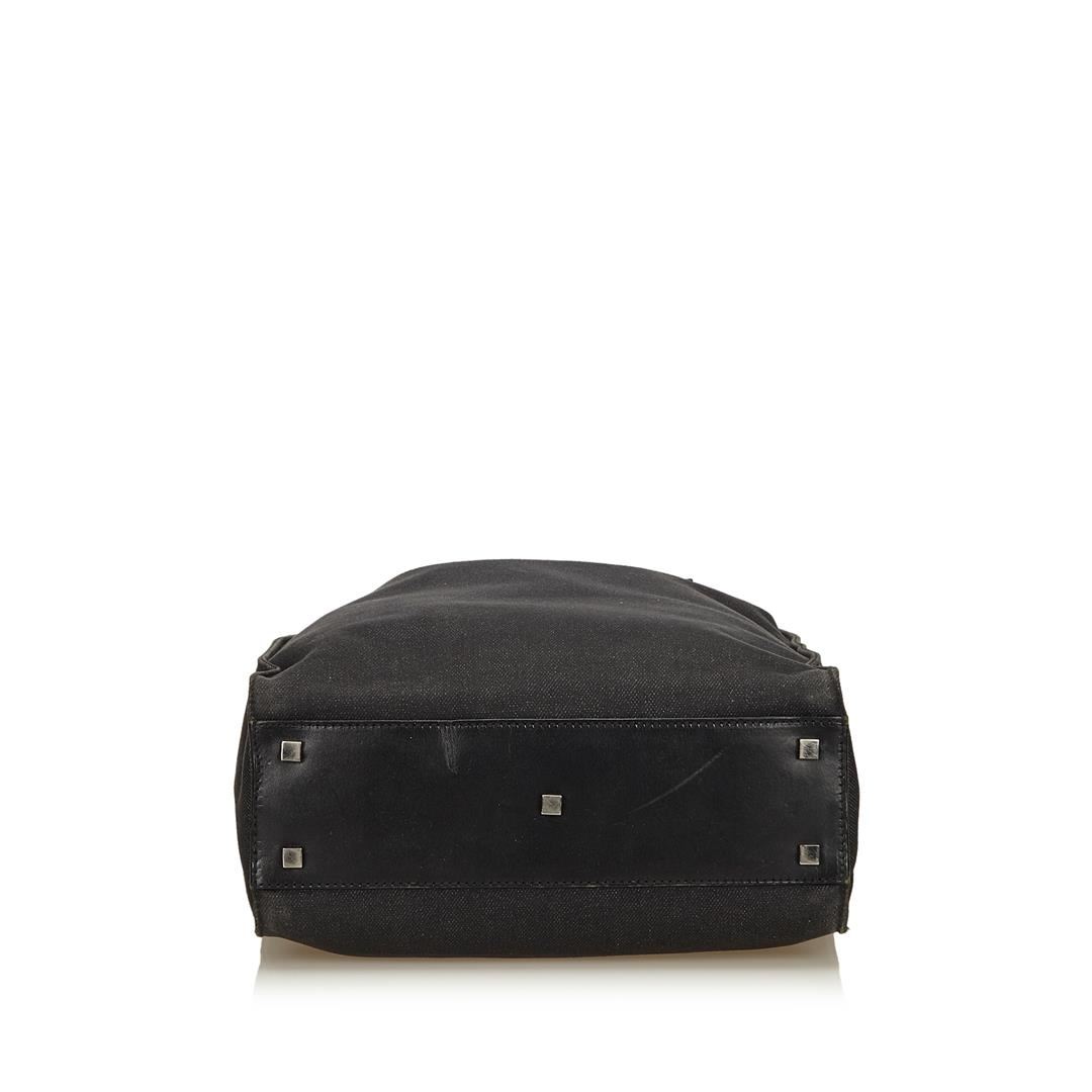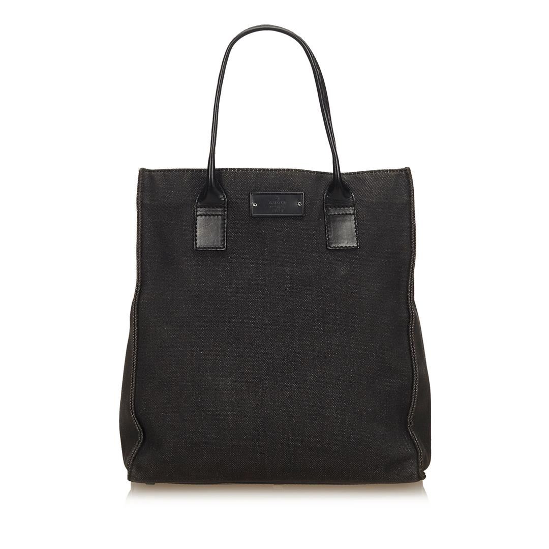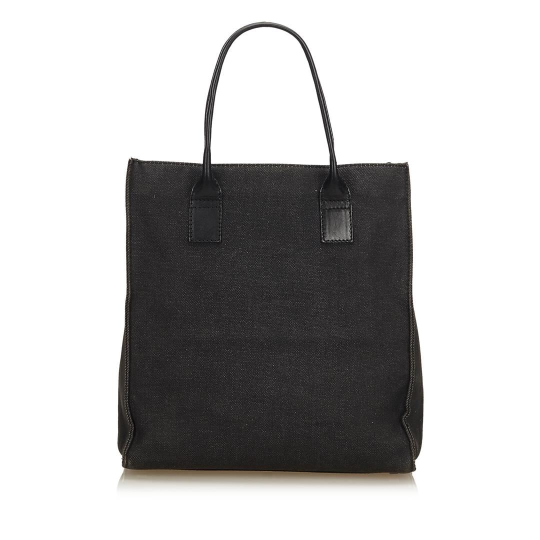 This tote bag features a canvas body, flat leather straps, open top, and interior zip pocket.