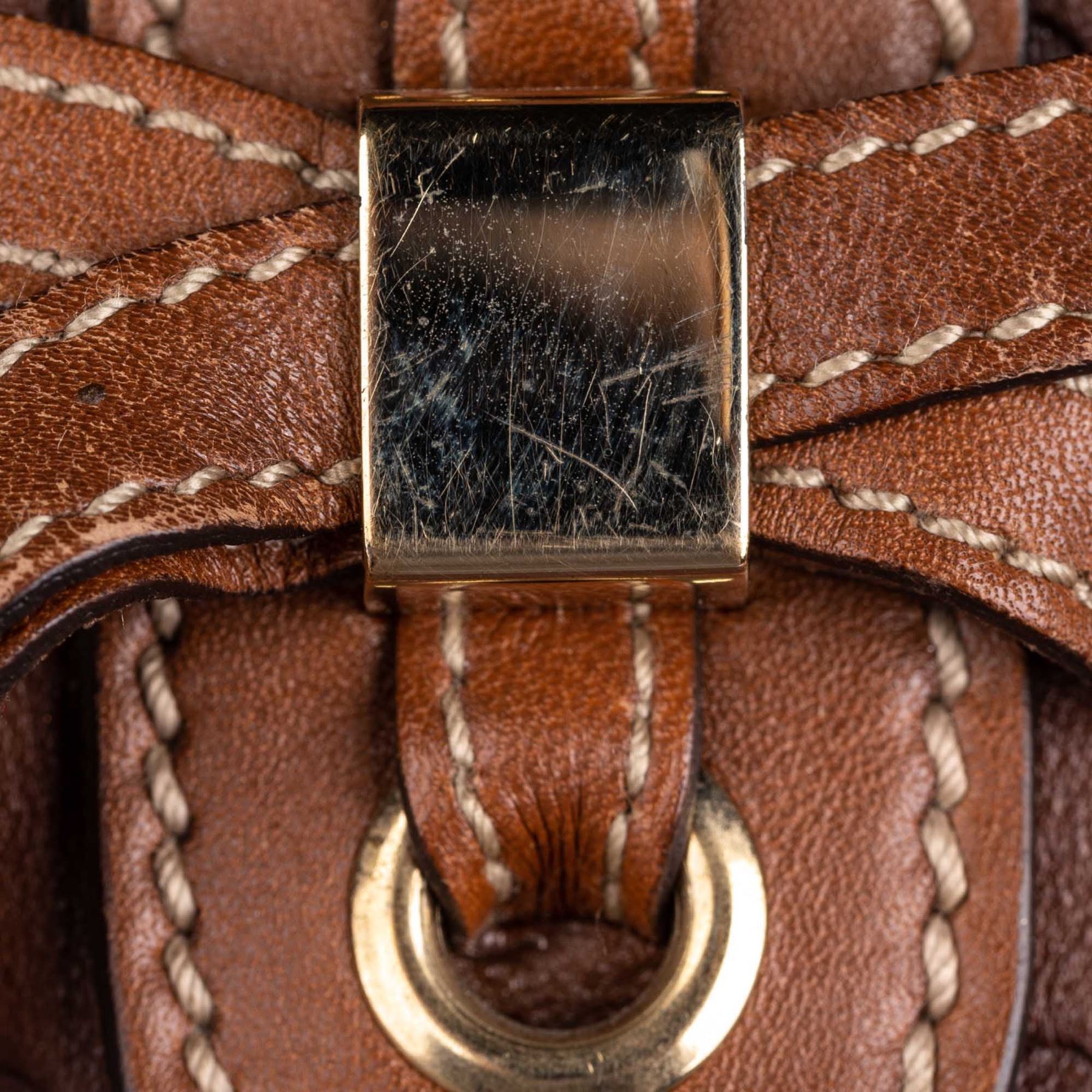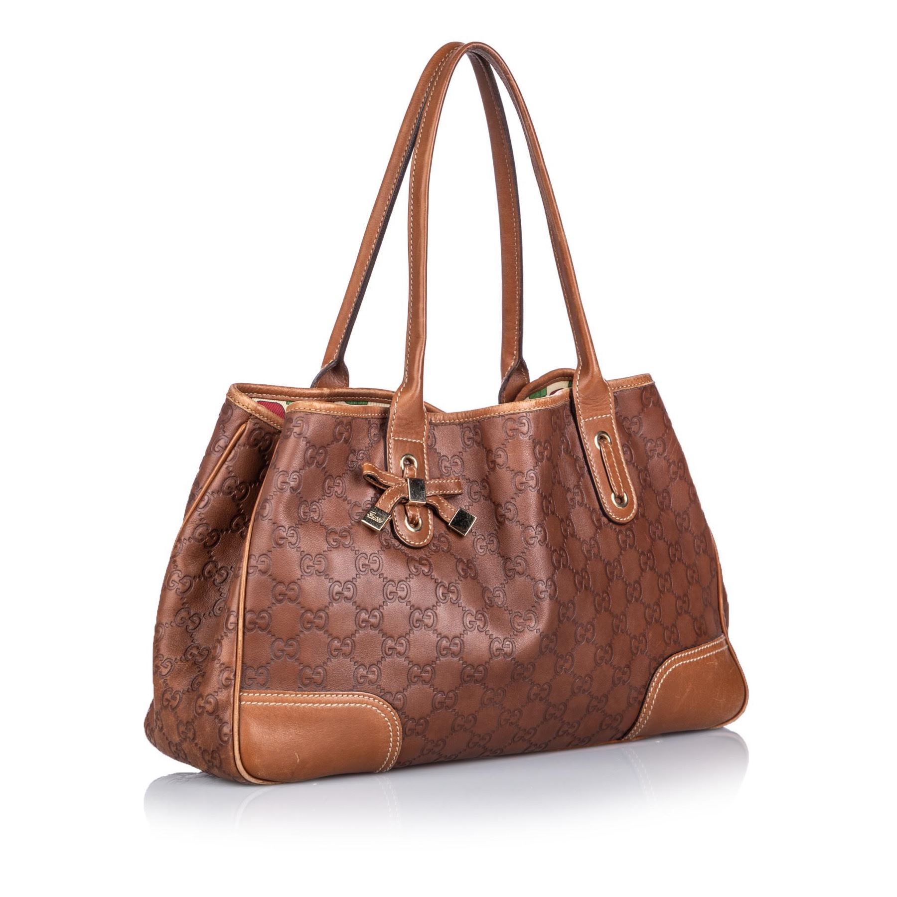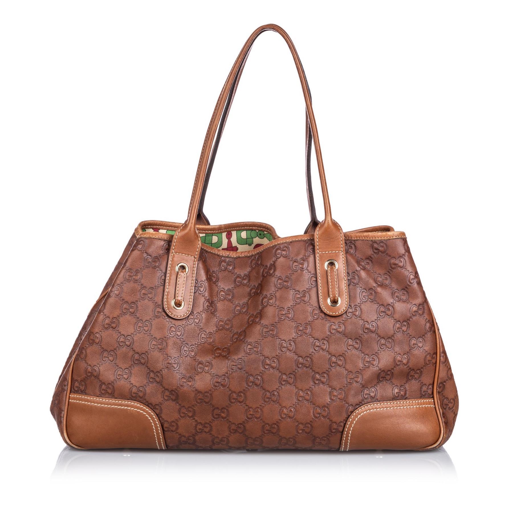 This Princy tote bag features a leather body, rolled leather handles, an open top, and interior zip and slip pockets. Leather x Others Brown Exterior front is scratched. Exterior back is scratched. Exterior handle is discolored and scratched. Exterior corners is peeling and scratched. Size: 23 x 37 x 10 Card: NO Made in: Italy