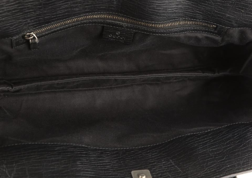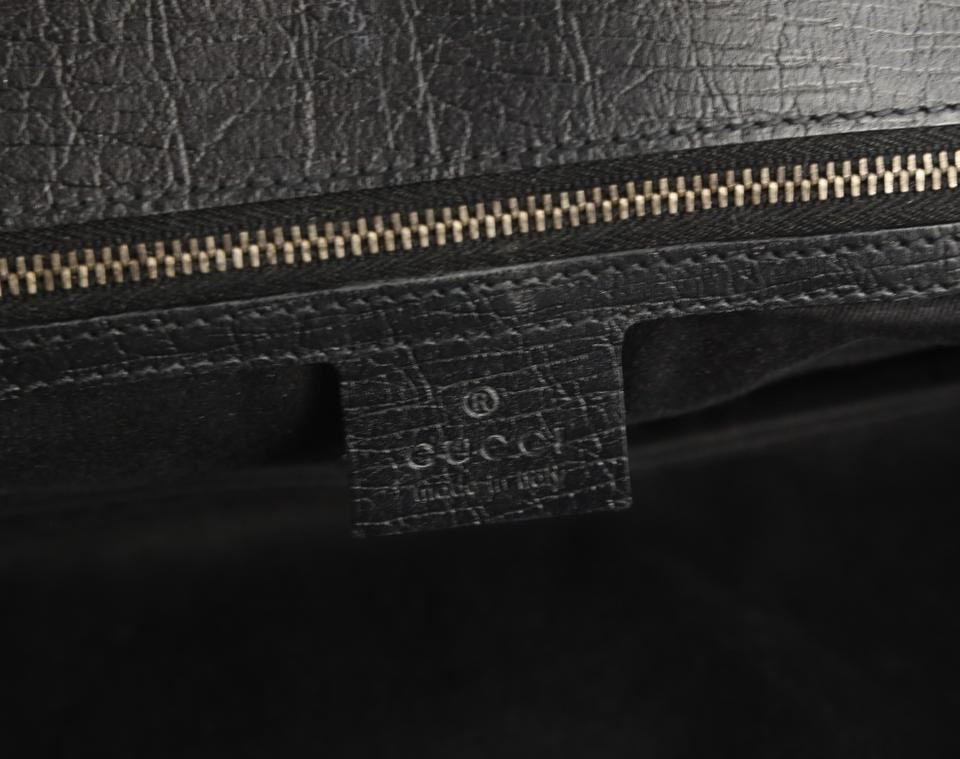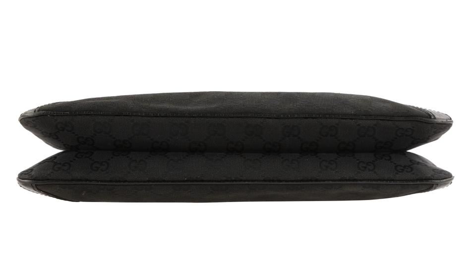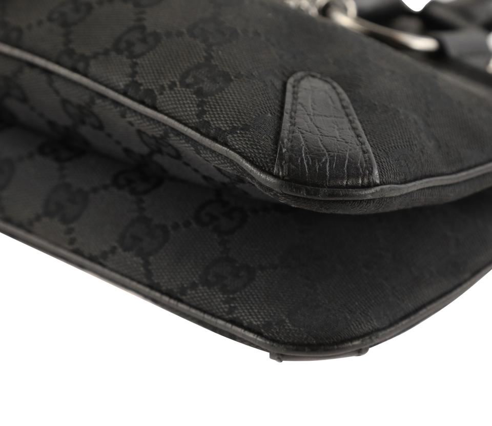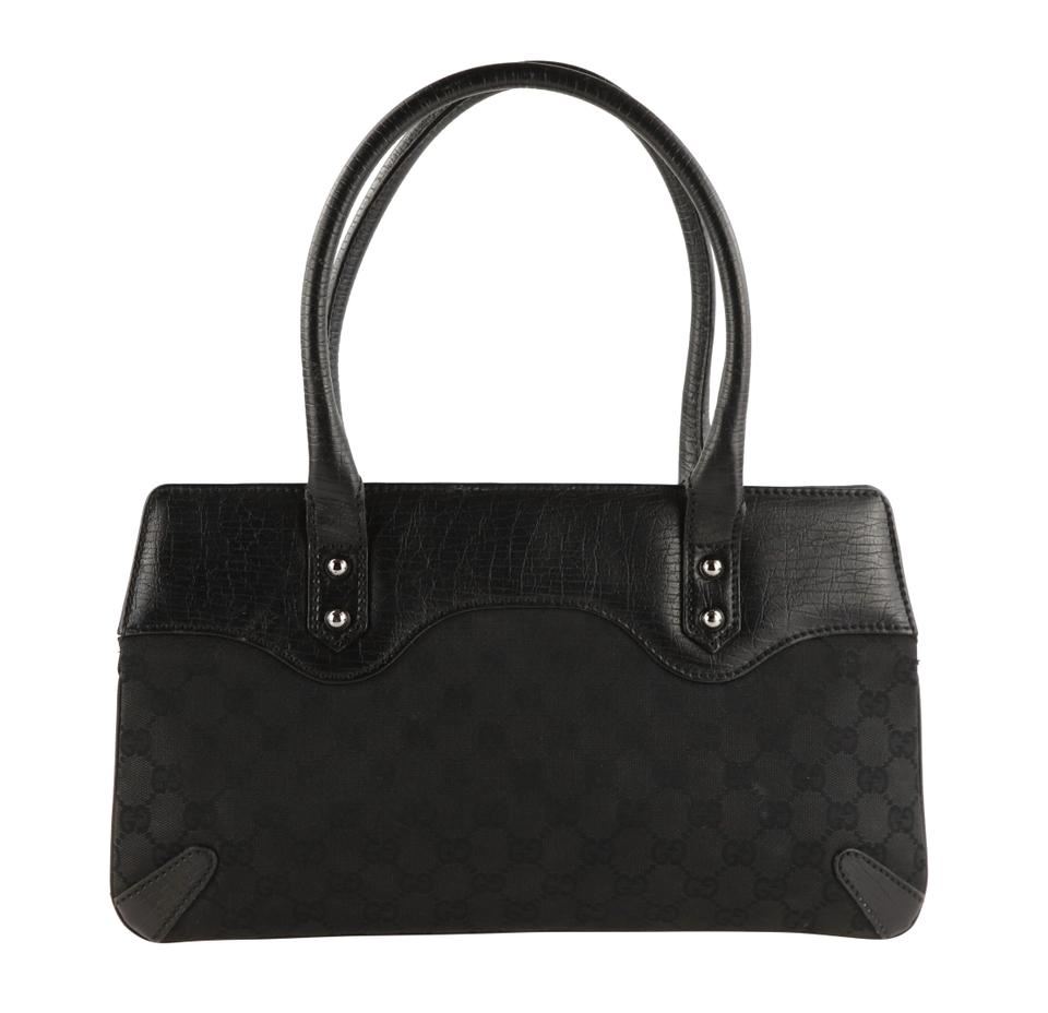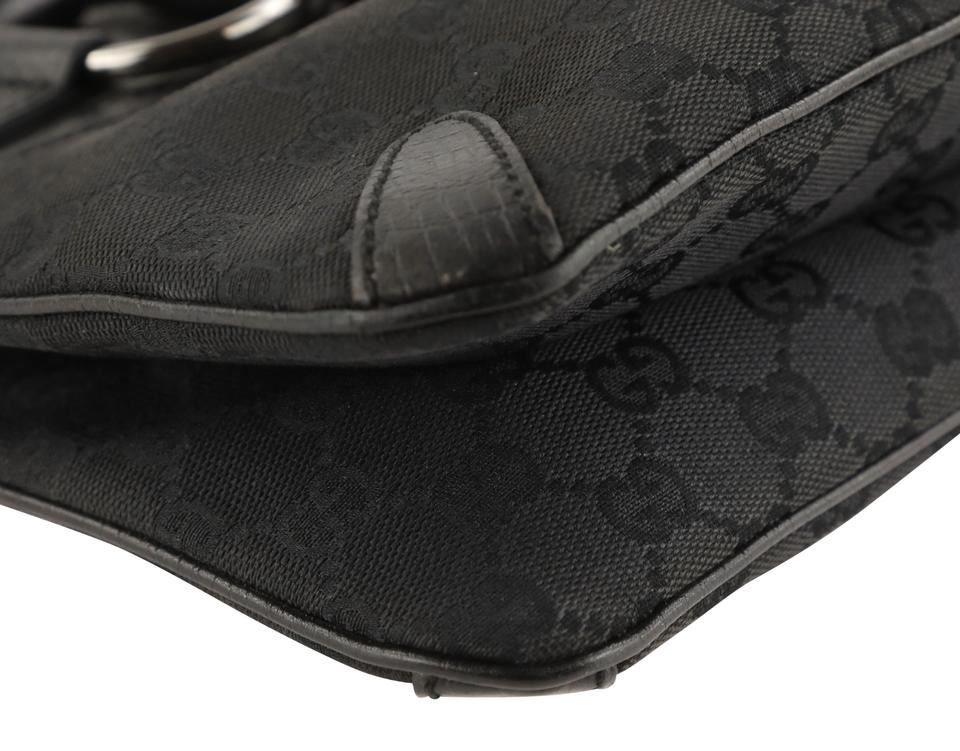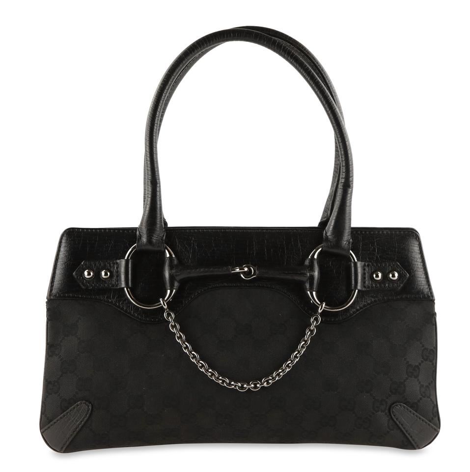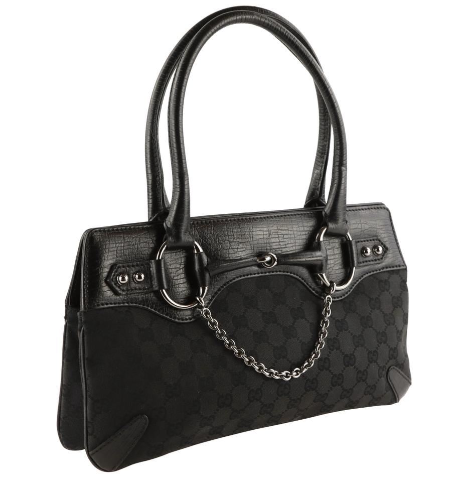 One Gucci Horsebit Chain Shoulder Bag Black Gg Canvas Tote. Gucci Horsebit Chain Shoulder Bag Handle drop . " Bag can be worn over the shoulder or carried by the handles Black monogram canvas exterior Textured leather trim and handles Black fabric interior lining Top center snap closure Silver-tone hardware One interior zippered pocket Made In Italy