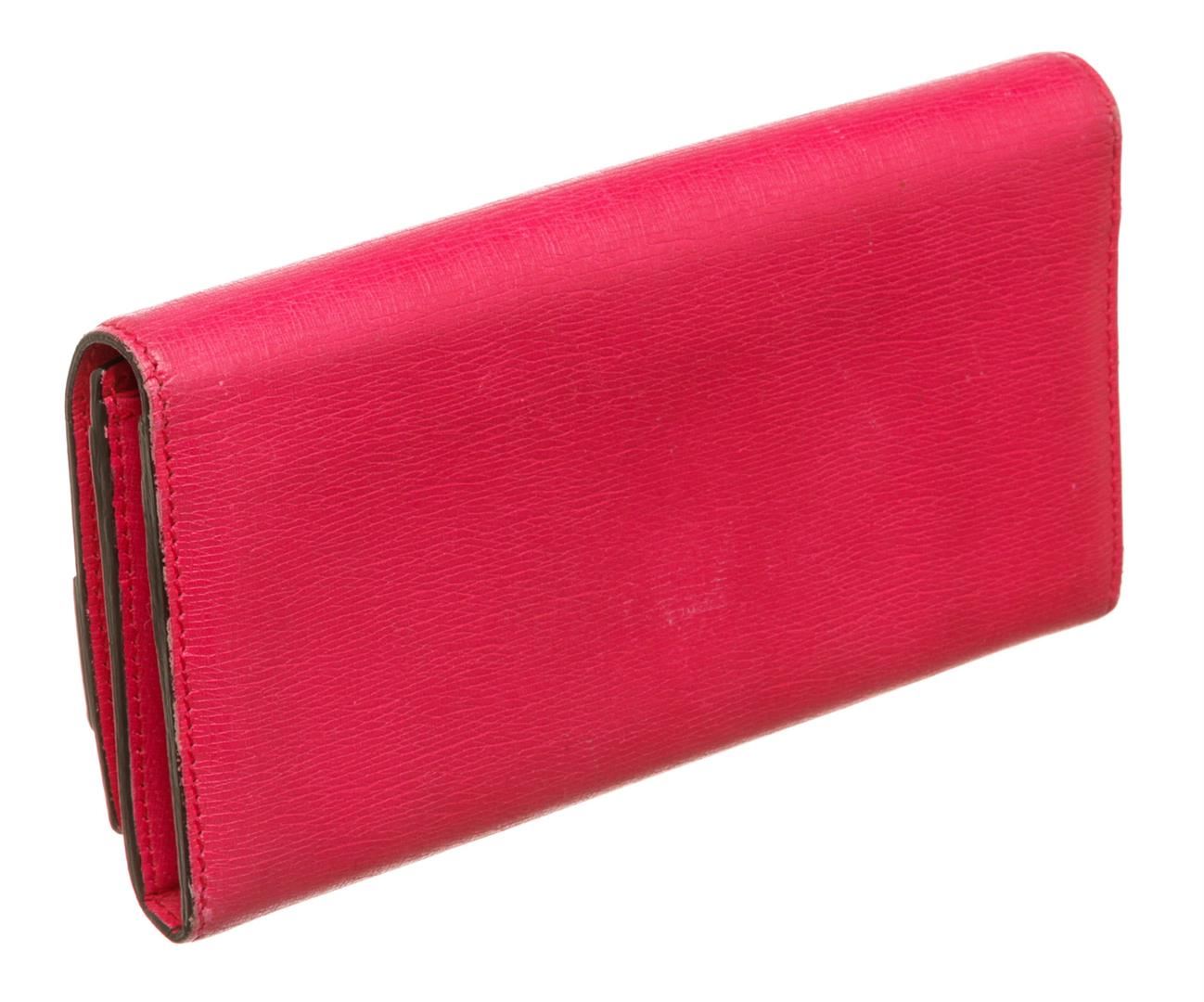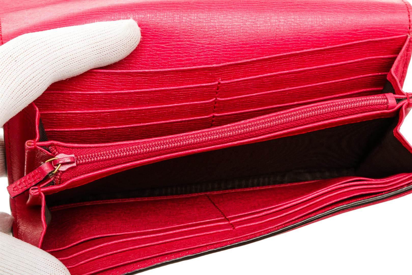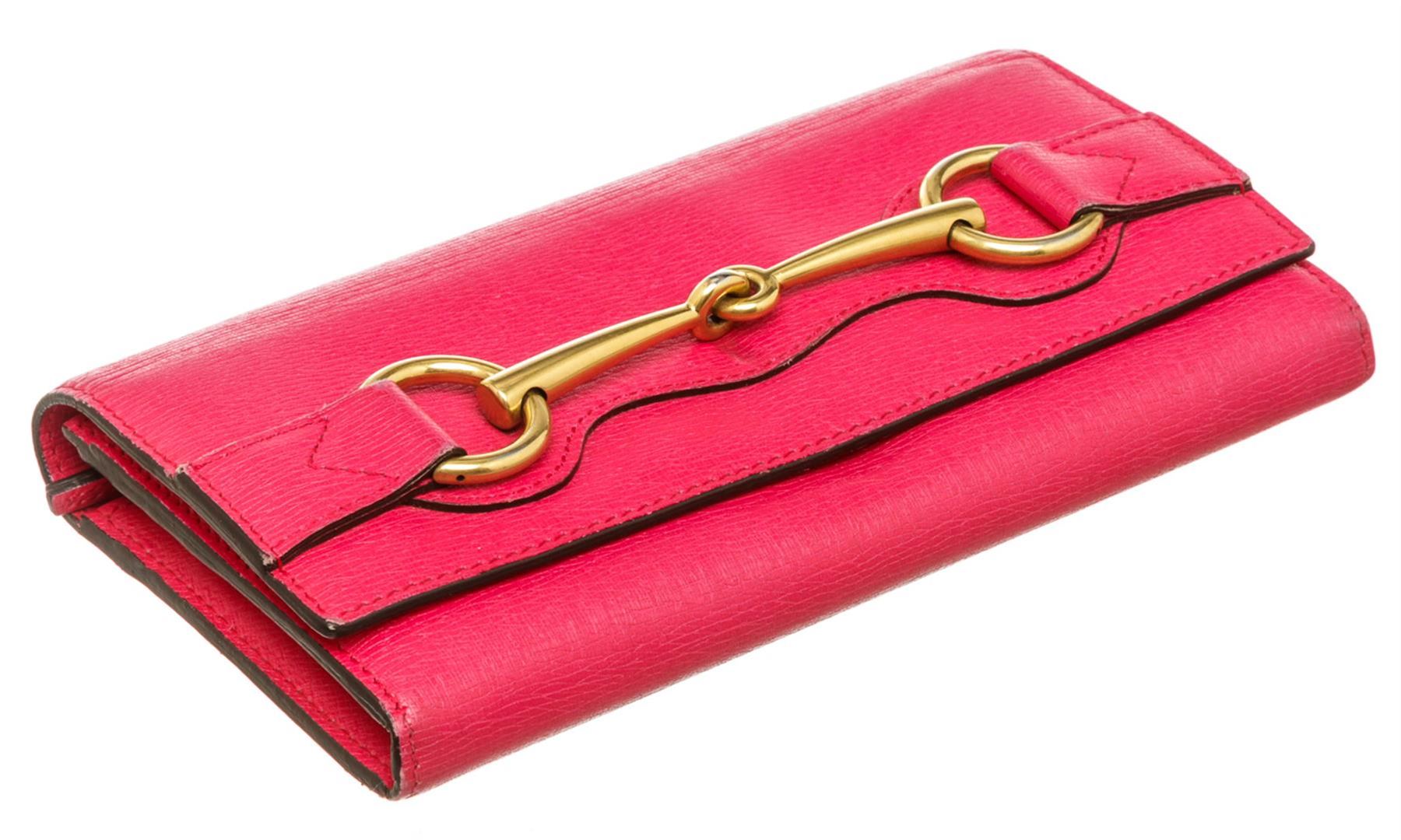 Hot Pink leather Gucci Bright Bit wallet with antiqued gold-tone hardware, Horsebit embellishment at front, single slit under front flap, tonal leather and woven lining, three compartments; one with zip closure, dual bill compartments, twelve card slots and snap closure at front flap. Authentic.