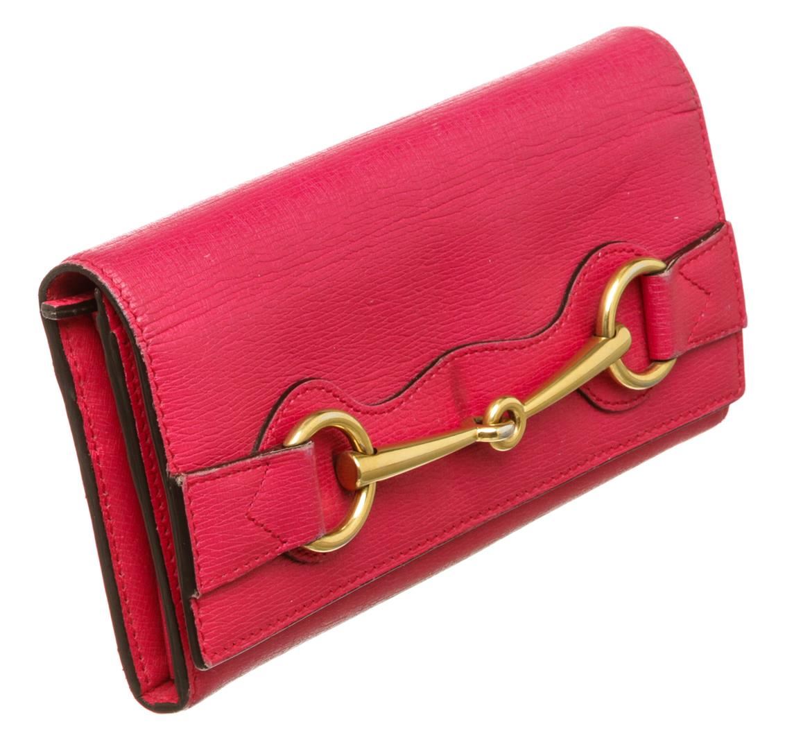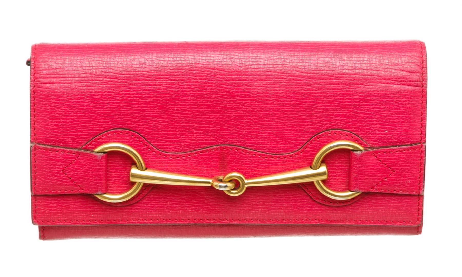 Hot Pink leather Gucci Bright Bit wallet with antiqued gold-tone hardware, Horsebit embellishment at front, single slit under front flap, tonal leather and woven lining, three compartments; one with zip closure, dual bill compartments, twelve card slots and snap closure at front flap. Authentic.