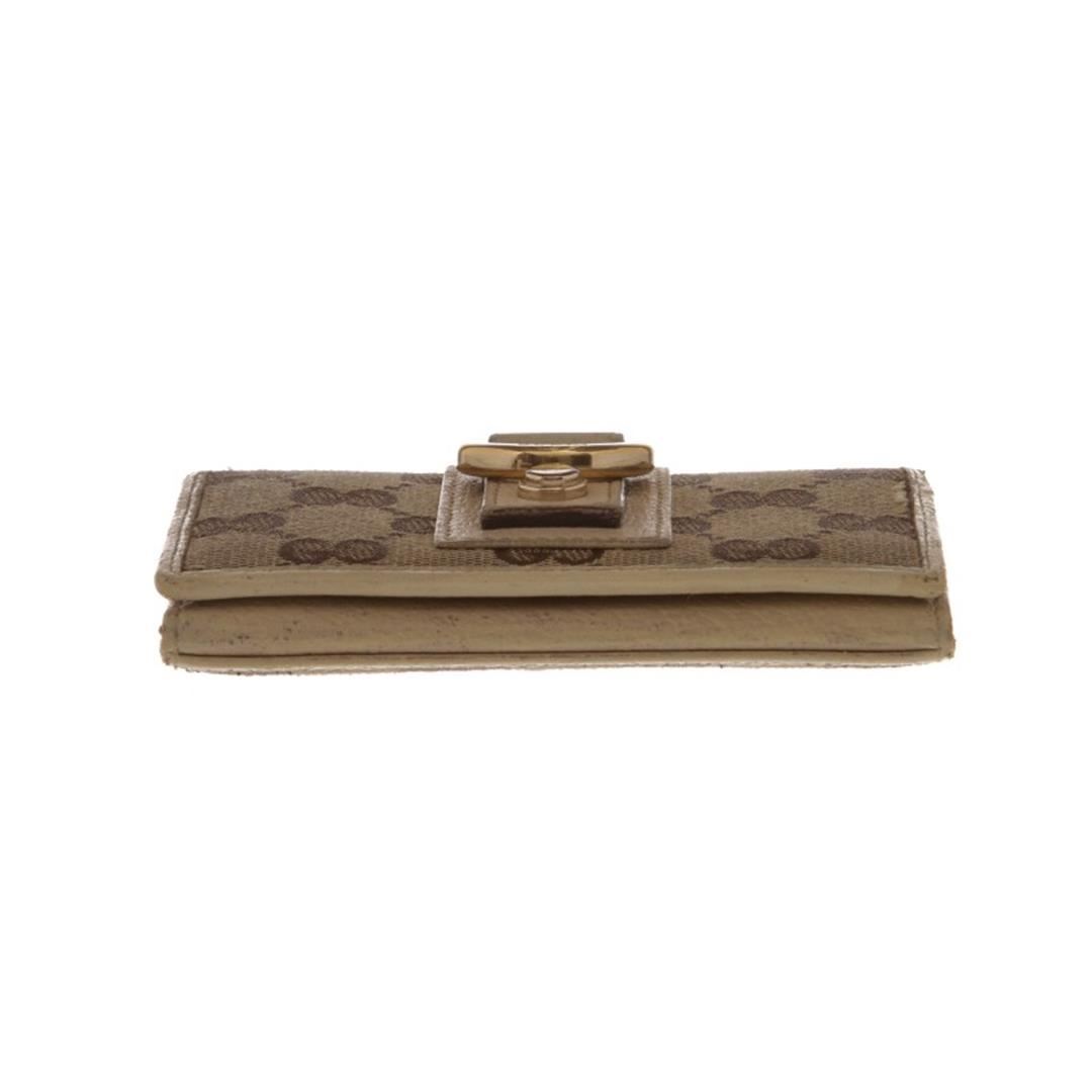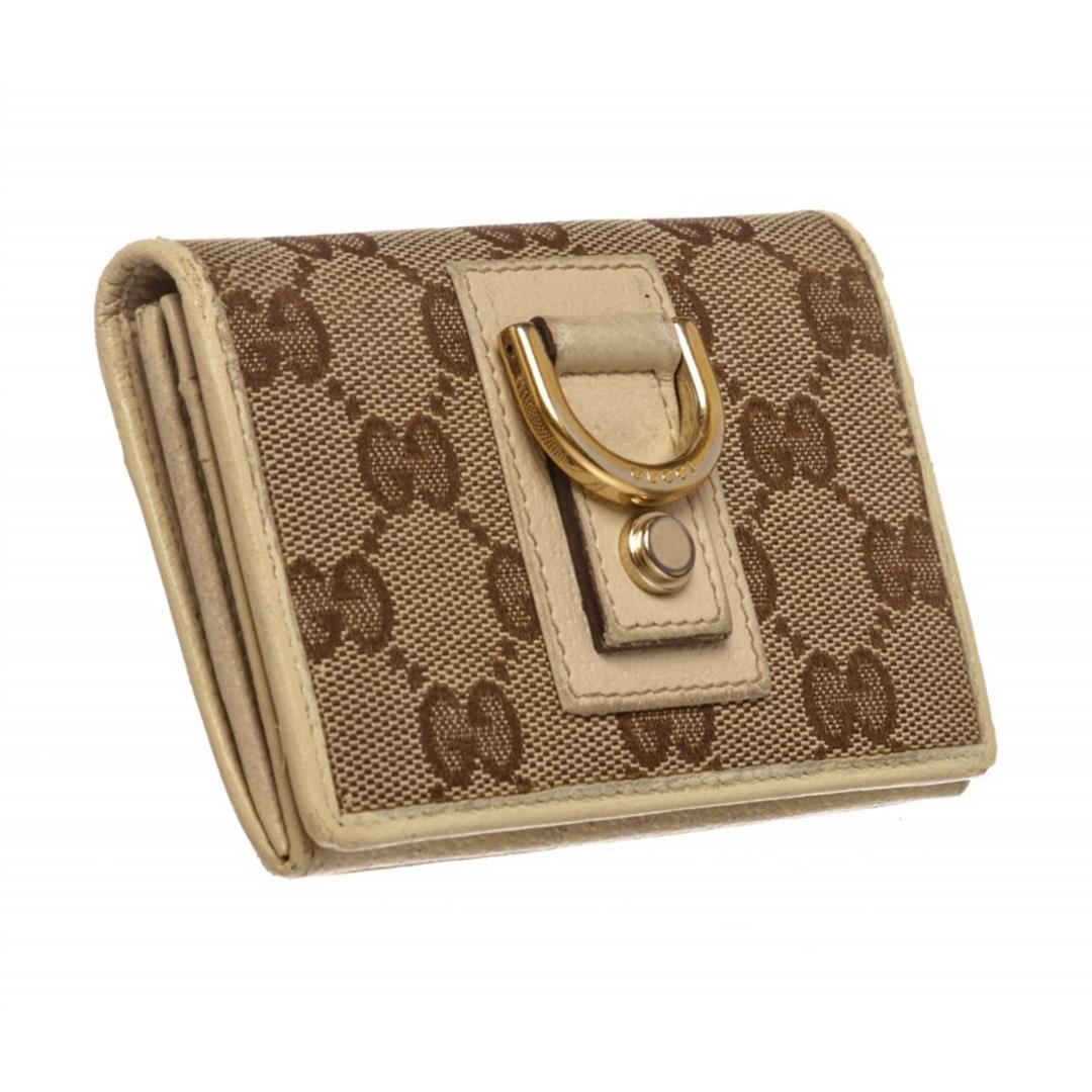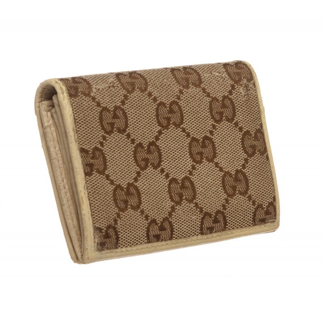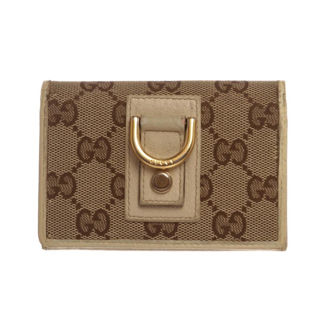 One Gucci Ivory Brown Canvas Monogram Bi-fold Wallet. Gucci ivory brown canvas leather monogram bi-fold wallet contains zipper coin pouch, four credit cardip pockets and two compartment. Exterior contains gold-tone D-ring embellishment.