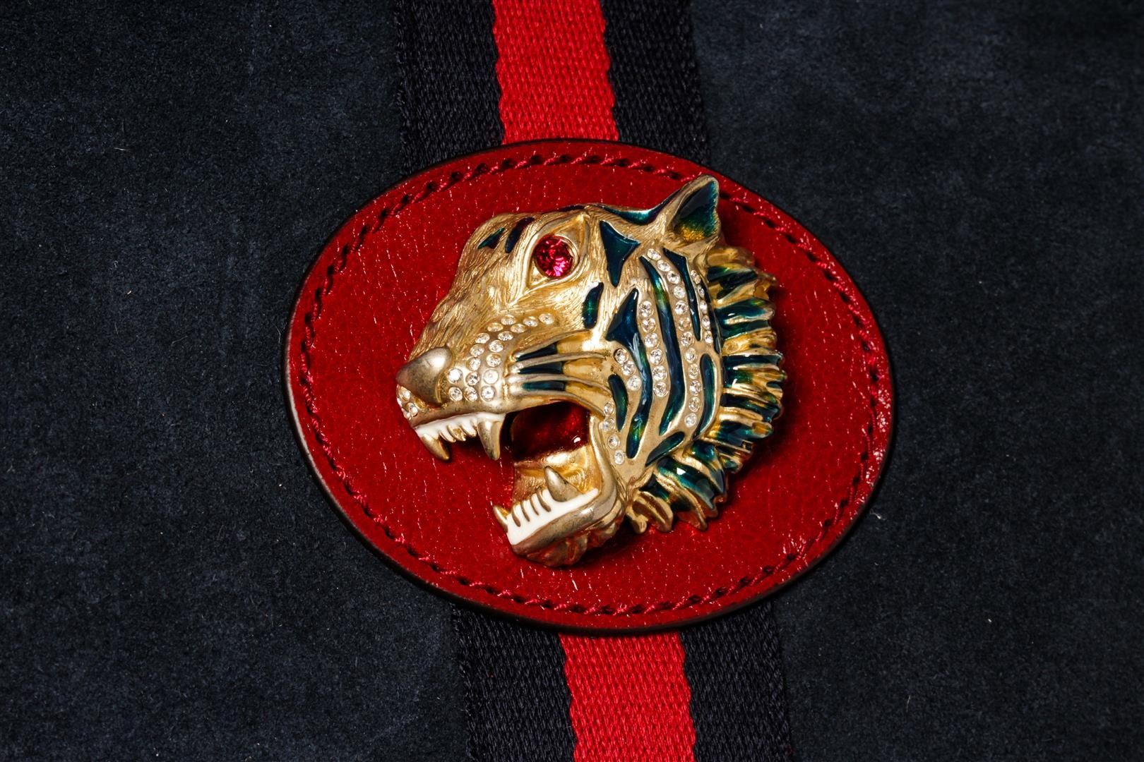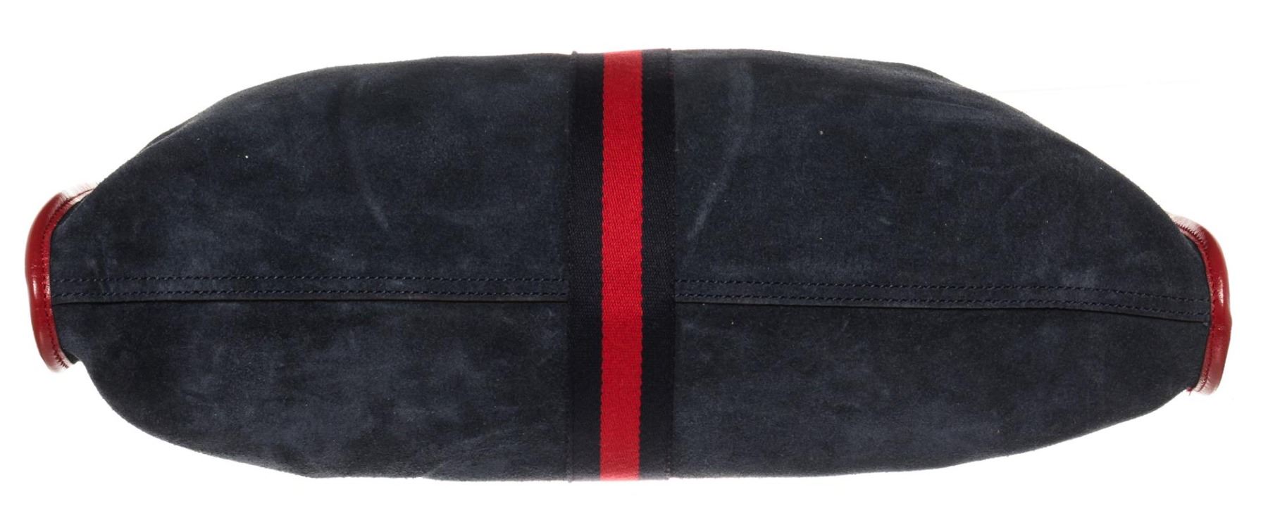 One Gucci Large Rajah Tote. Item is sold AS-IS. All available information is listed in the description and shown in the photo. Gucci Large Rajah Tote Navy Suede Red Leather. Features gold hardware, red leather straps, blue leather interior, and a gold zipper closure.