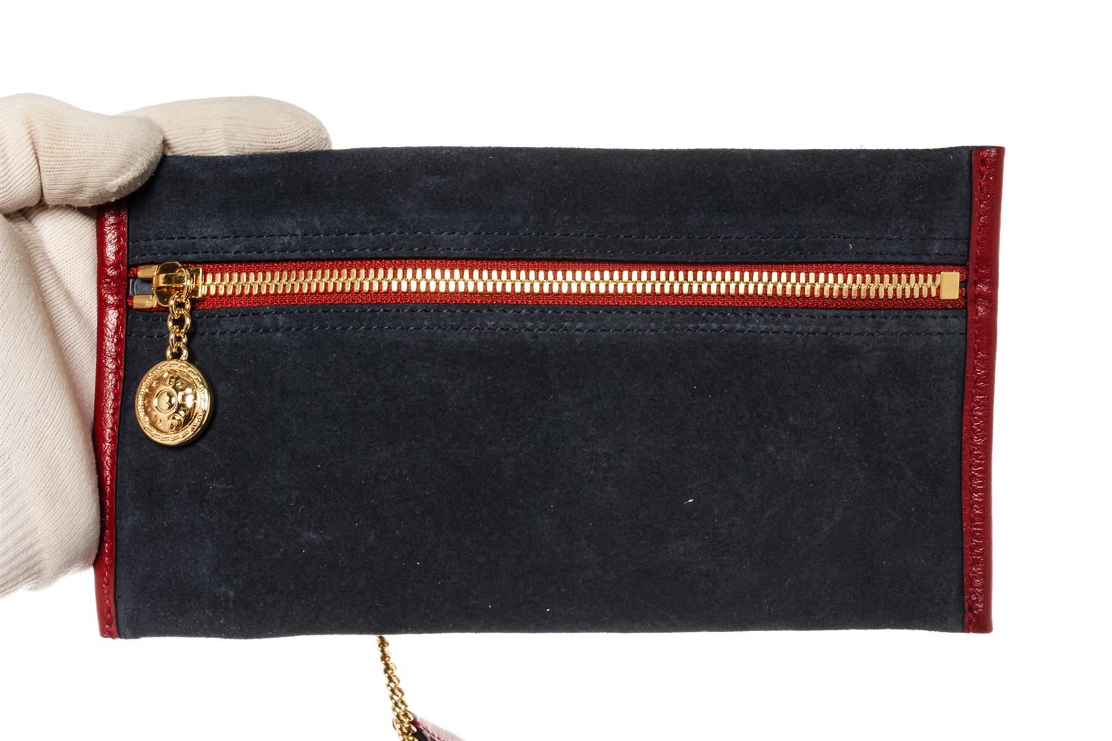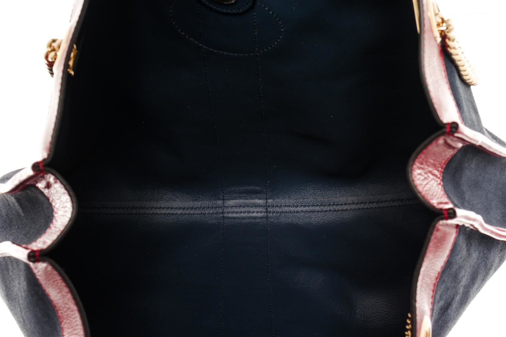 One Gucci Large Rajah Tote. Item is sold AS-IS. All available information is listed in the description and shown in the photo. Gucci Large Rajah Tote Navy Suede Red Leather. Features gold hardware, red leather straps, blue leather interior, and a gold zipper closure.