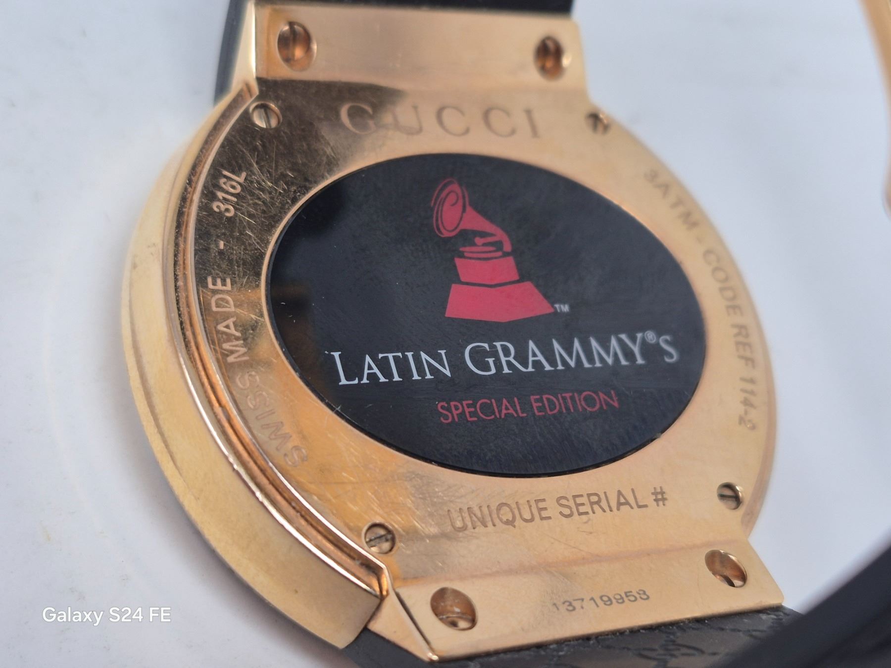 Gucci Special Edition wristwatch commemorating the Latin Grammy Awards. Black rubber strap with gold-tone stainless steel case. Marked "SWISS MADE - 316L", "GUCCI", "LATIN GRAMMY’S SPECIAL EDITION", and "13719858".