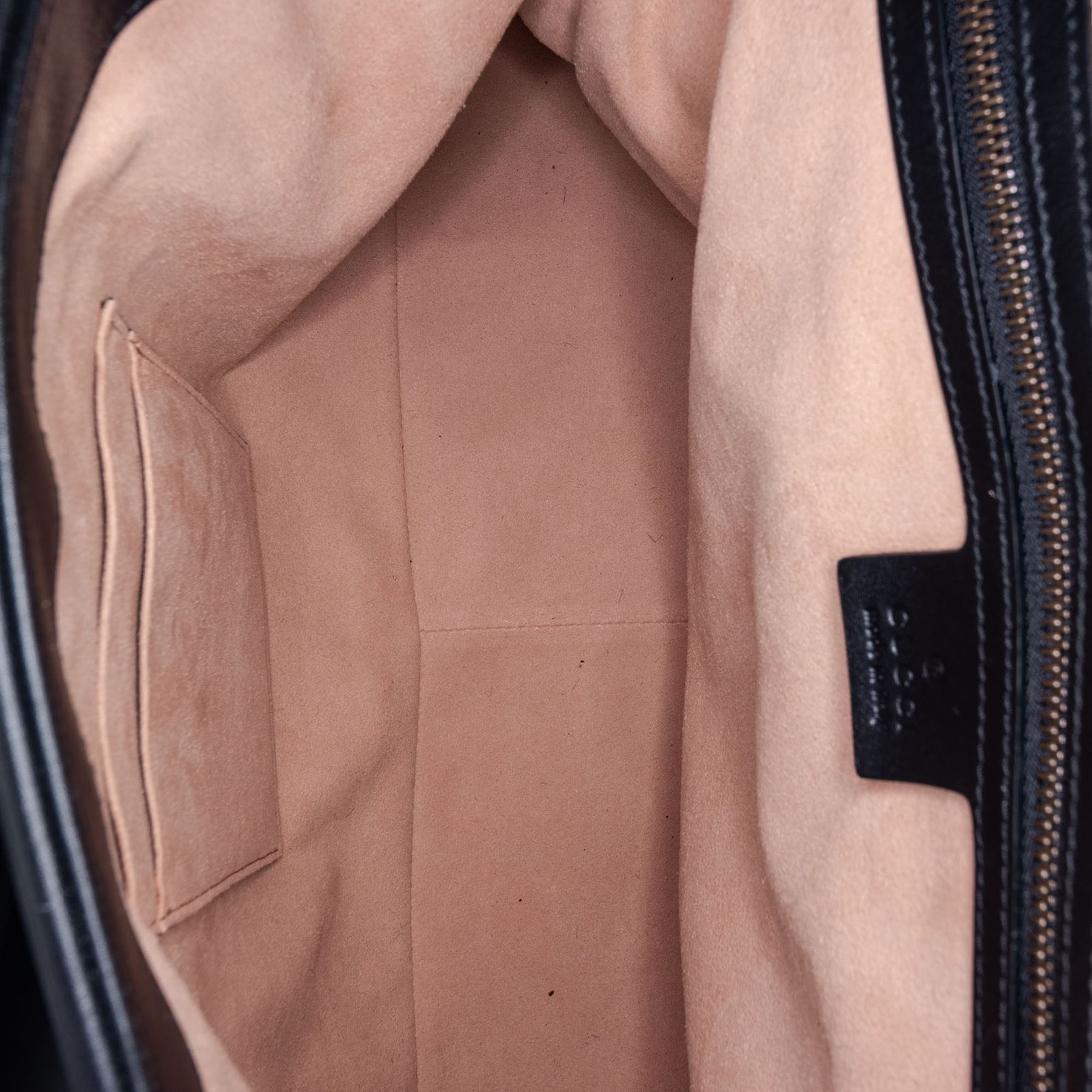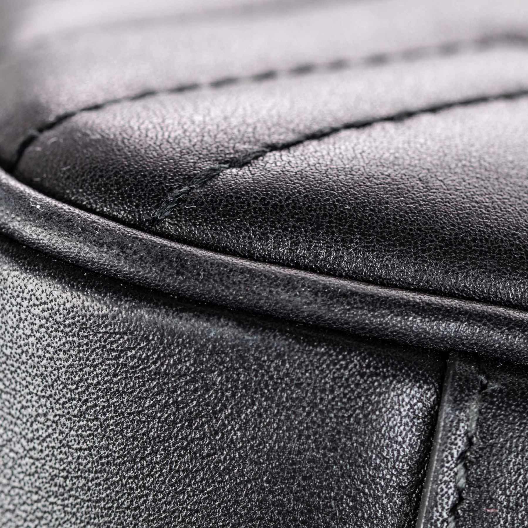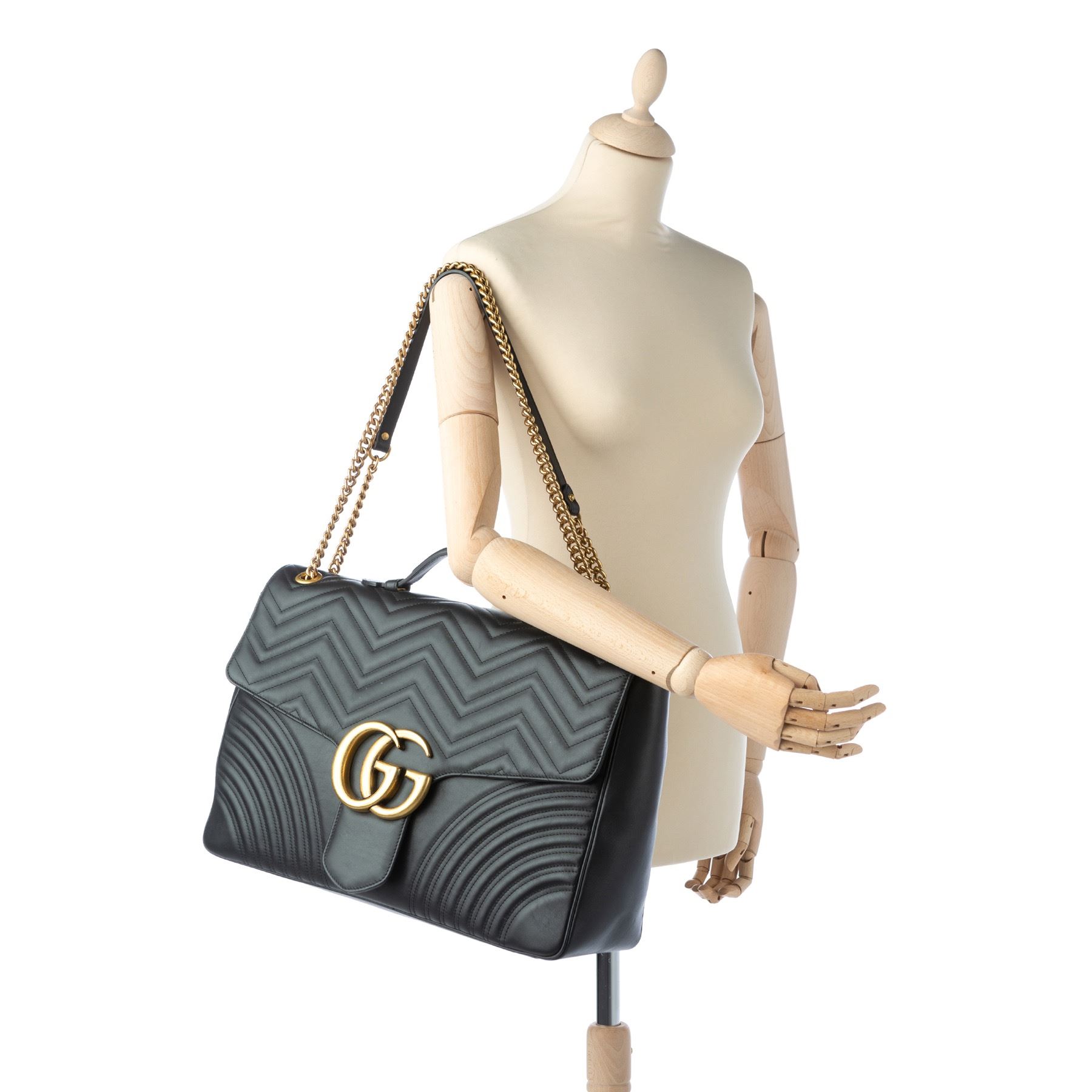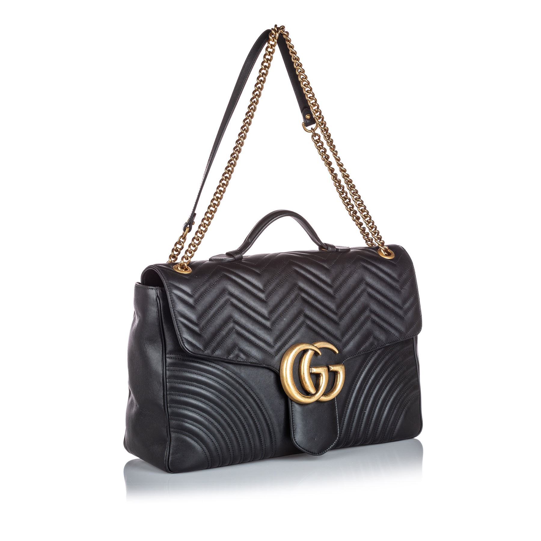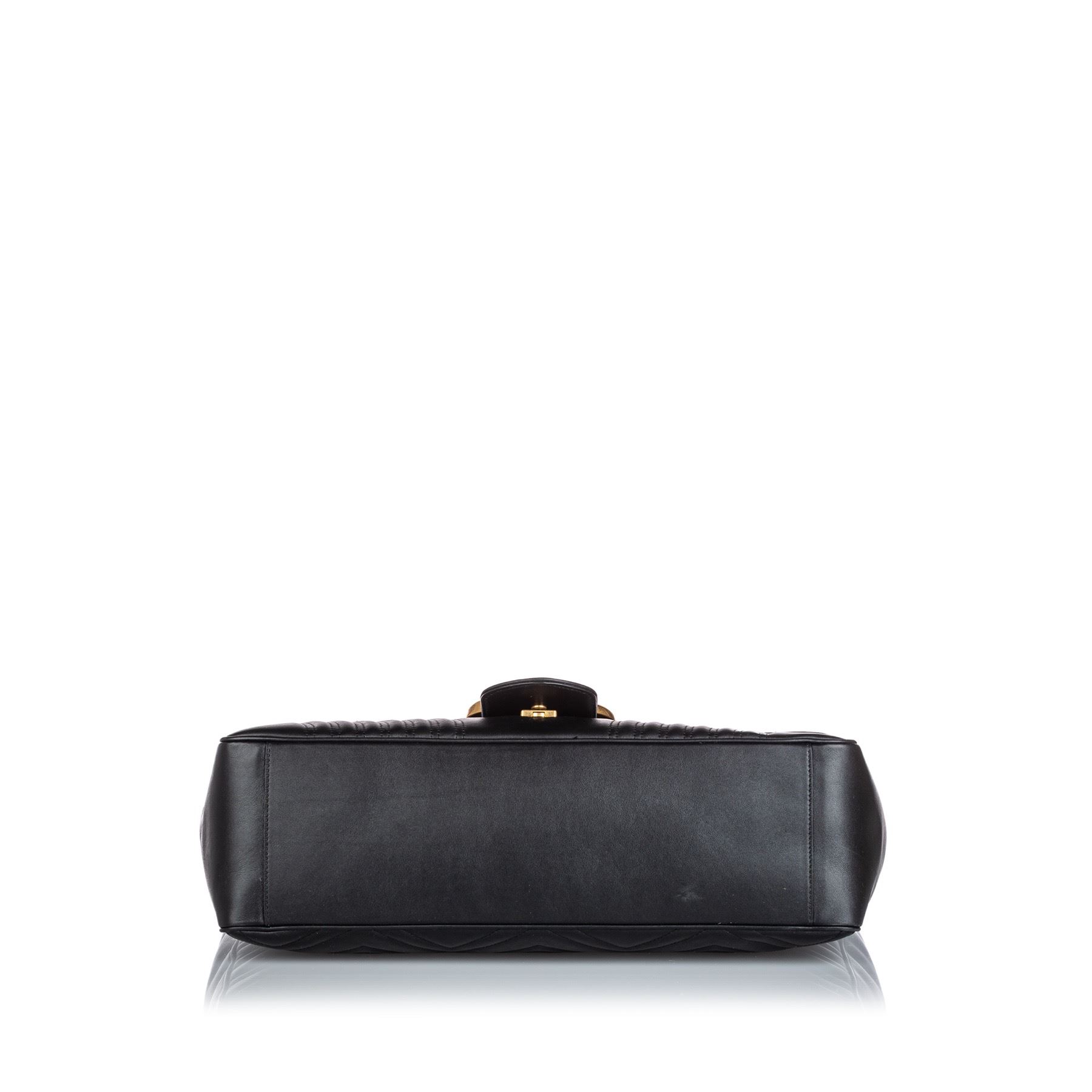 The Maxi Marmont Satchel features a quilted leather body, a flat leather top handle, a curb chain strap, a front flap with a magnetic snap button closure, and interior zip and slip pockets. Leather x Others Black Exterior front is scratched. Exterior bottom is scratched. Exterior handle is scratched. Interior lining is stained with transfer of color, discolored and scratched. Buckle is tarnished and scratched. Lock is tarnished and scratched. Size: 42 x 25 x 12 Card: NO Made in: ITALY