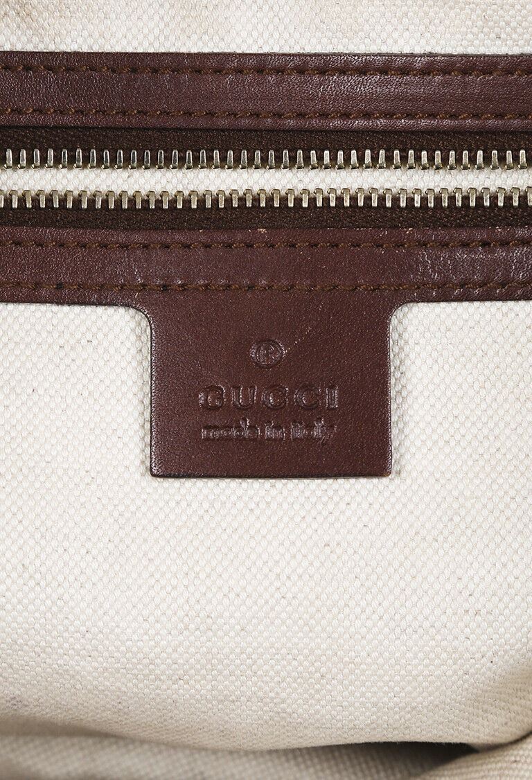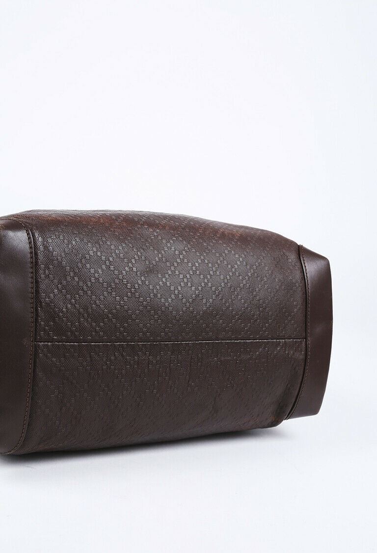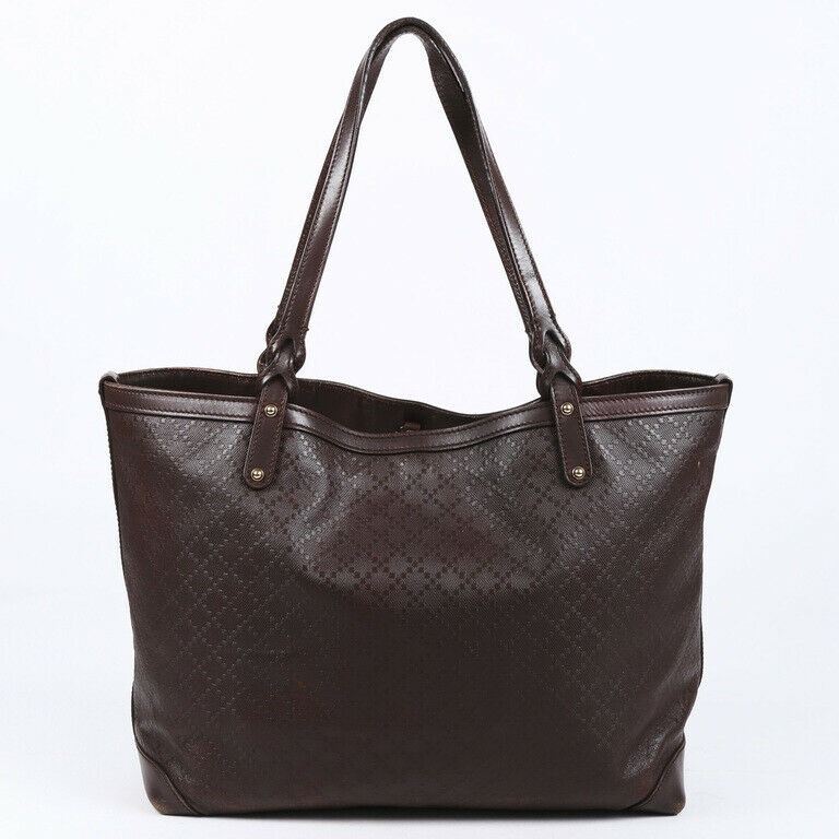 Description: Gucci Craft Diamante Tote Bag. Gucci Craft tote bag is crafted from Diamante coated canvas and features leather trim, gold tone hardware, dual straps, a clasp closure, and a canvas interior with pockets.