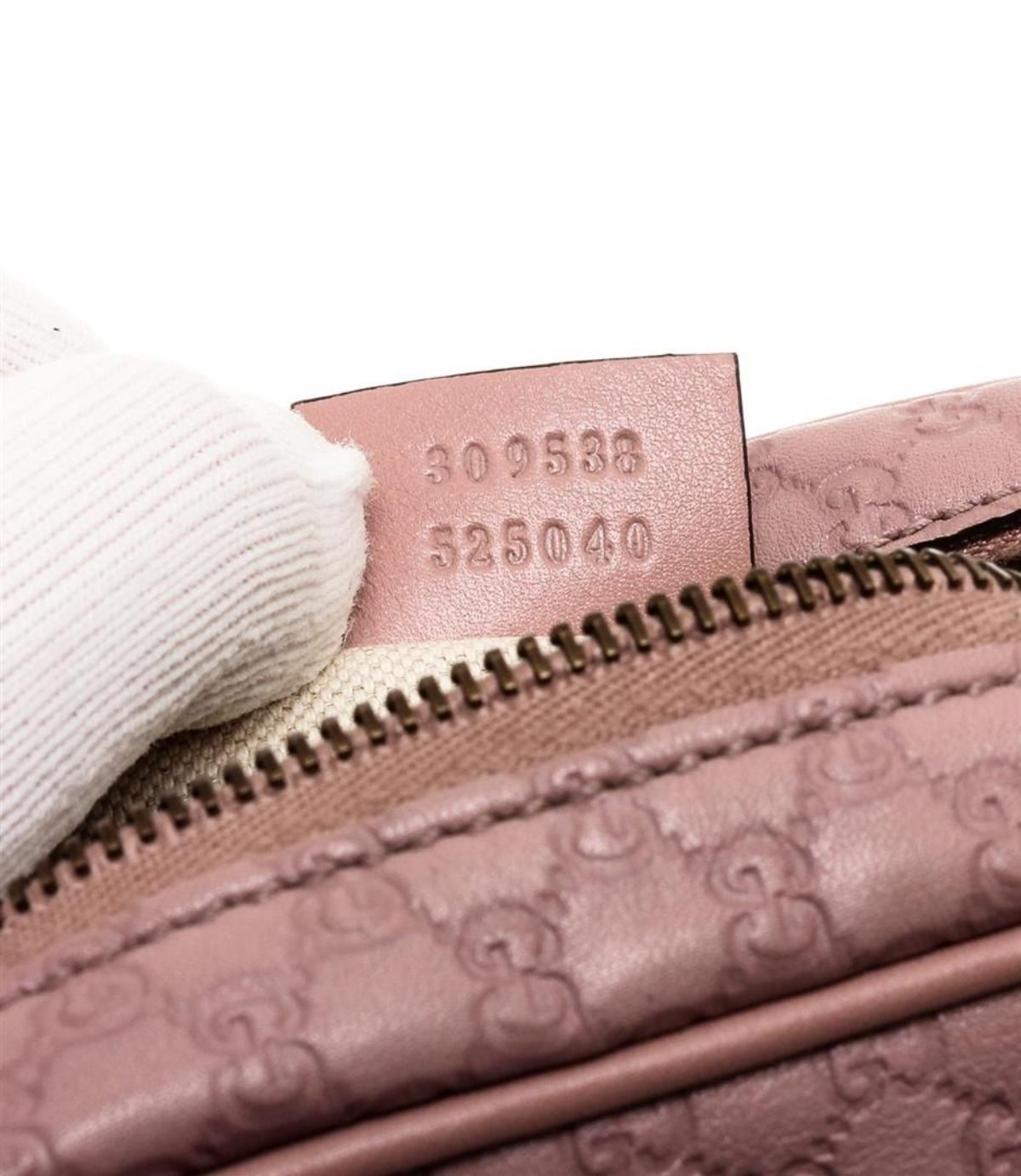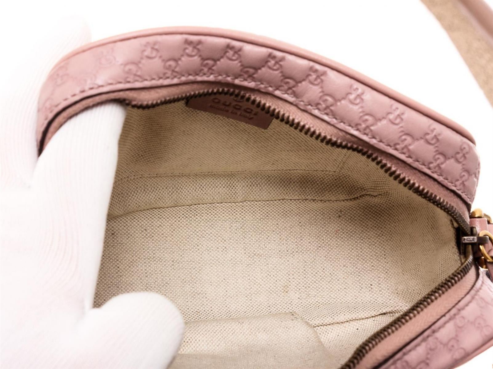 One Gucci Mauve Microguccissima Sunshine Disco Crossbody Bag. Gucci mauve Microguccissima Sunshine Disco crossbody bag with gold-tone hardware, cream canvas lining, interior slip pocket, zip around closure, adjustable leather strap, and bamboo tassel.