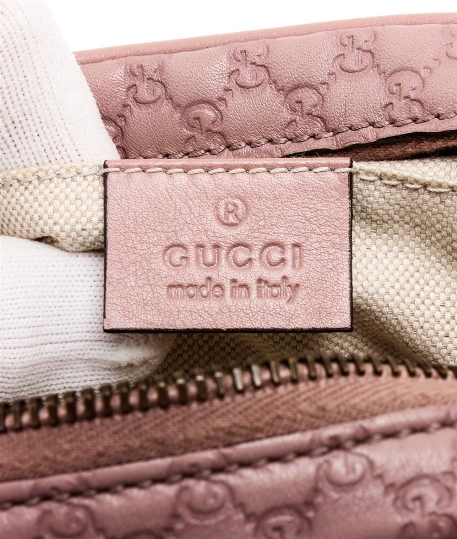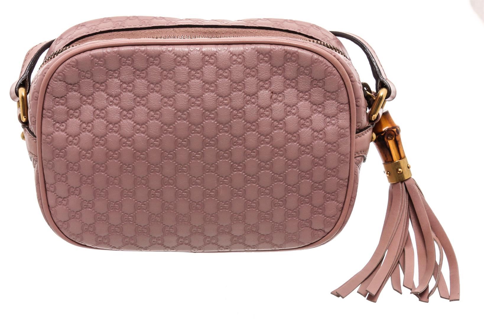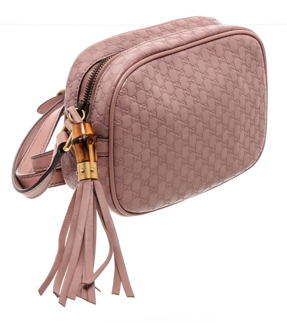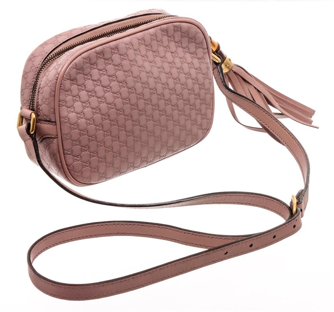 One Gucci Mauve Microguccissima Sunshine Disco Crossbody Bag. Gucci mauve Microguccissima Sunshine Disco crossbody bag with gold-tone hardware, cream canvas lining, interior slip pocket, zip around closure, adjustable leather strap, and bamboo tassel.