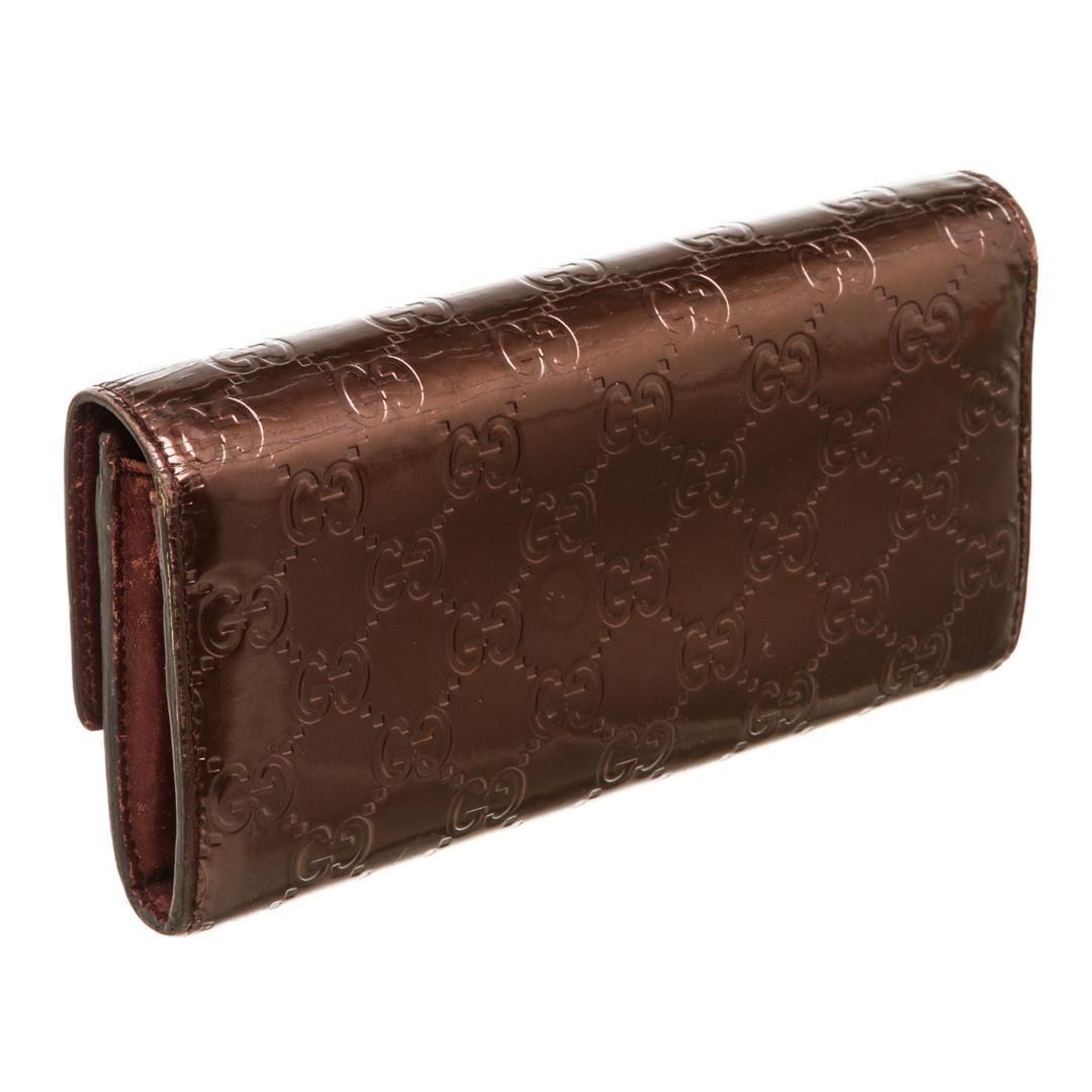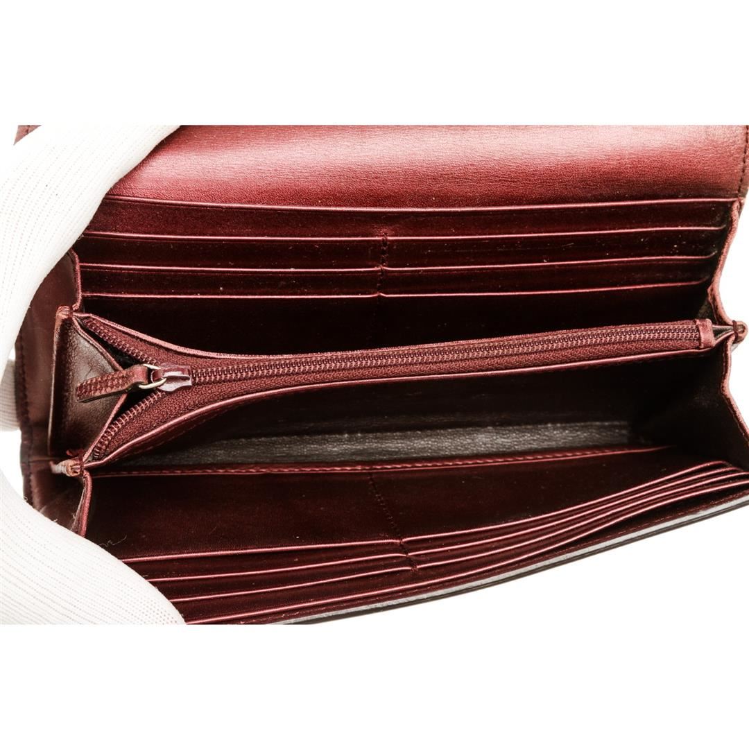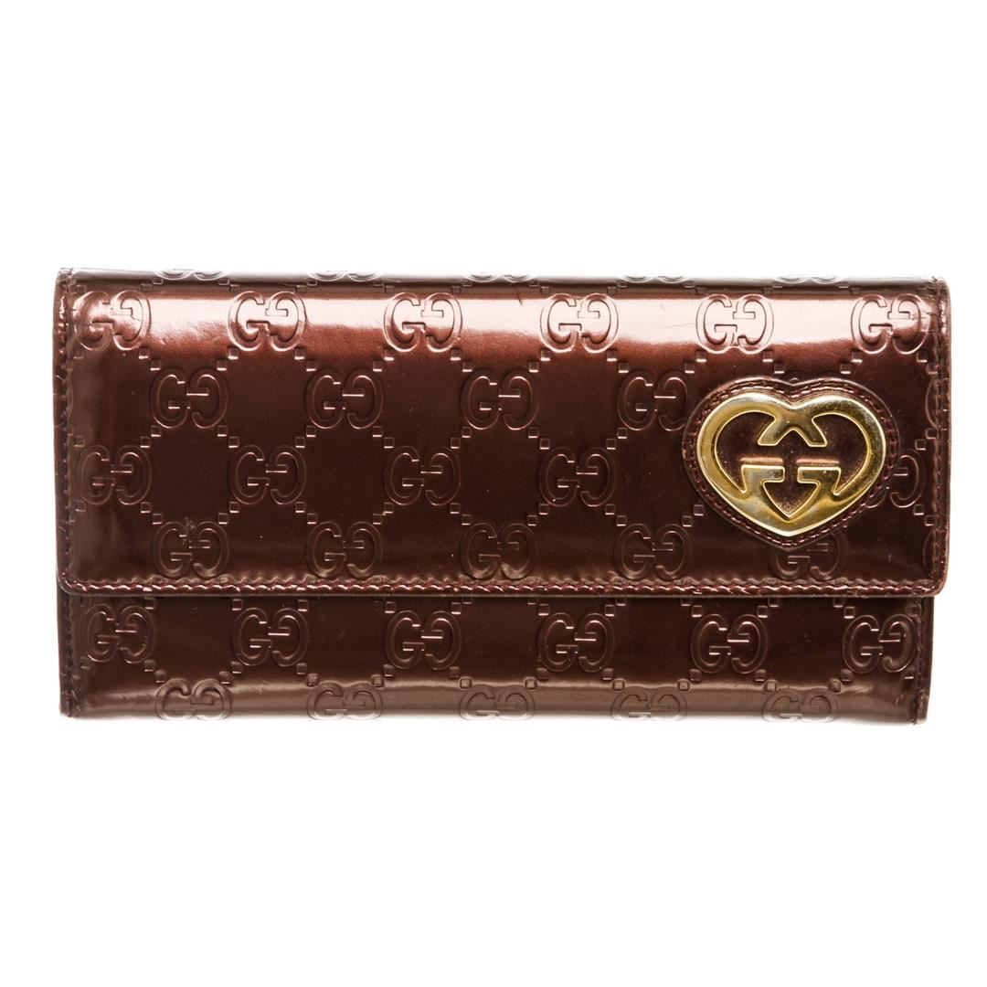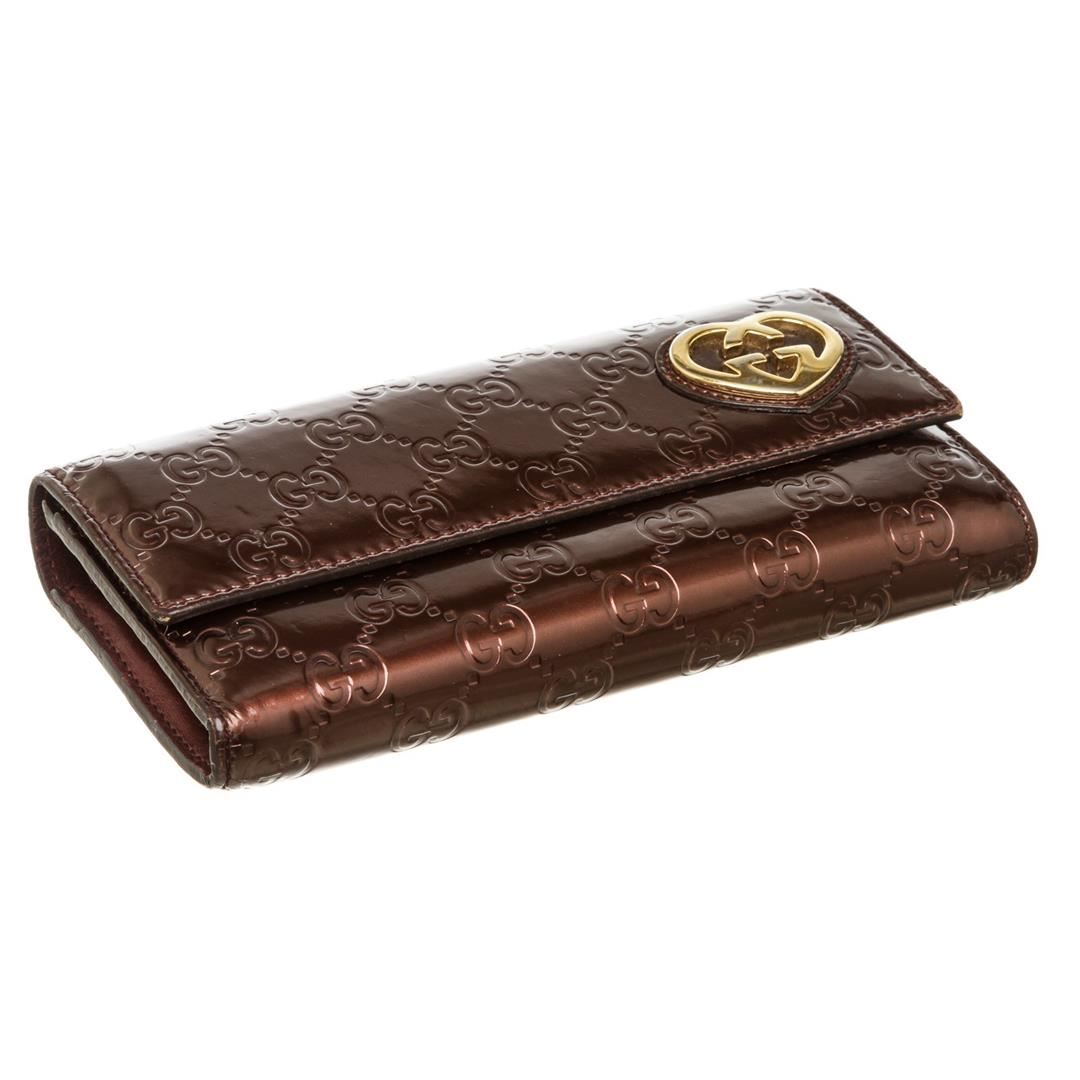 Metallic Burgundy Patent leather Gucci Interlocking GG Heart long wallet with gold-tone hardware, interlocking heart GG adornment at front flap, tonal leather lining, three compartments; one with zip closure, dual bill compartments, twelve card slots and snap closure at front flap. Authentic.