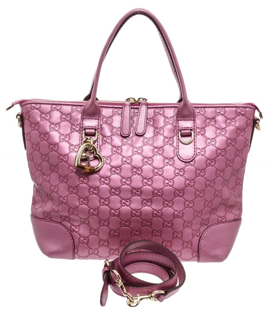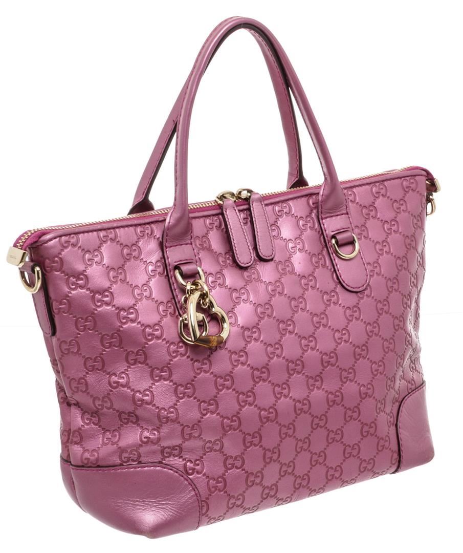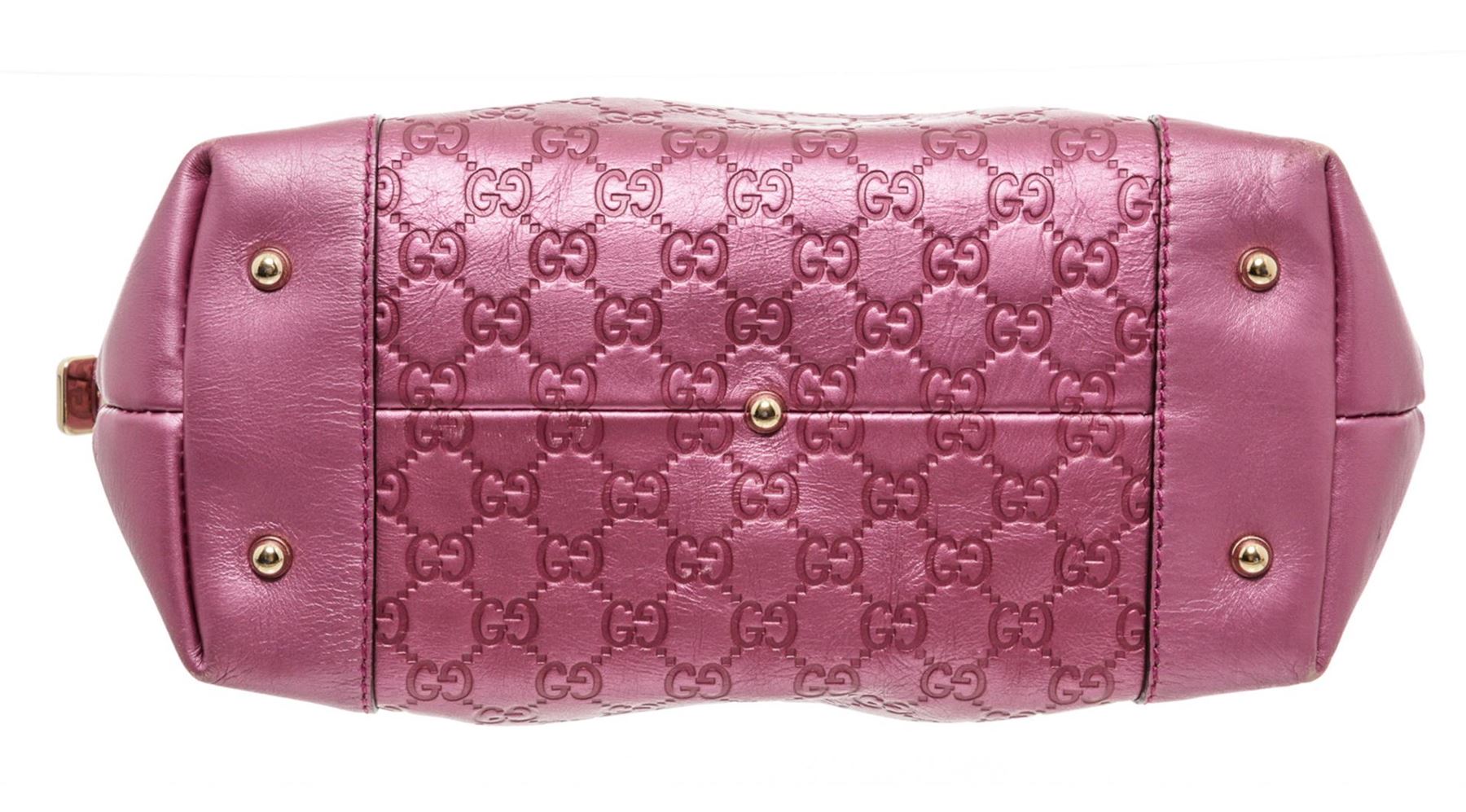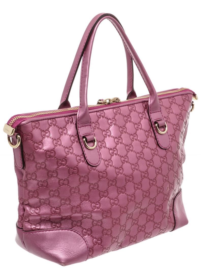 Gucci metallic pink Guccissima leather tote bag with cream canvas lining, dual interior slit pockets, interior zip pocket, zip top closure, dual rolled handles, and optional adjustable leather shoulder strap. Authentic.