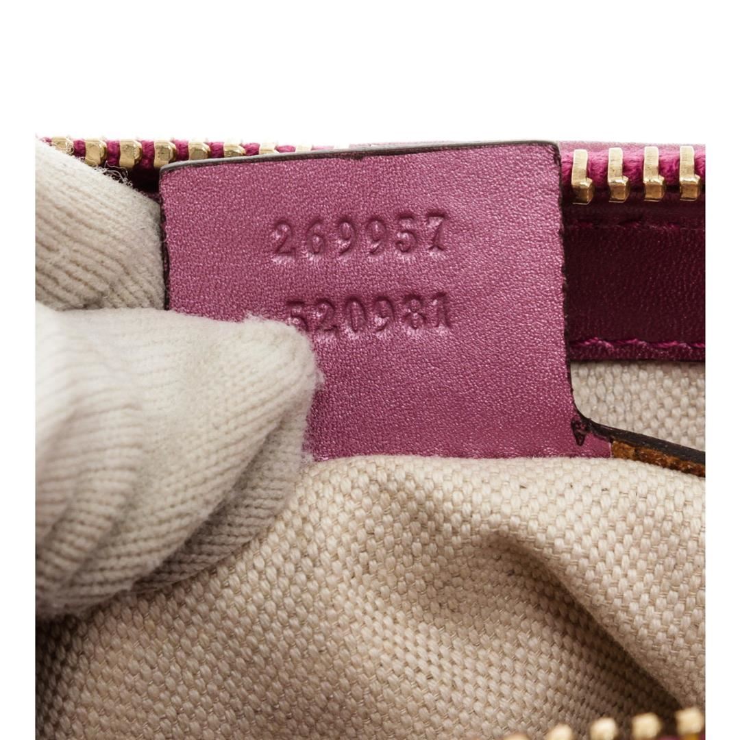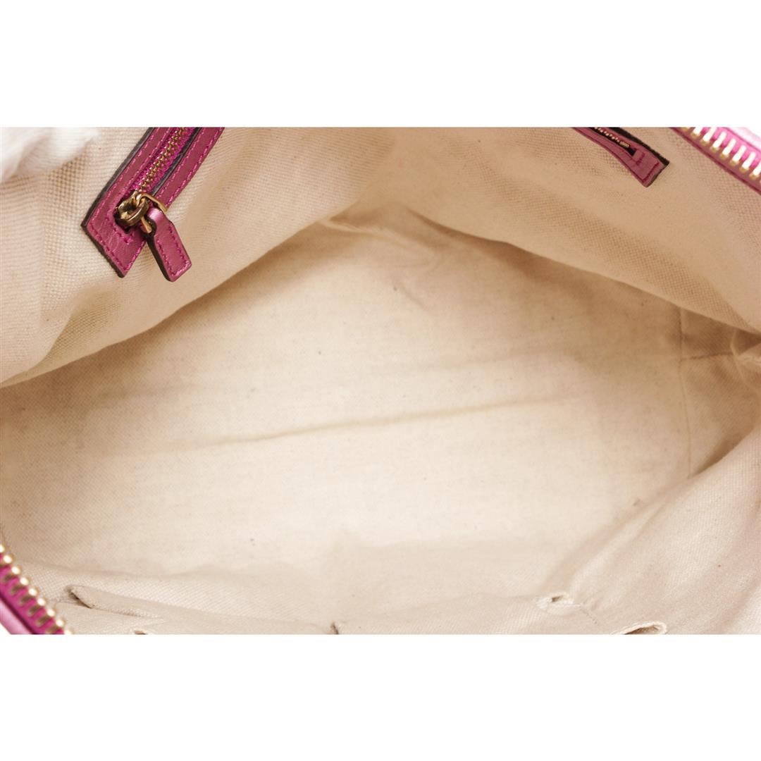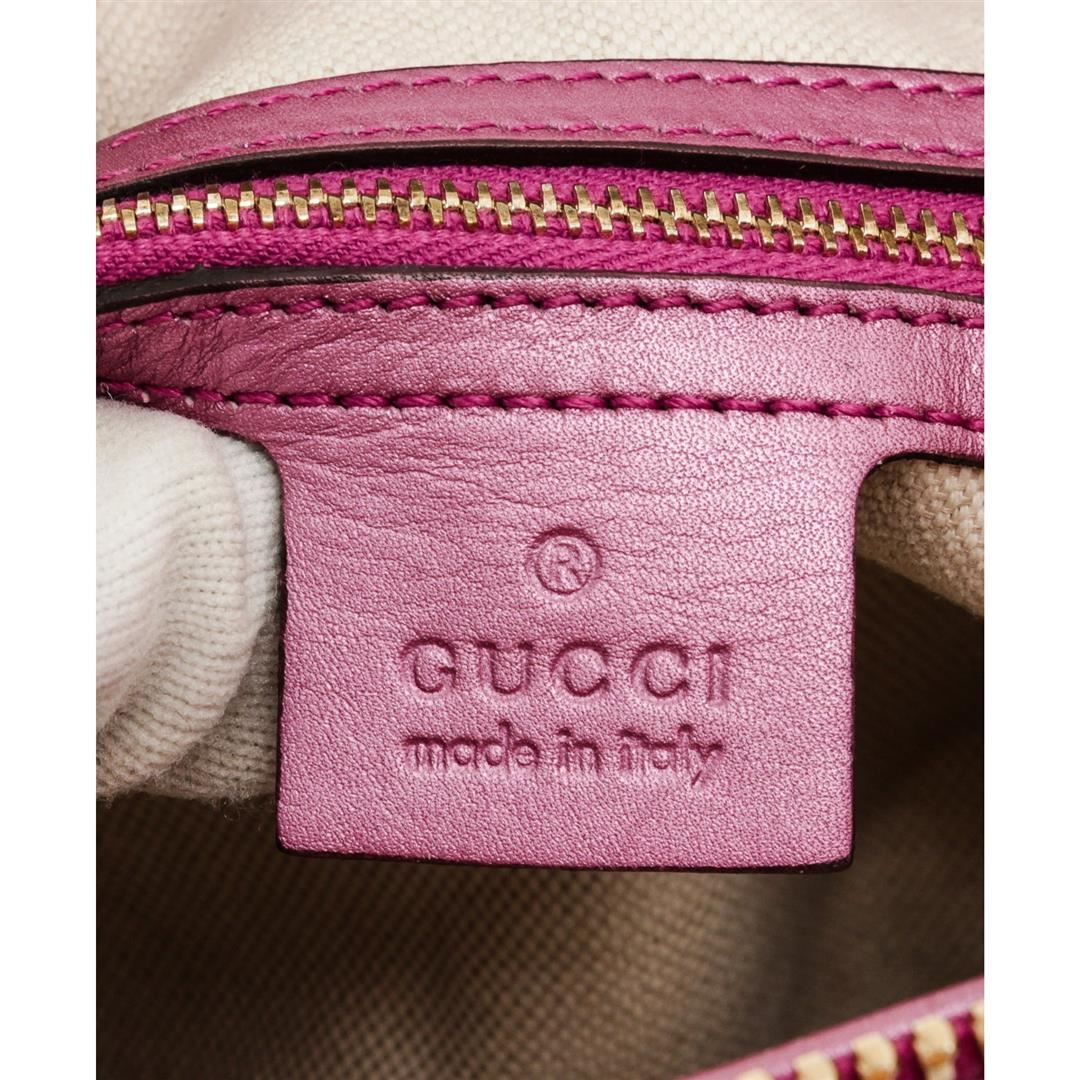 Gucci metallic pink Guccissima leather tote bag with cream canvas lining, dual interior slit pockets, interior zip pocket, zip top closure, dual rolled handles, and optional adjustable leather shoulder strap. Authentic.