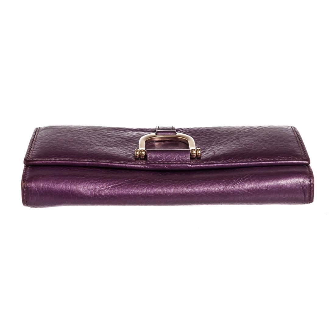Metallic purple leather Gucci horsebit wallet with silver-tone hardware, tonal leather lining, twelve credit card pockets, one open compartment, two bill pockets and one large zipper compartment. Overall flap with button snap closure. Dimensions = 7.5"x.75"x3.75"/19cmx1.9cmx9.5cm. Item is pre-owned.
