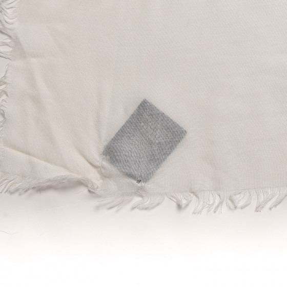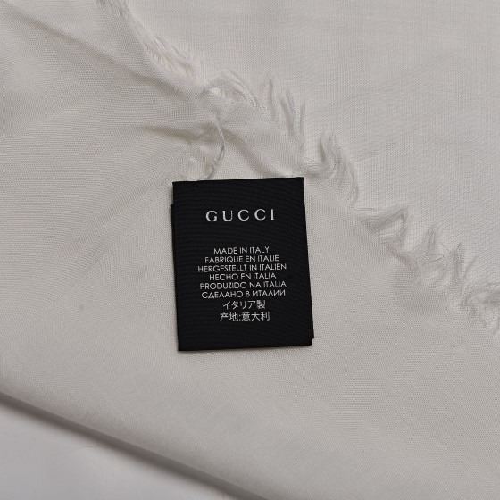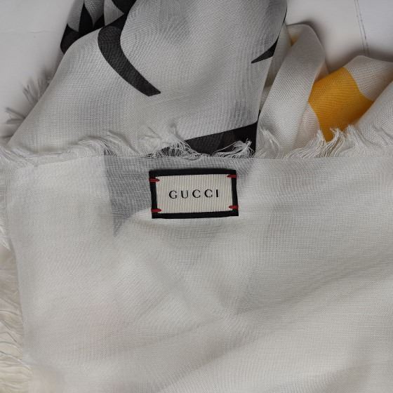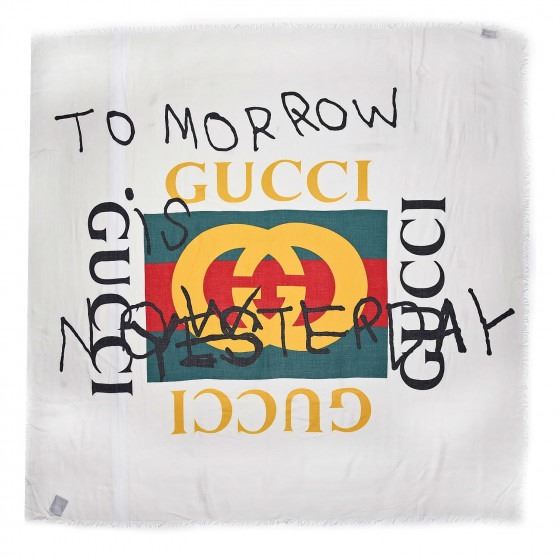White scarf is crafted of 85% modal, and 15% silk. The scarf features a prominent red, green and yellow Gucci GG logo, with "Tomorrow is Not Yesterday" written in black, on a white background.