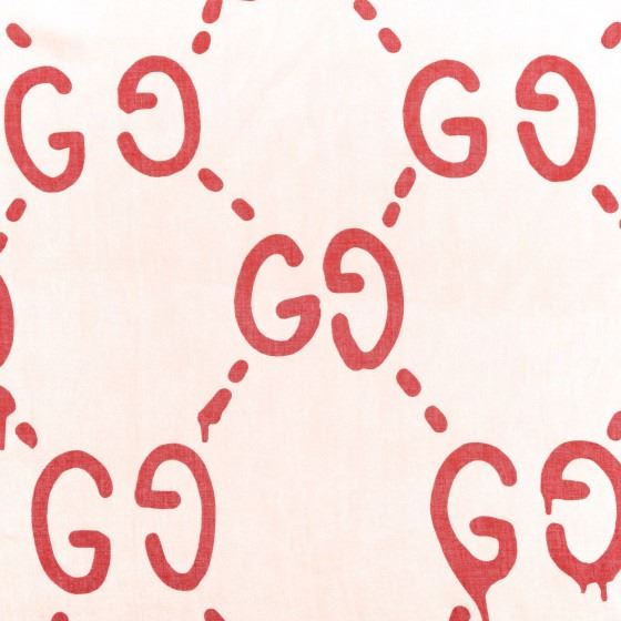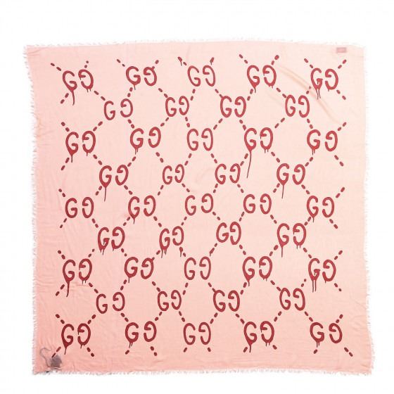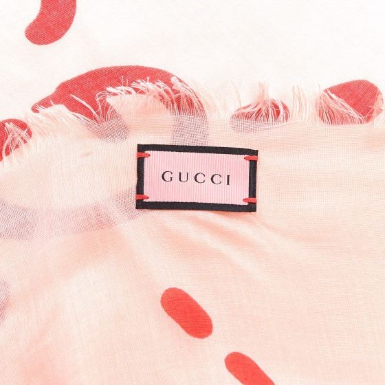 Pink scarf is crafted of 85% modal and 15% silk. It features a beautiful combination of red GG monogram on a light pink background with a fringe border.