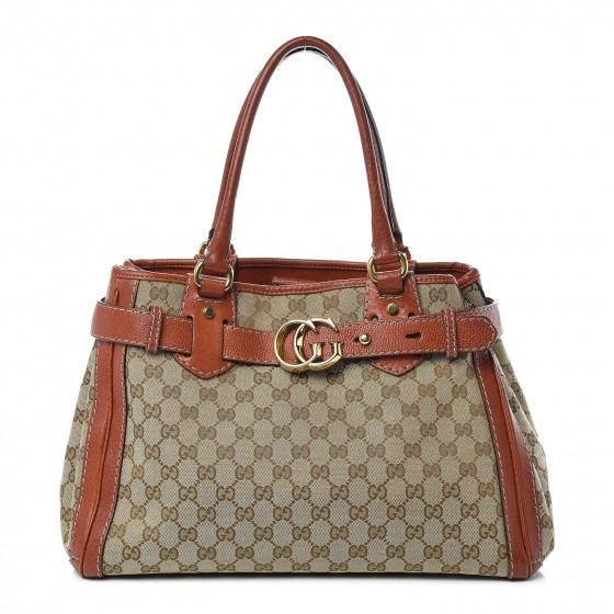 Description: GUCCI Monogram Medium GG Running Tote Orange. crafted of Gucci monogram canvas trimmed with fine orange leather. The bag features rolled leather top handles, a wrap around leather belt and a brass Gucci interlocking GG buckle. This handbag opens to a spacious fabric interior with zipper and patch pockets.