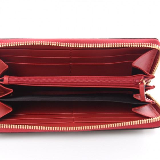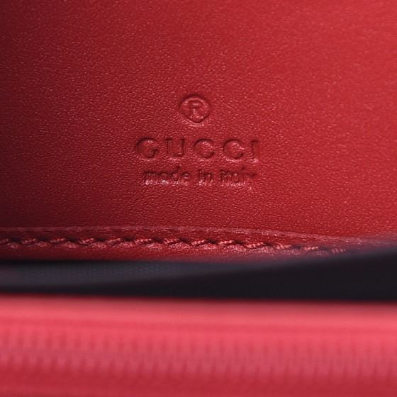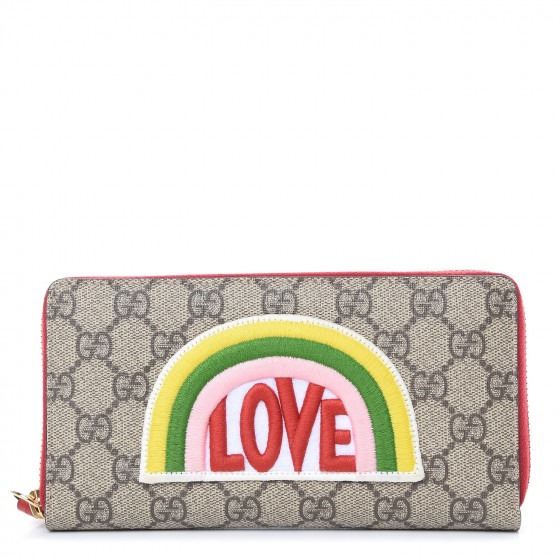 Crafted of Gucci GG canvas with a unique patch of a rainbow with the word "LOVE" underneath. The zipper opens to a red leather and black fabric compartmentalized interior with card slots and a zipper compartment.
