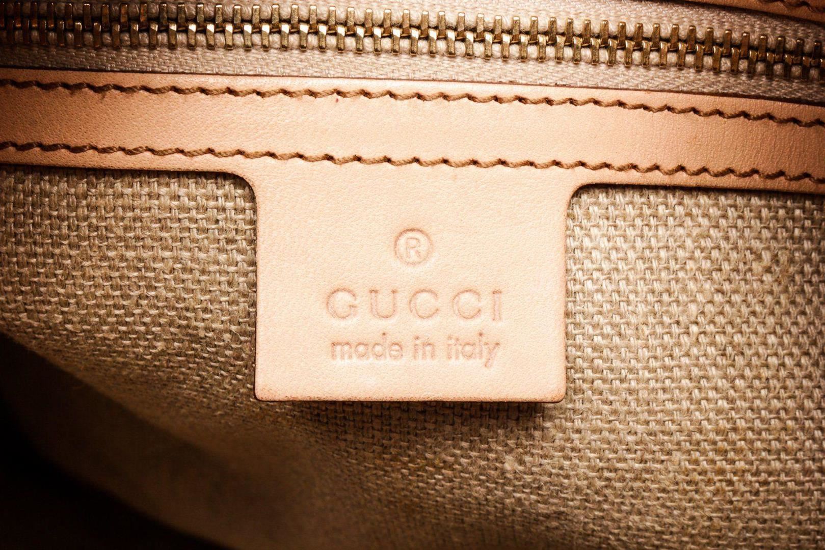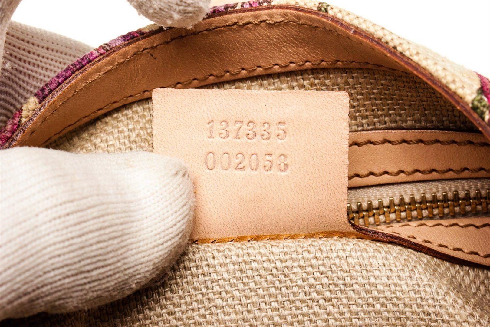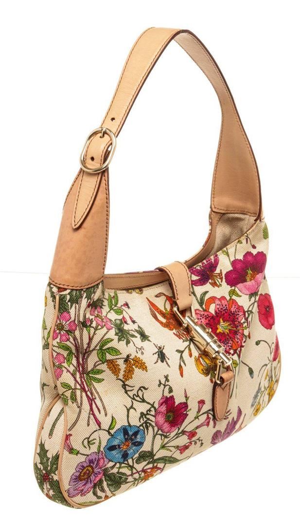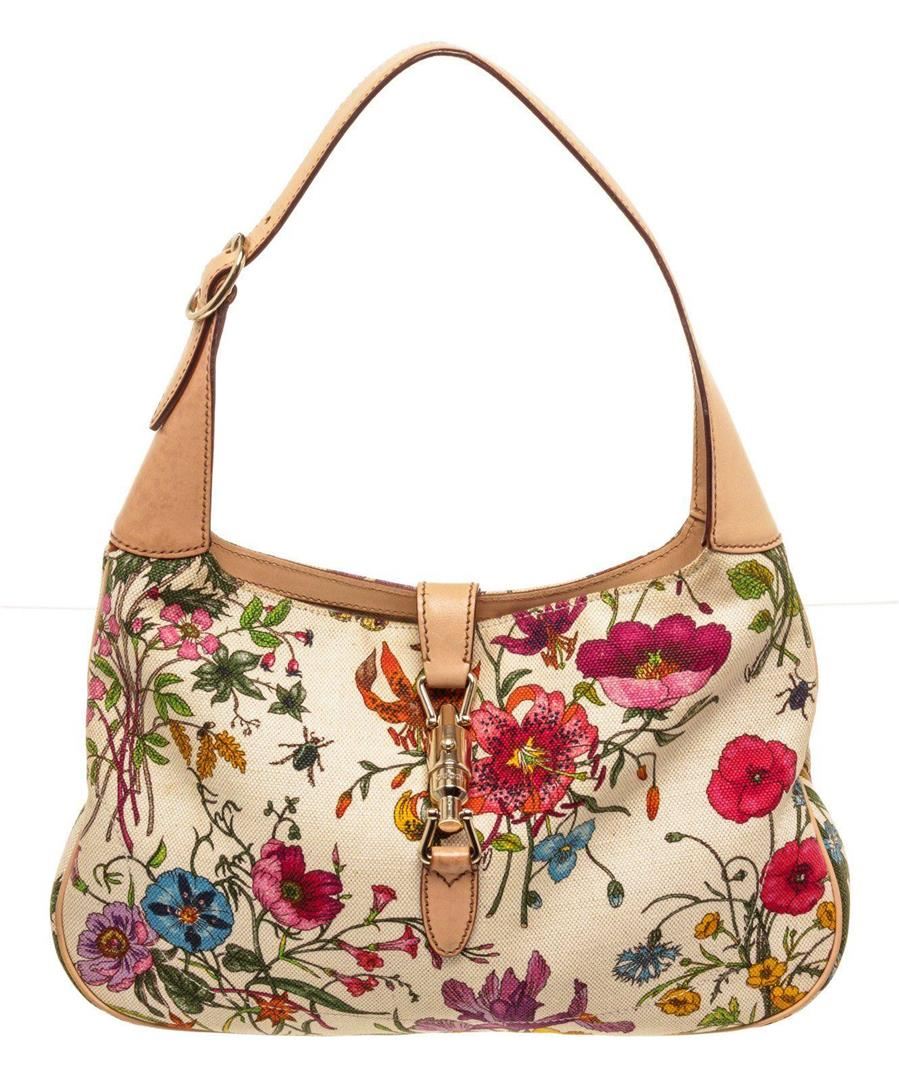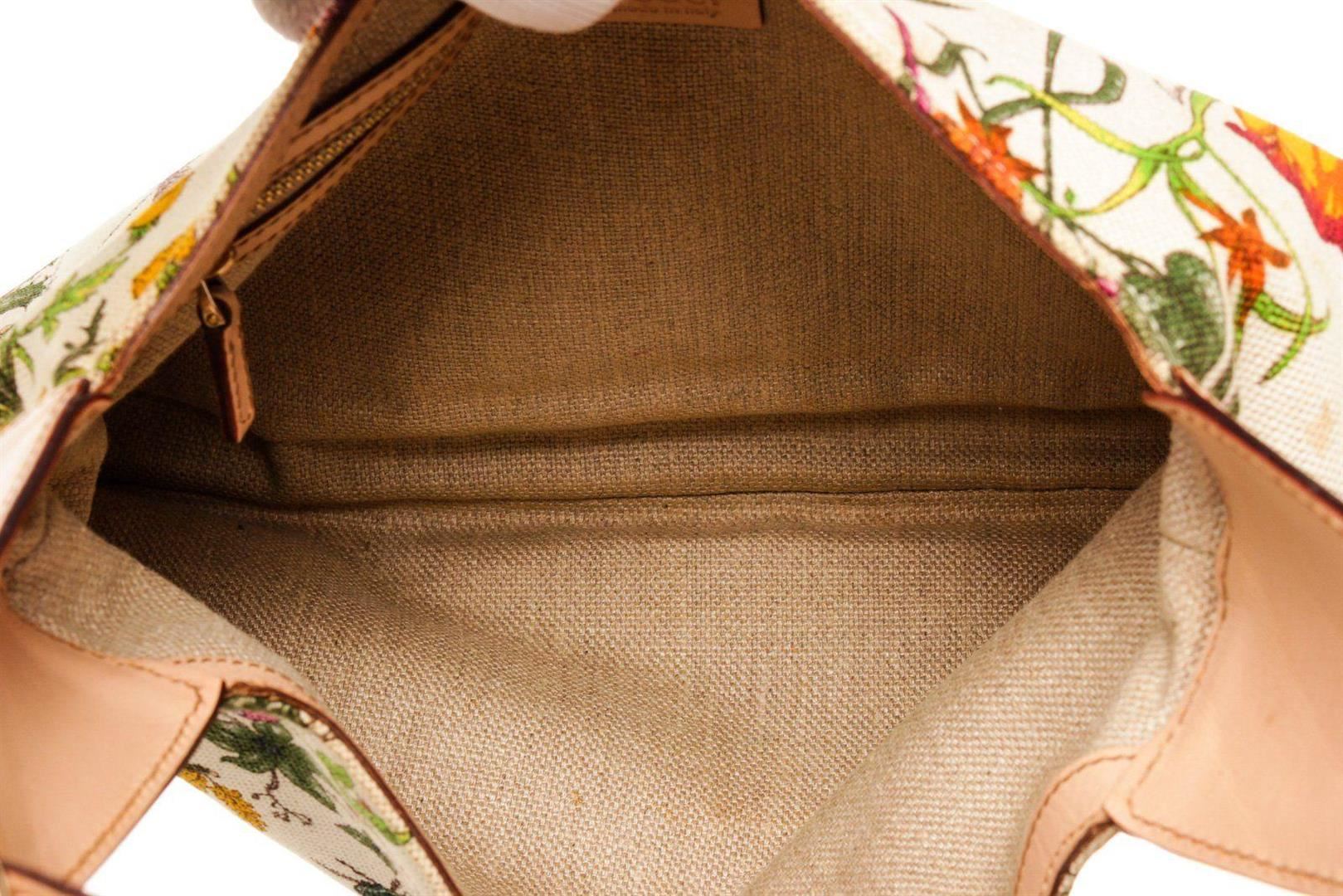 Gucci Multicolor Leather Floral Tote Bag with gold-tone hardware, interior zip pocket, shoulder strap and turn lock closure.