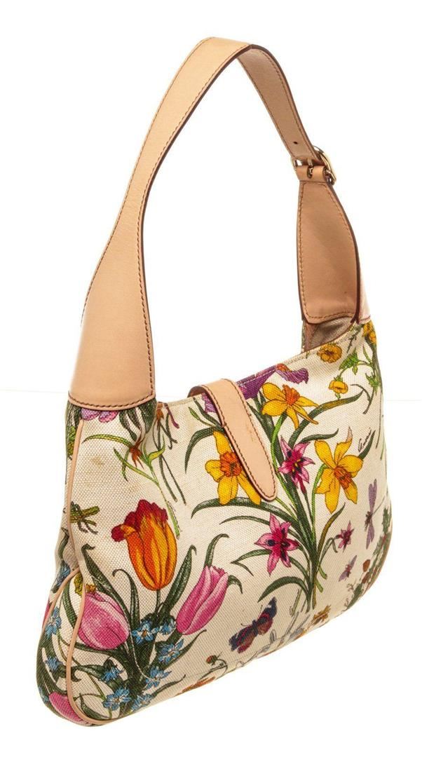 Gucci Multicolor Leather Floral Tote Bag with gold-tone hardware, interior zip pocket, shoulder strap and turn lock closure.