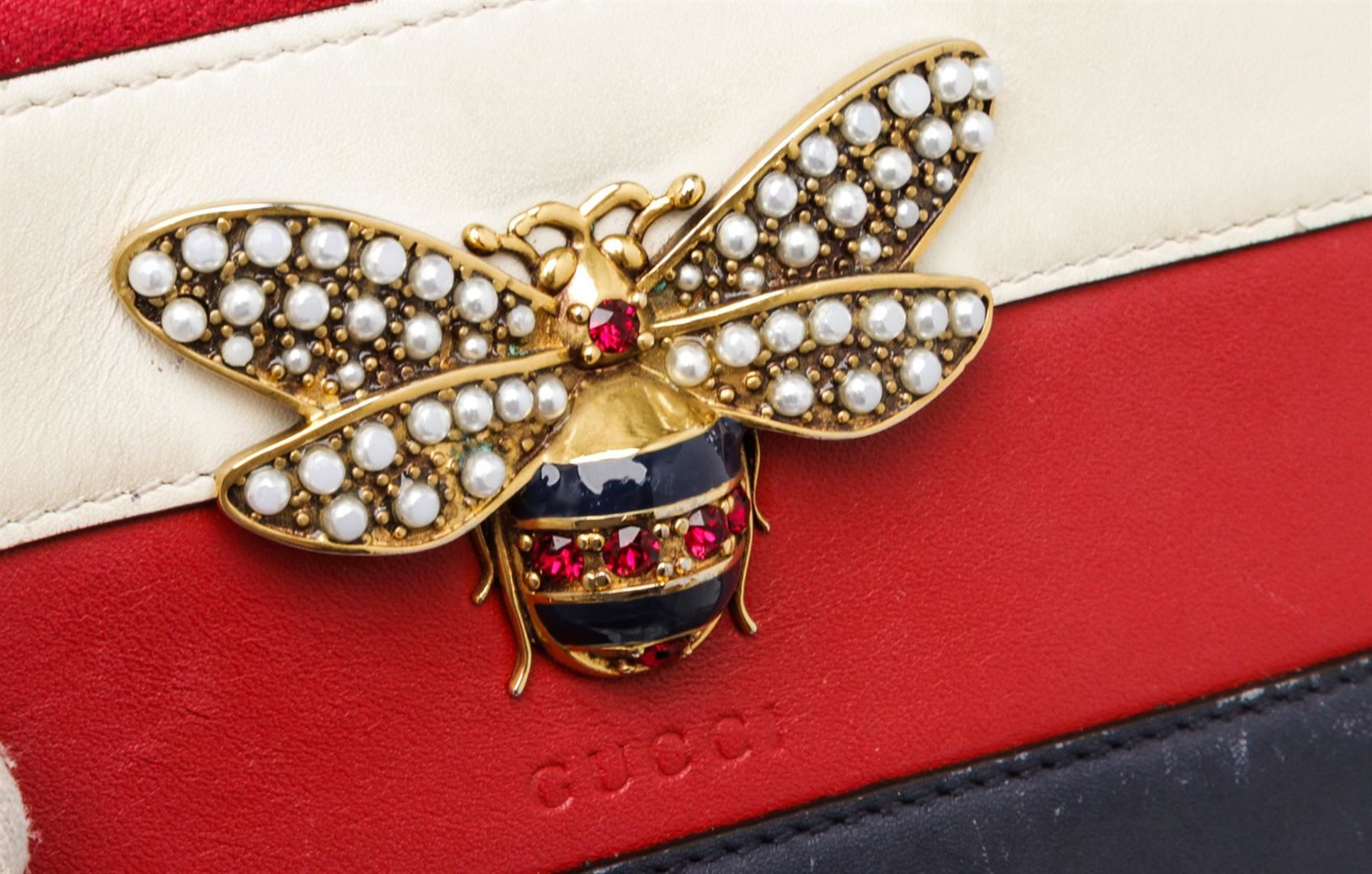 Multicolor Queen Margaret Gucci Bee zip around wallet with gold-tone hardware, red leather interior lining, twelve credit card pockets, four interior compartment one with zip closure and over all zip around closure. Authentic.
