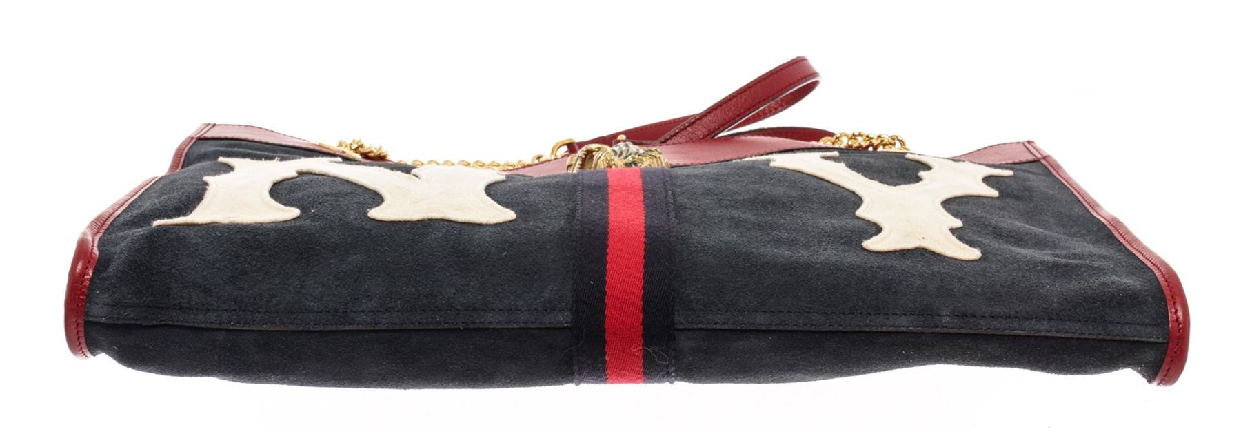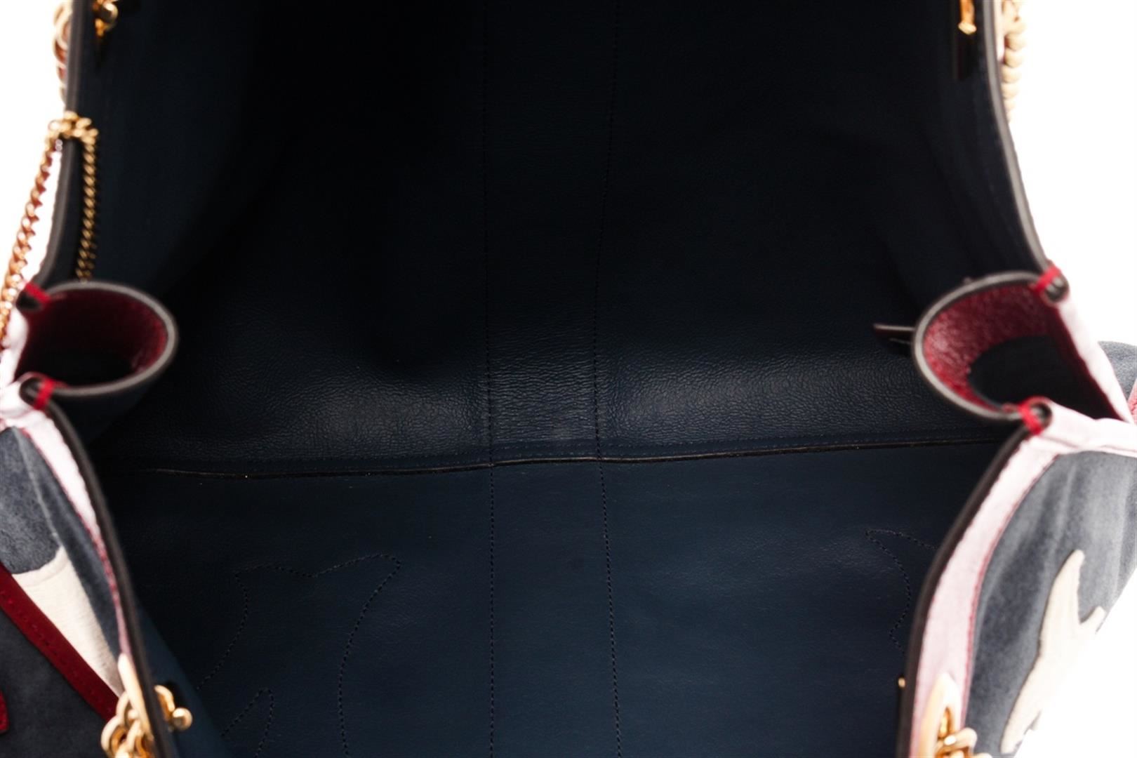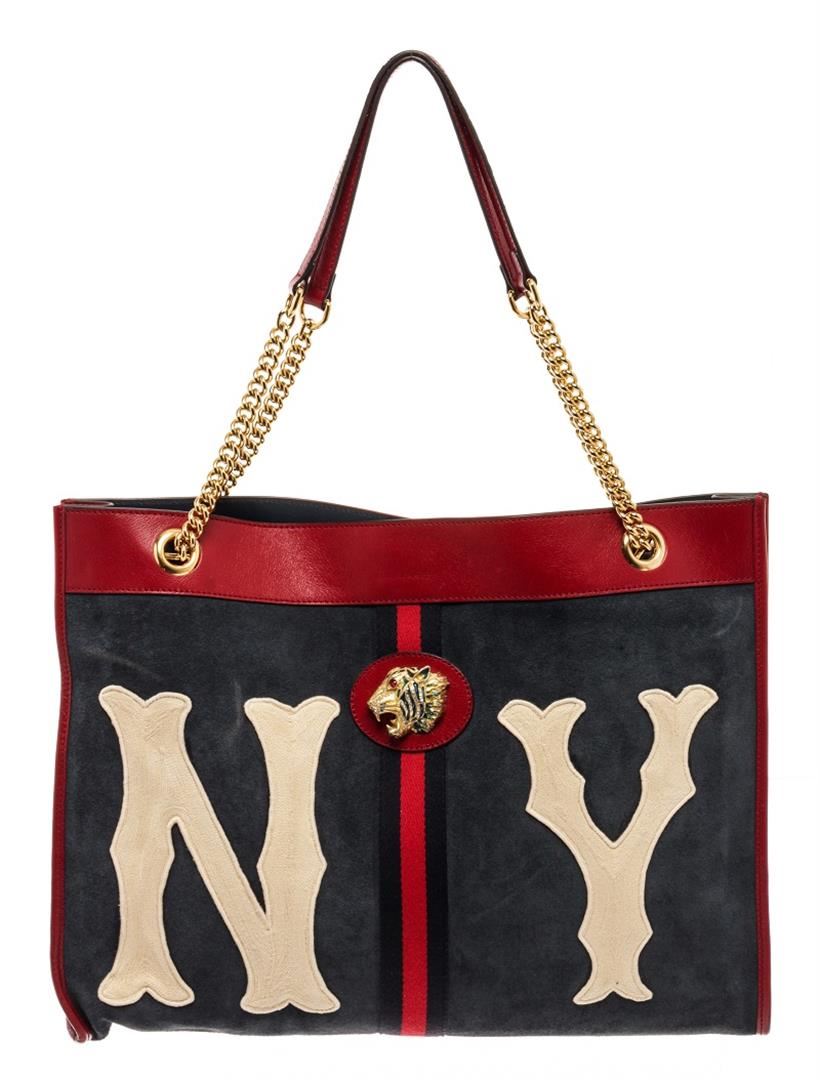 Gucci Navy Red Suede Leather Large NY Yankees Rajah Chain Tote Bag. All available information is listed in the description and shown in the photos. Gucci Navy Red Suede Leather Large NY Yankees Rajah Chain Tote Bag with blue canvas, gold-tone hardware, leather trim, dual shoulder straps, chain-link shoulder straps, leather, embroidered & crystal accents, leather lining, snap closure at top, includes dust bag & interior zip pouch. Height: 14.25" Width: 17.25" Depth: 1.75", Shoulder Strap Drop: 10.25" / 36.19 x 43.81 x 4.44 Cm