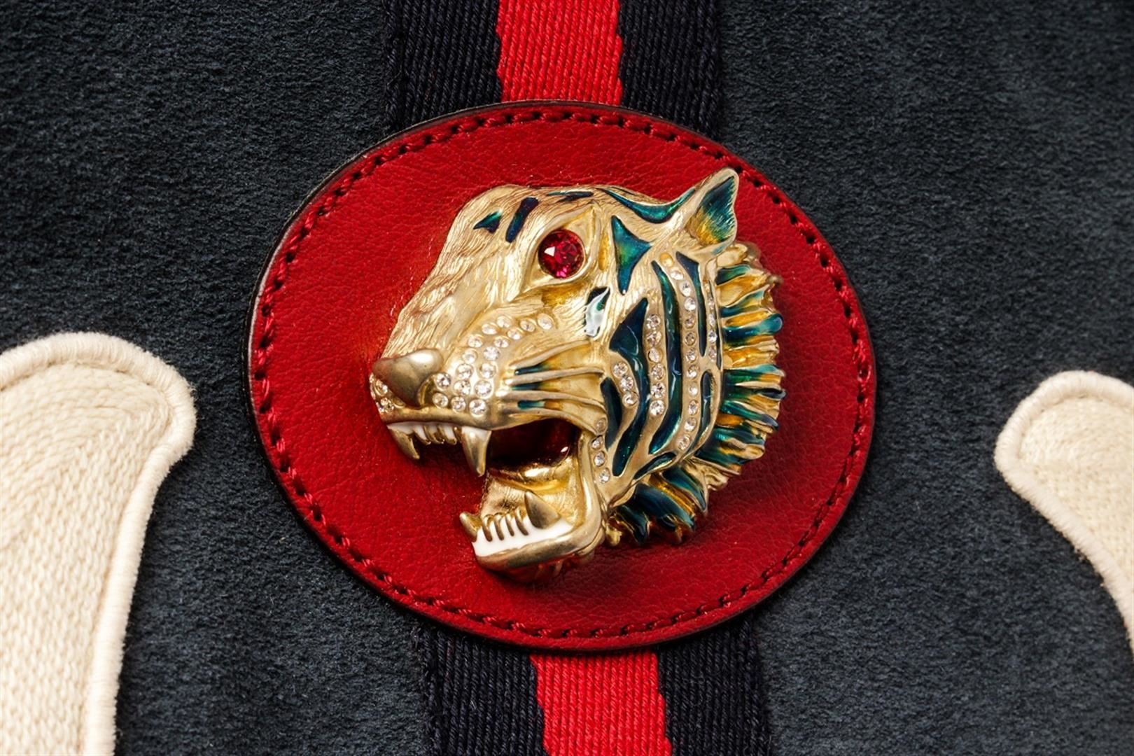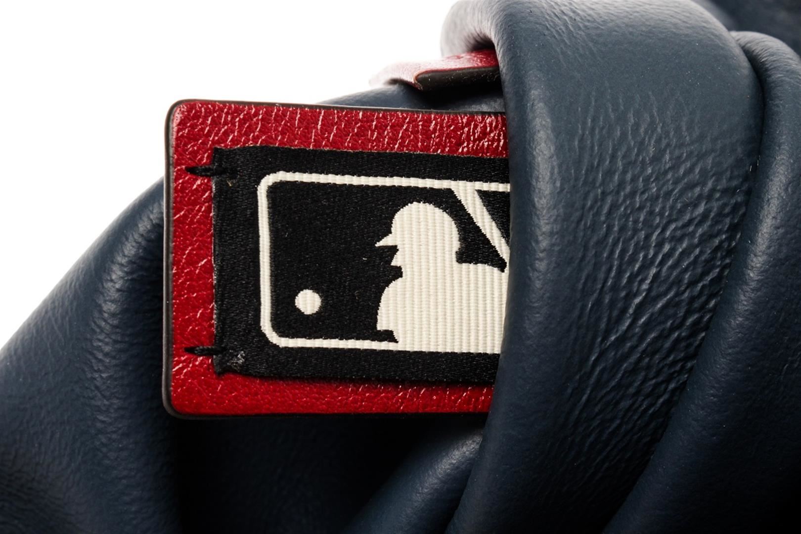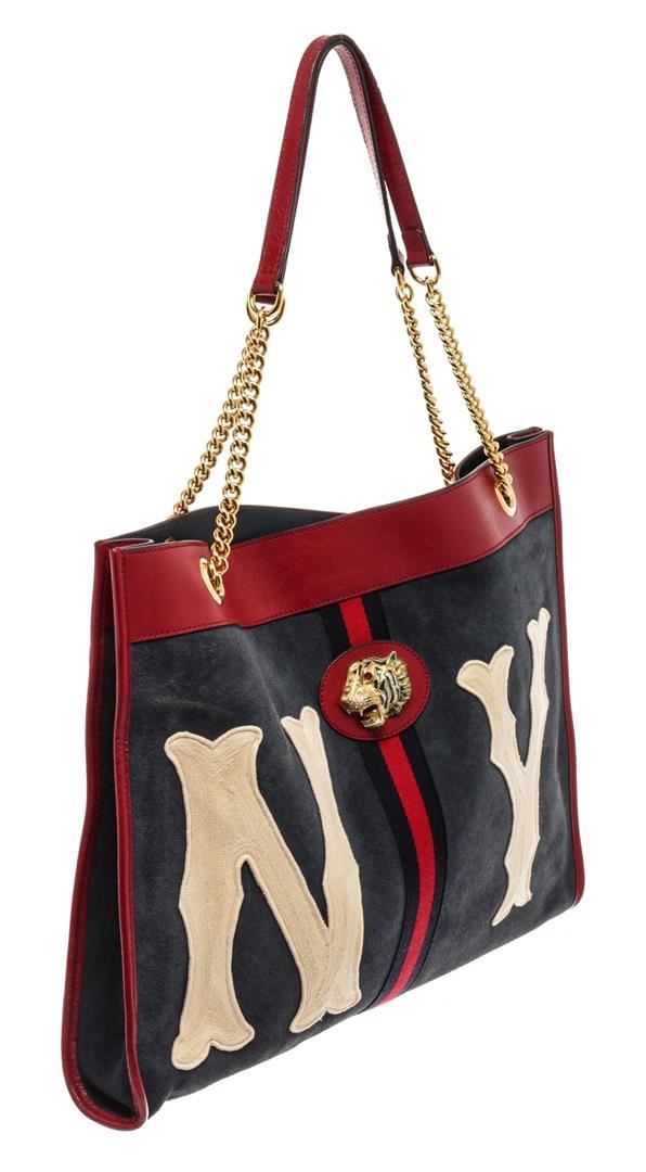 Gucci Navy Red Suede Leather Large NY Yankees Rajah Chain Tote Bag. All available information is listed in the description and shown in the photos. Gucci Navy Red Suede Leather Large NY Yankees Rajah Chain Tote Bag with blue canvas, gold-tone hardware, leather trim, dual shoulder straps, chain-link shoulder straps, leather, embroidered & crystal accents, leather lining, snap closure at top, includes dust bag & interior zip pouch. Height: 14.25" Width: 17.25" Depth: 1.75", Shoulder Strap Drop: 10.25" / 36.19 x 43.81 x 4.44 Cm