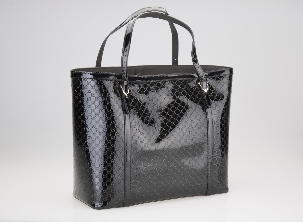 This beautiful tote features black microguccissima glossy patent leather, light gold hardware, natural cotton linen lining, double handles with 7" drop, interior zip and smart phone pockets, inside hook closure, and small spur details with equestrian inspired numbered holes on the handles. Made in Italy.
