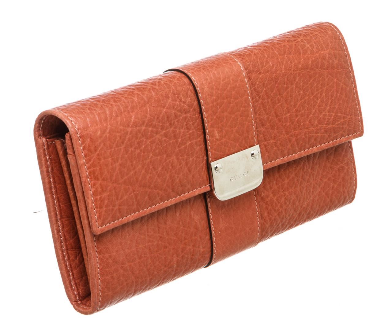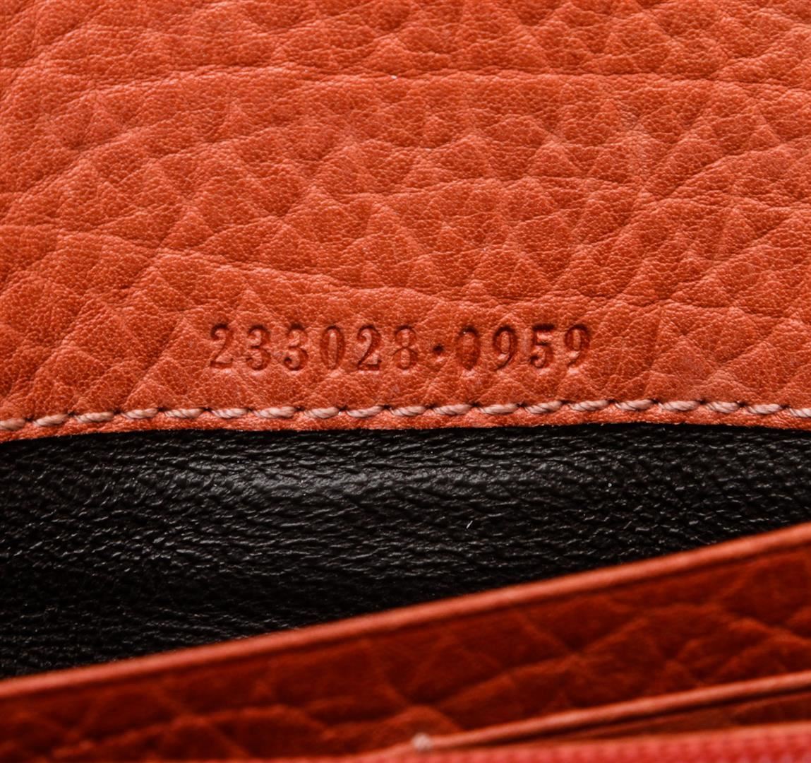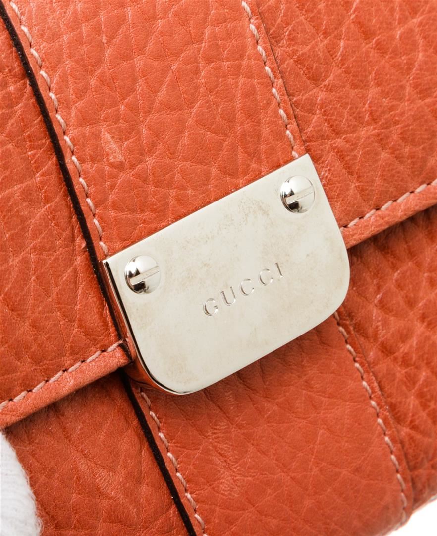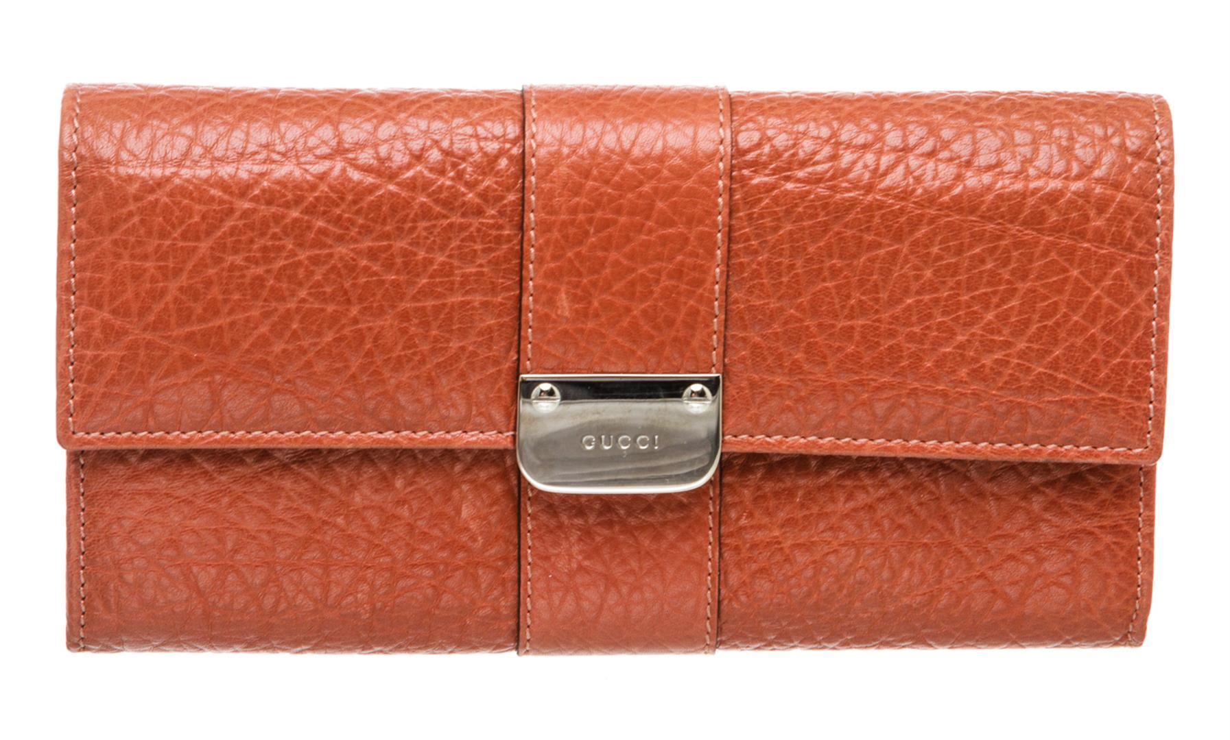 One Gucci Orange Leather Long Wallet. Orange leather Gucci long wallet with silver-tone logo snap closure, twelve bill slots, two bill compartments at front and back of wallet and zippered coin holder. MKR