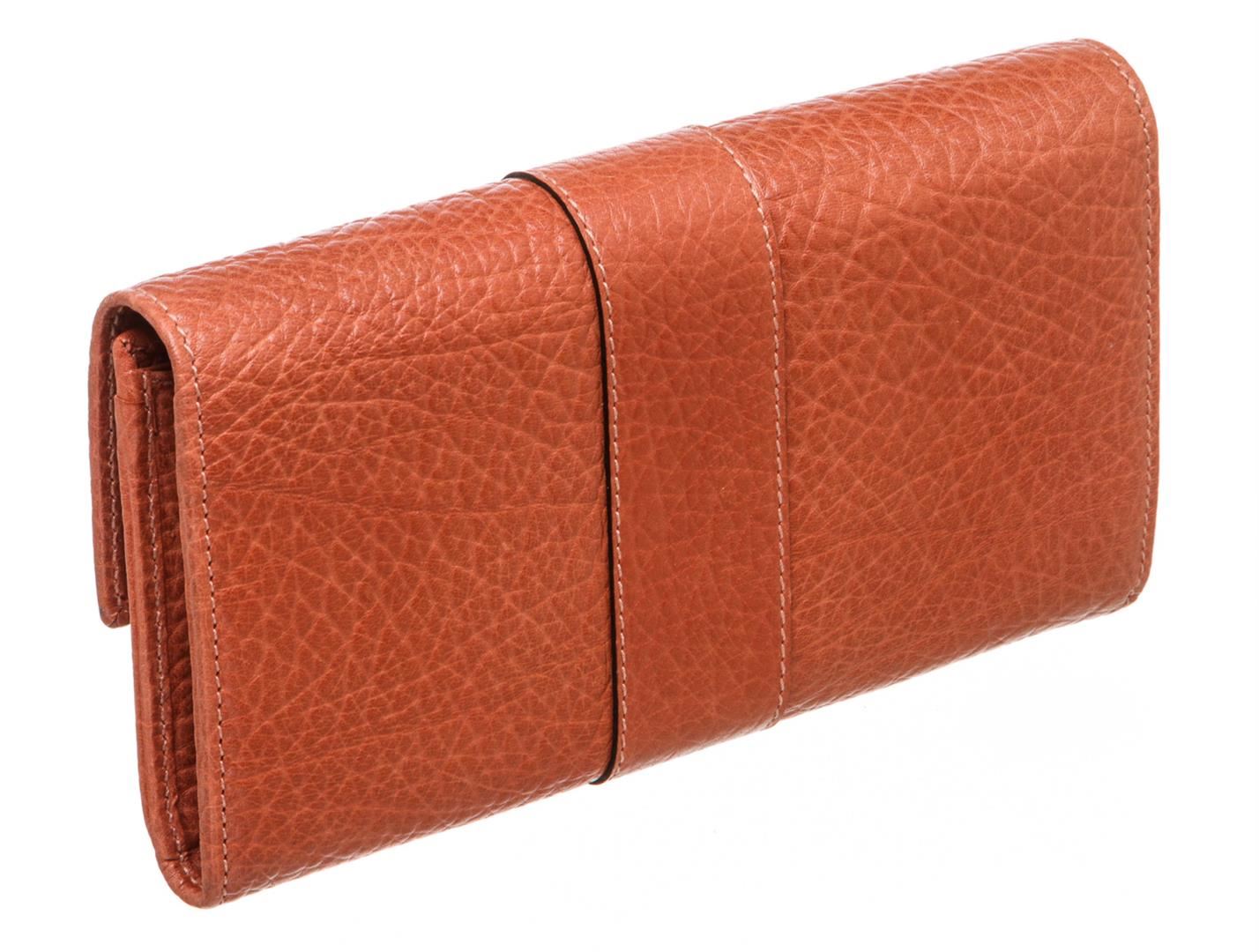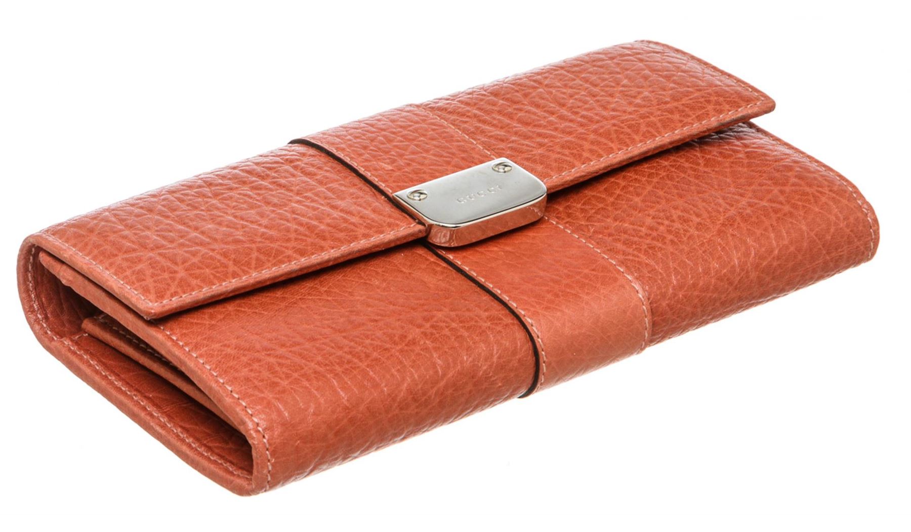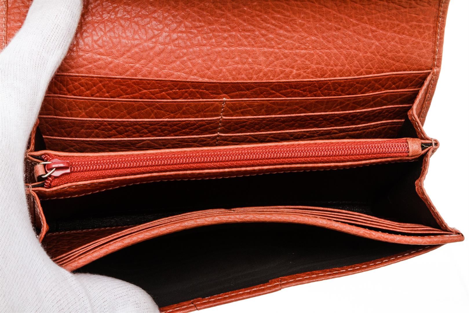 One Gucci Orange Leather Long Wallet. Orange leather Gucci long wallet with silver-tone logo snap closure, twelve bill slots, two bill compartments at front and back of wallet and zippered coin holder. MKR
