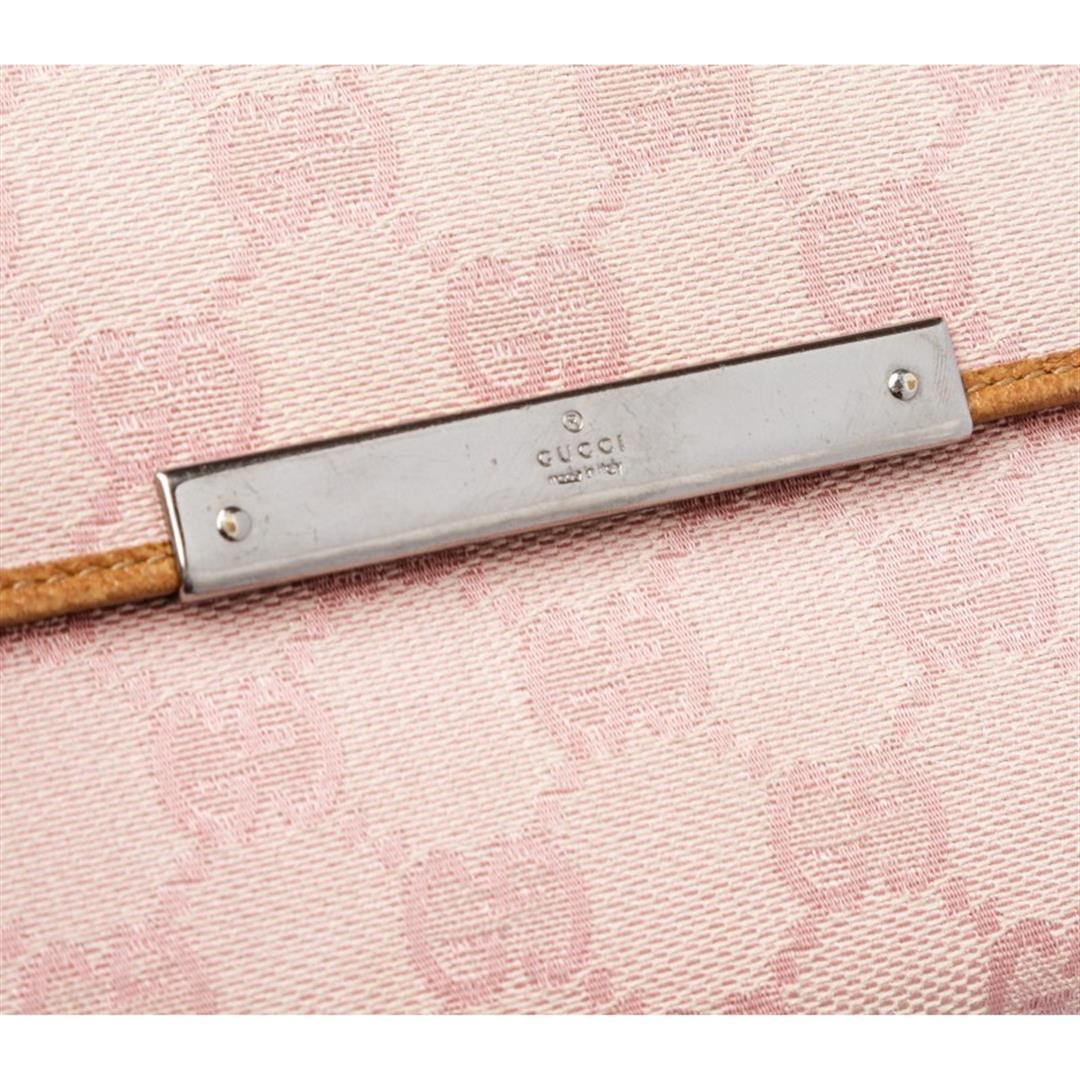One Gucci Pink Beige Canvas Leather Monogram Long Wallet. Overall push button closure. Interior contains seven credit cardip pockets, two bilfold pockets and two open compartments. Exterior contains compartment with push button closure. Item is pre-owned.
