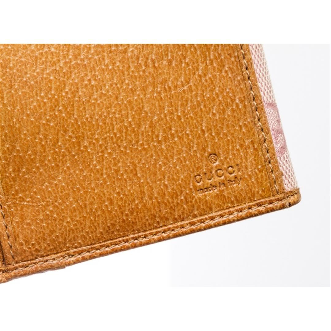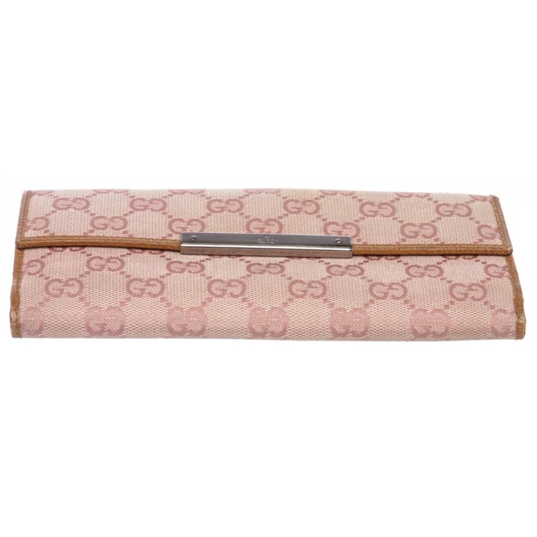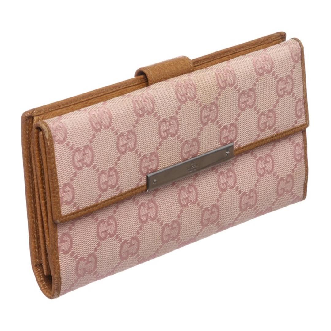 One Gucci Pink Beige Canvas Leather Monogram Long Wallet. Overall push button closure. Interior contains seven credit cardip pockets, two bilfold pockets and two open compartments. Exterior contains compartment with push button closure. Item is pre-owned.