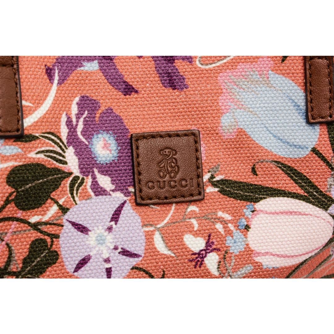 Gucci pink green purple floral canvas Tote bag with brown leather details, beige canvas lining, slit pocket at interior wall.