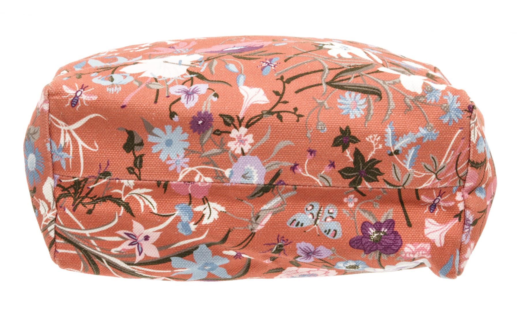 Gucci pink green purple floral canvas Tote bag with brown leather details, beige canvas lining, slit pocket at interior wall.