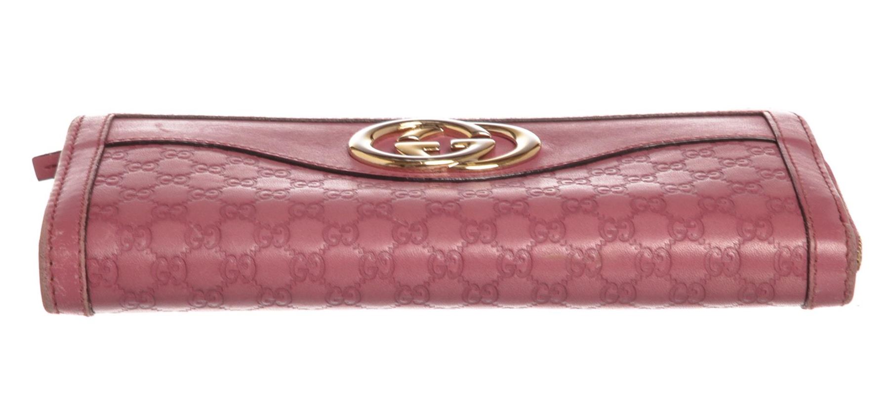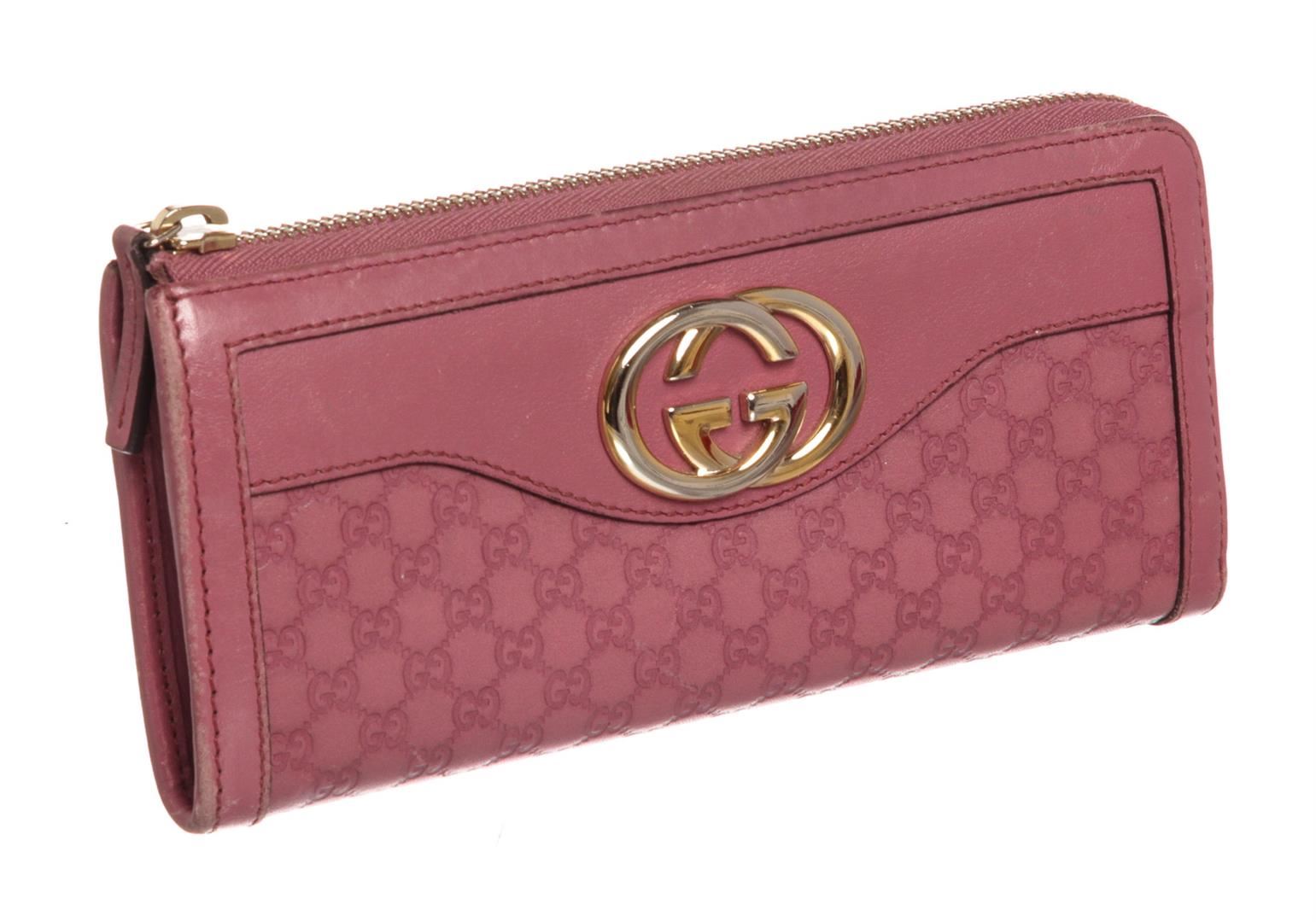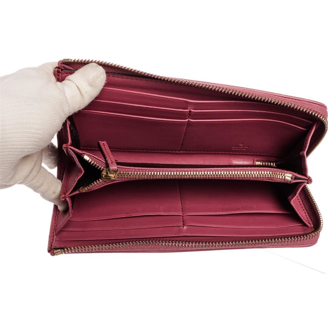 Pink leather Gucci wallet with gold-tone hardware, tonal leather interior, dual interior compartments; one with zip closure, dual bill compartments, multiple card slots and zip-around closure at top. Authentic.