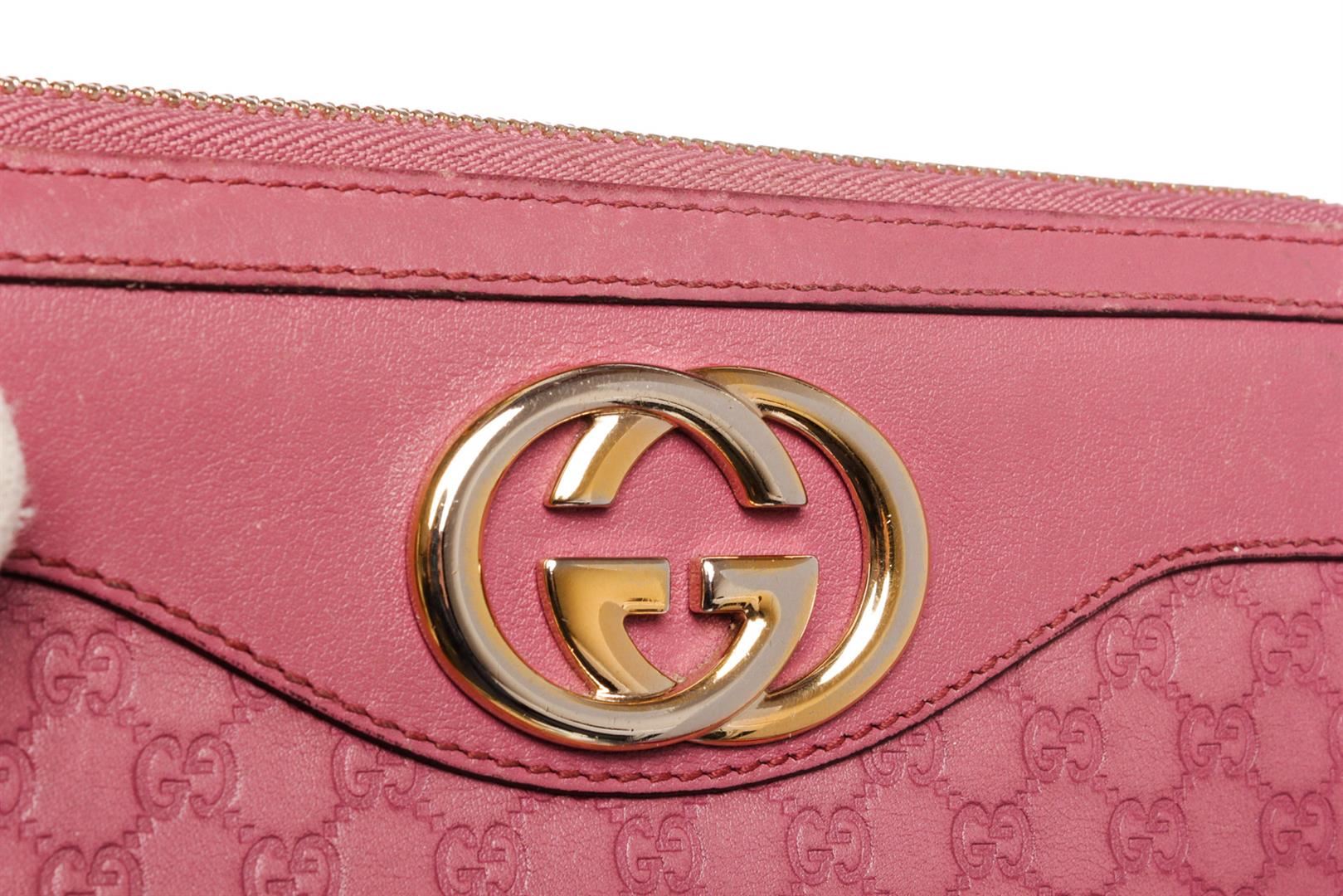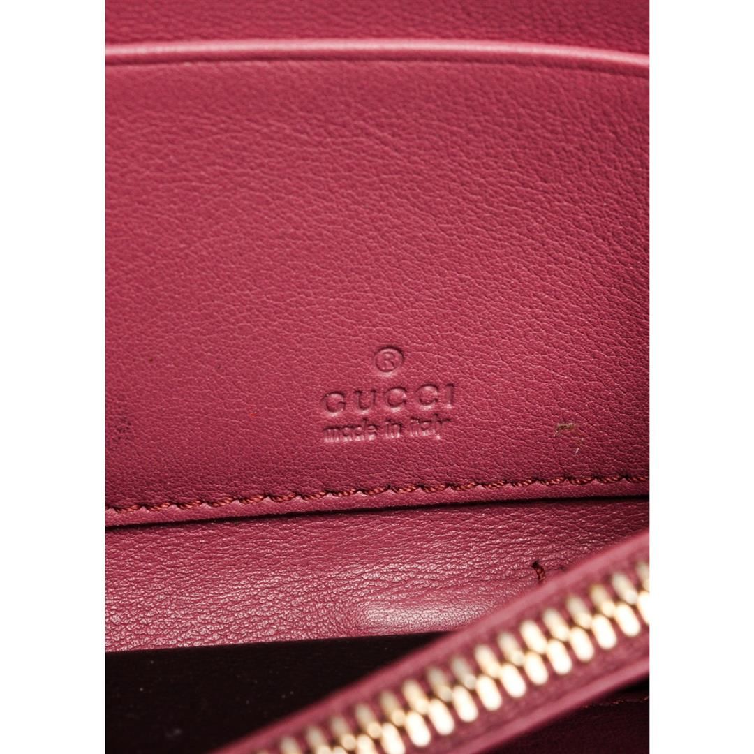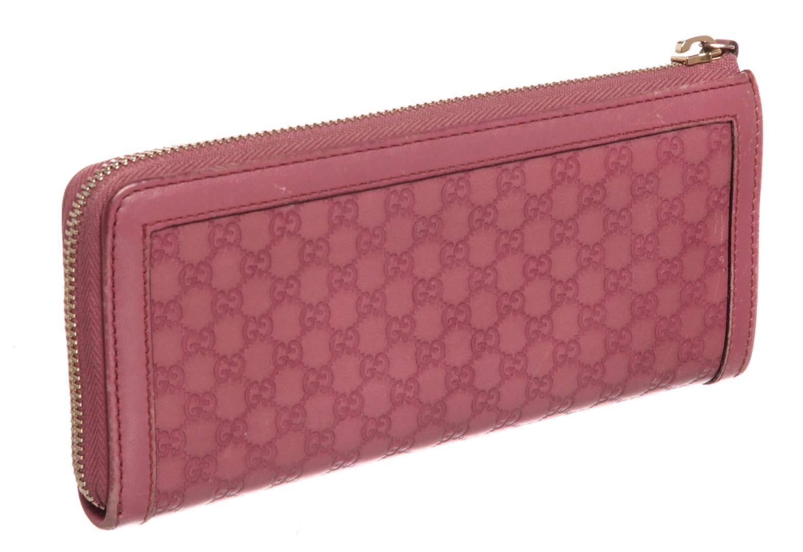 Pink leather Gucci wallet with gold-tone hardware, tonal leather interior, dual interior compartments; one with zip closure, dual bill compartments, multiple card slots and zip-around closure at top. Authentic.