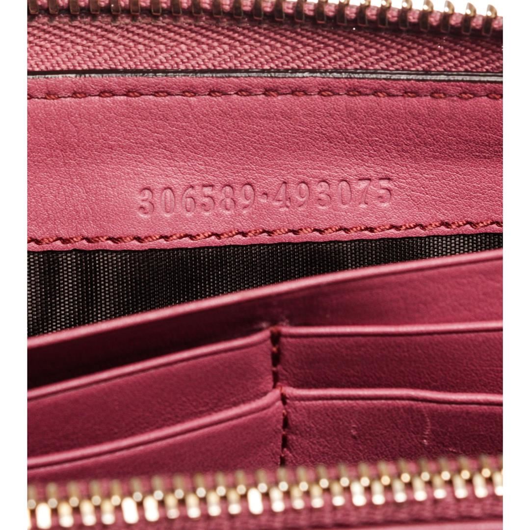 Pink leather Gucci wallet with gold-tone hardware, tonal leather interior, dual interior compartments; one with zip closure, dual bill compartments, multiple card slots and zip-around closure at top. Authentic.