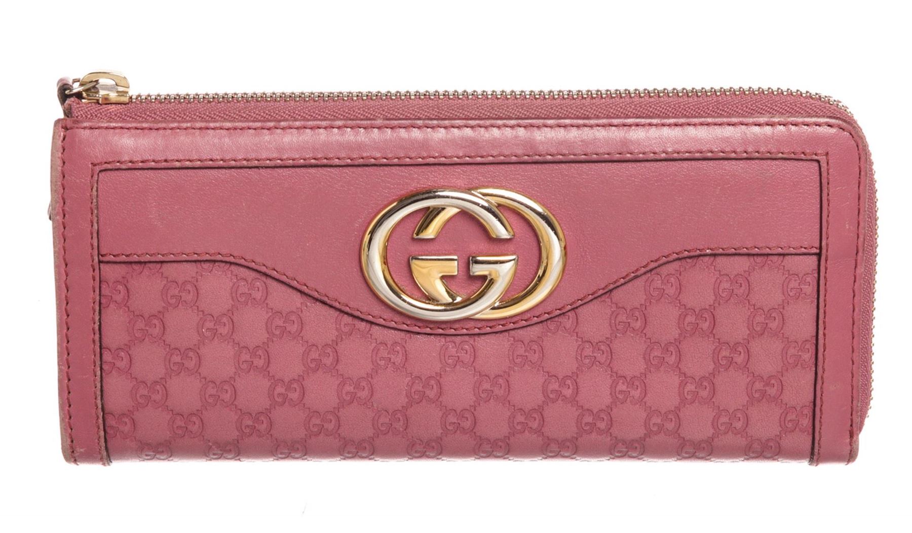Pink leather Gucci wallet with gold-tone hardware, tonal leather interior, dual interior compartments; one with zip closure, dual bill compartments, multiple card slots and zip-around closure at top. Authentic.