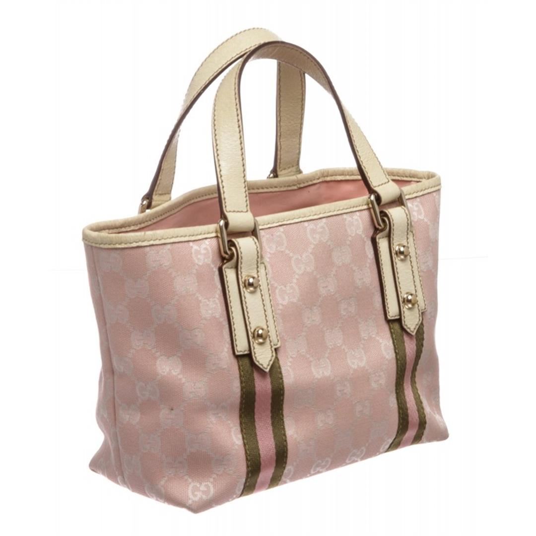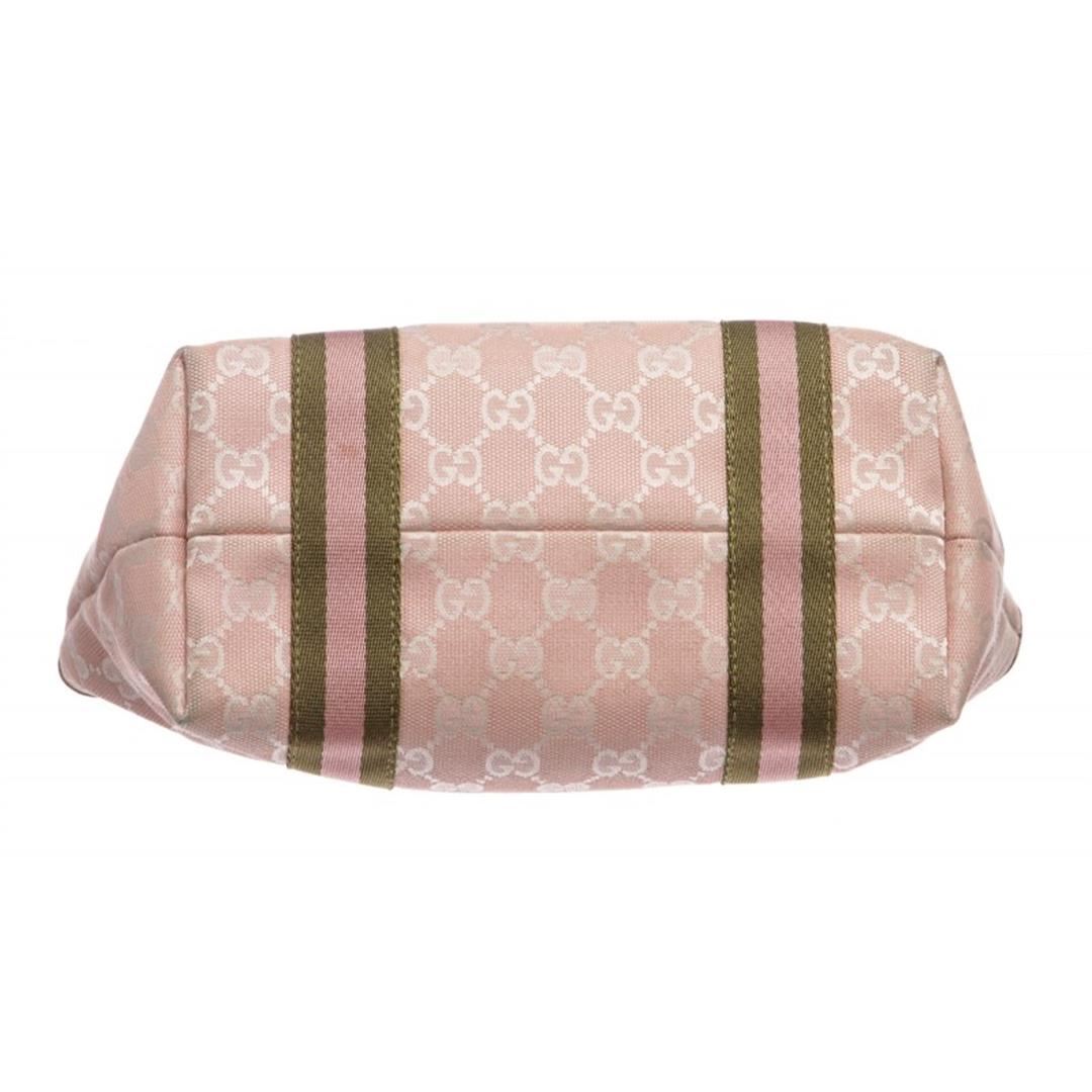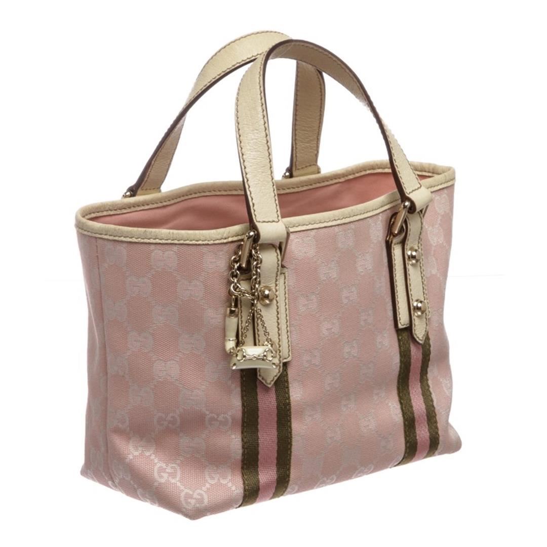 Pink and white canvas Gucci Small Jolicoeur tote with gold-tone hardware, dual flat top handles with bag charm detail, leather trim, Gucci Web trim at exterior, pink woven lining, dual pockets at interior walls; one with zip closure and open at top.